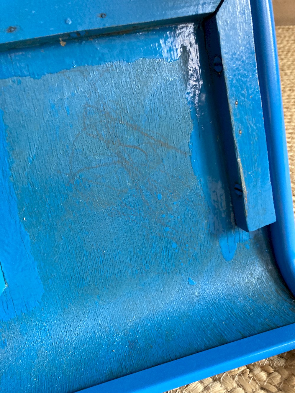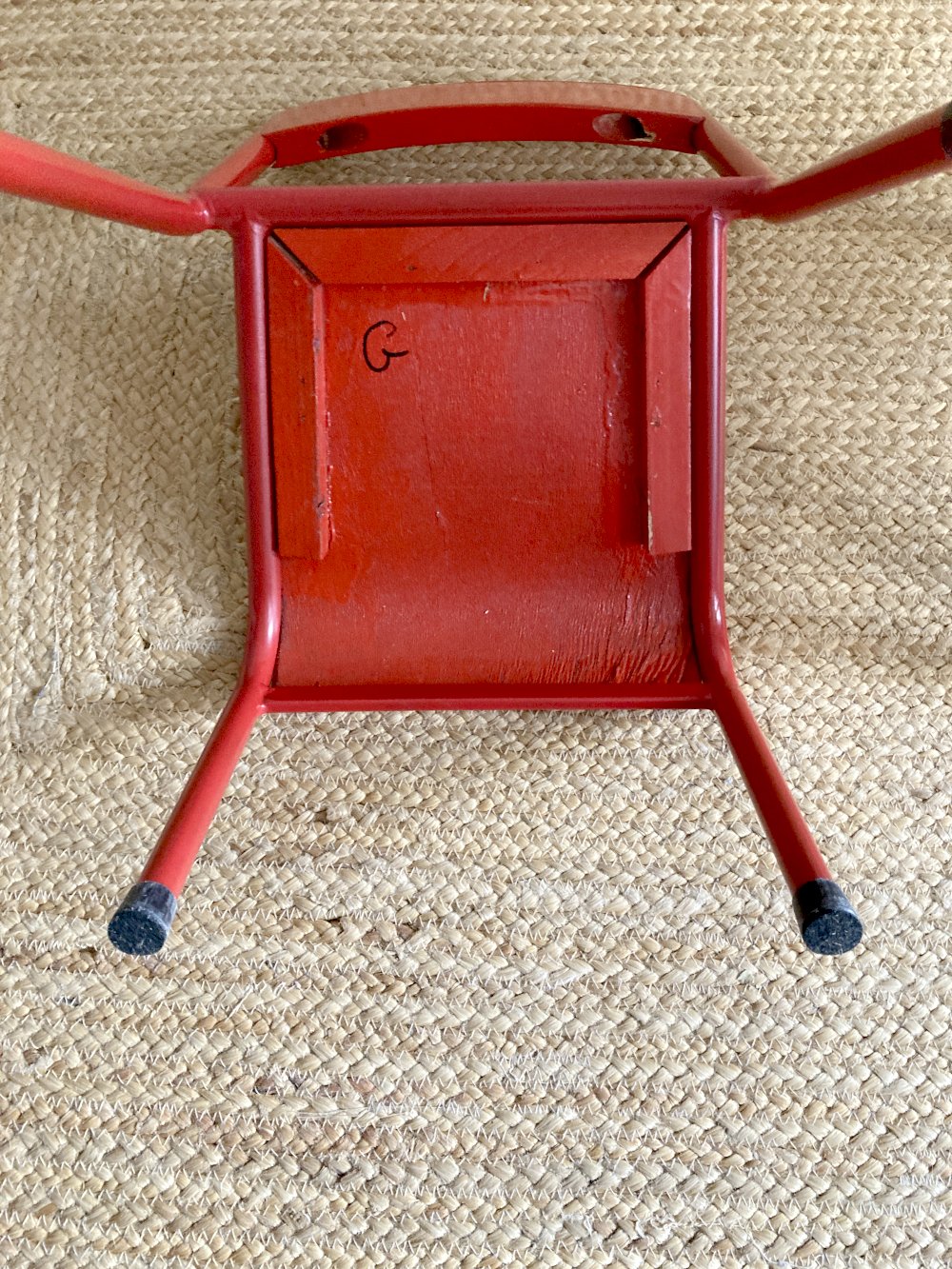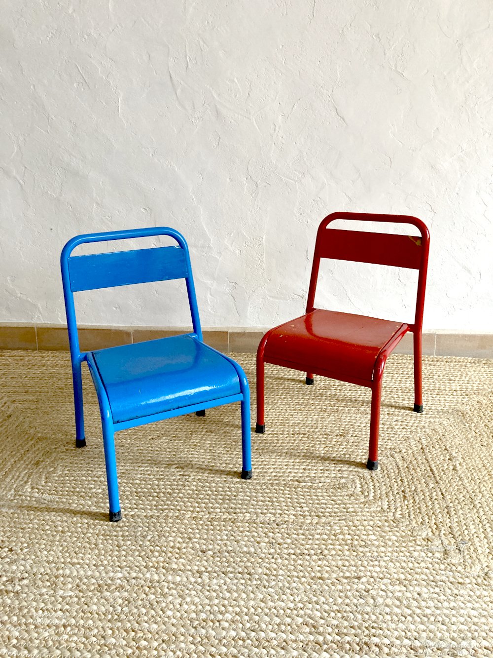Adorable little Mullca chairs for kindergarten children, one red and the other blue. Dating from the 1950s, these chairs are a true time palimpsest. Originally painted in metallic green and raw wood, they have since been repainted in red and blue, including the seat and backrest. We are offering them here restored from their paint on the metal structure, and as is for the wooden elements. Usage, traces of time, bumps, felt, paint chips... are the moving testament to the countless children who spent time in nursery classes during the second half of the 20th century.