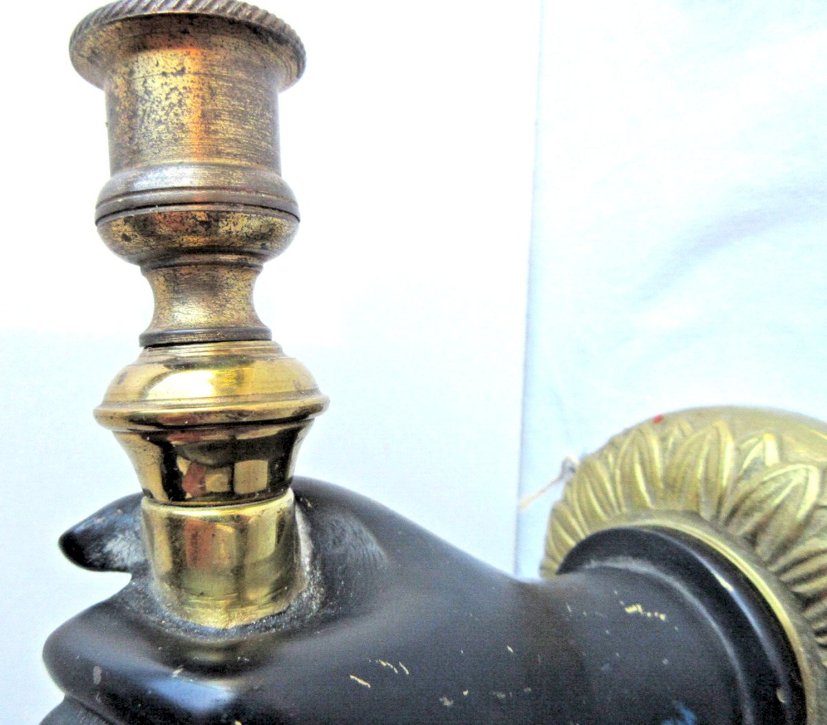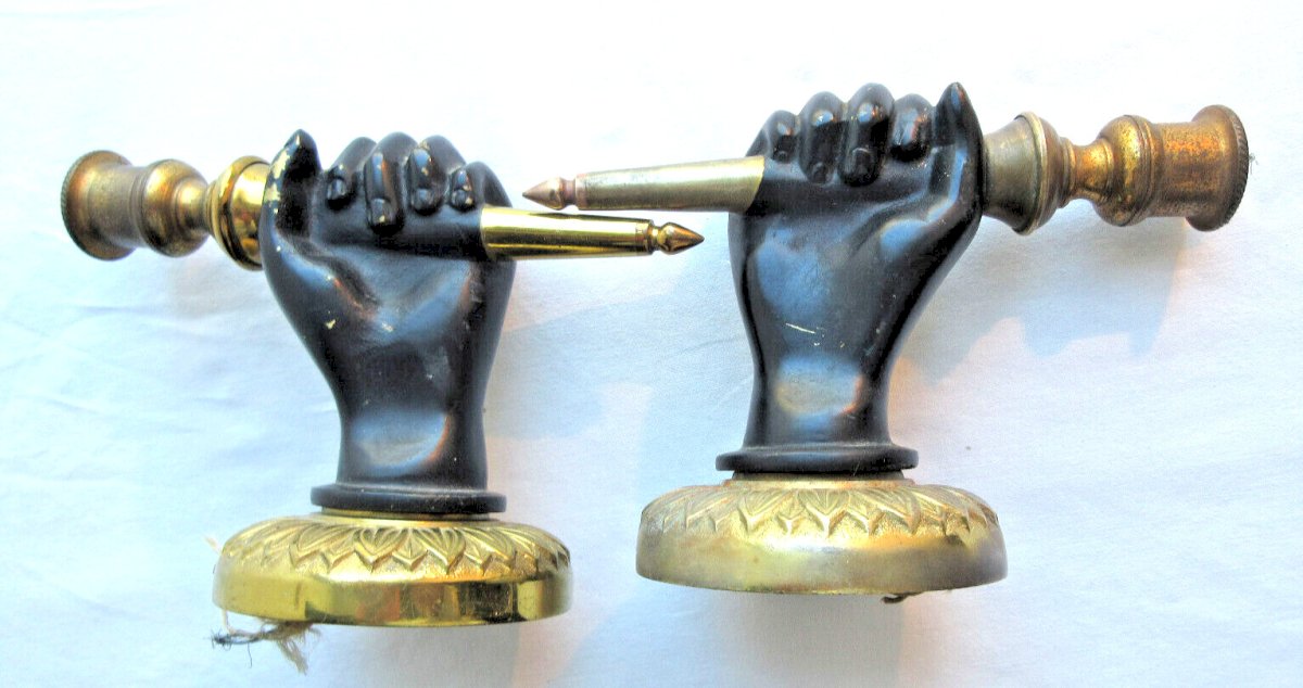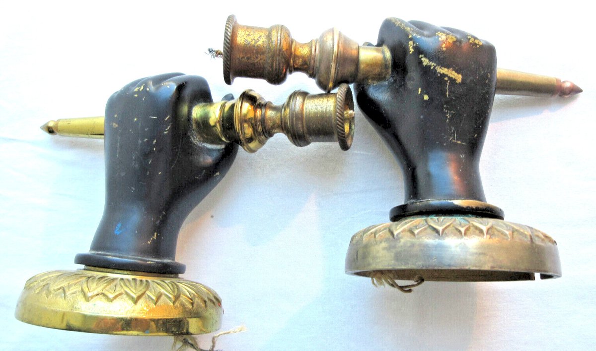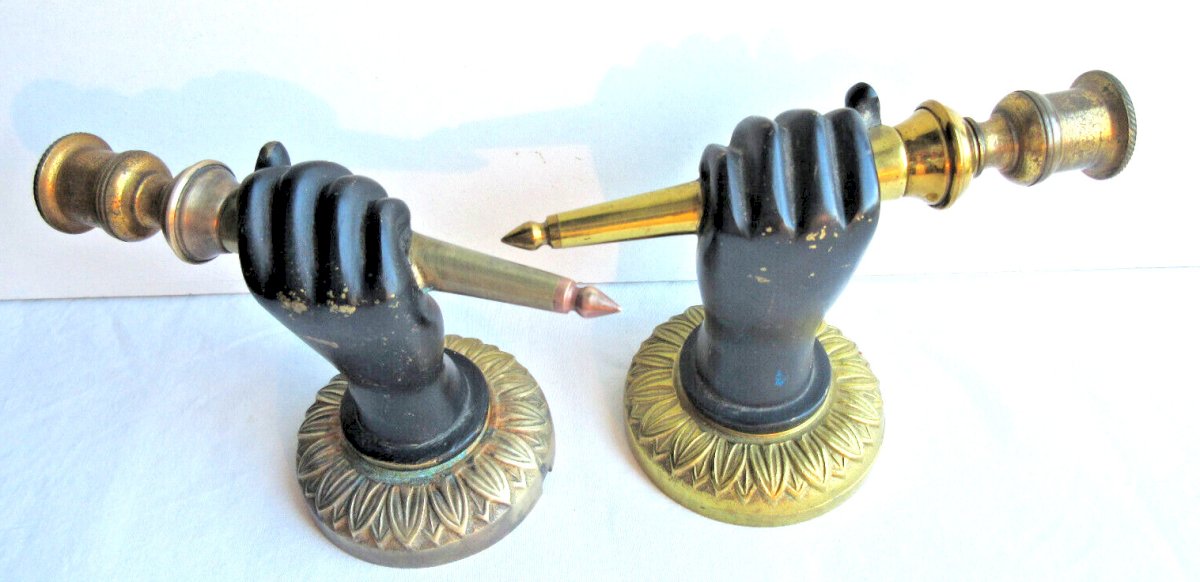 Worldwide sale. Napoleon III sconces. Gorgeous antique bronze wall sconces featuring a black hand holding a torch. They are electrified but the electrification needs to be brought up to standard. Diameter of the wall part: 8.5 cm. Height: 16 cm. Length of the hand: 12 cm. In good used condition, they are not new. Beautiful original sconces to collect. The photos complement the description. Country of origin: France Type: Sconce Period: 19th Century and earlier Subtype: Interior Dominant color: Black Material: Bronze Style: Napoleon III Type of lighting: Standard Features: Bayonet Maximum power (Watts): 75