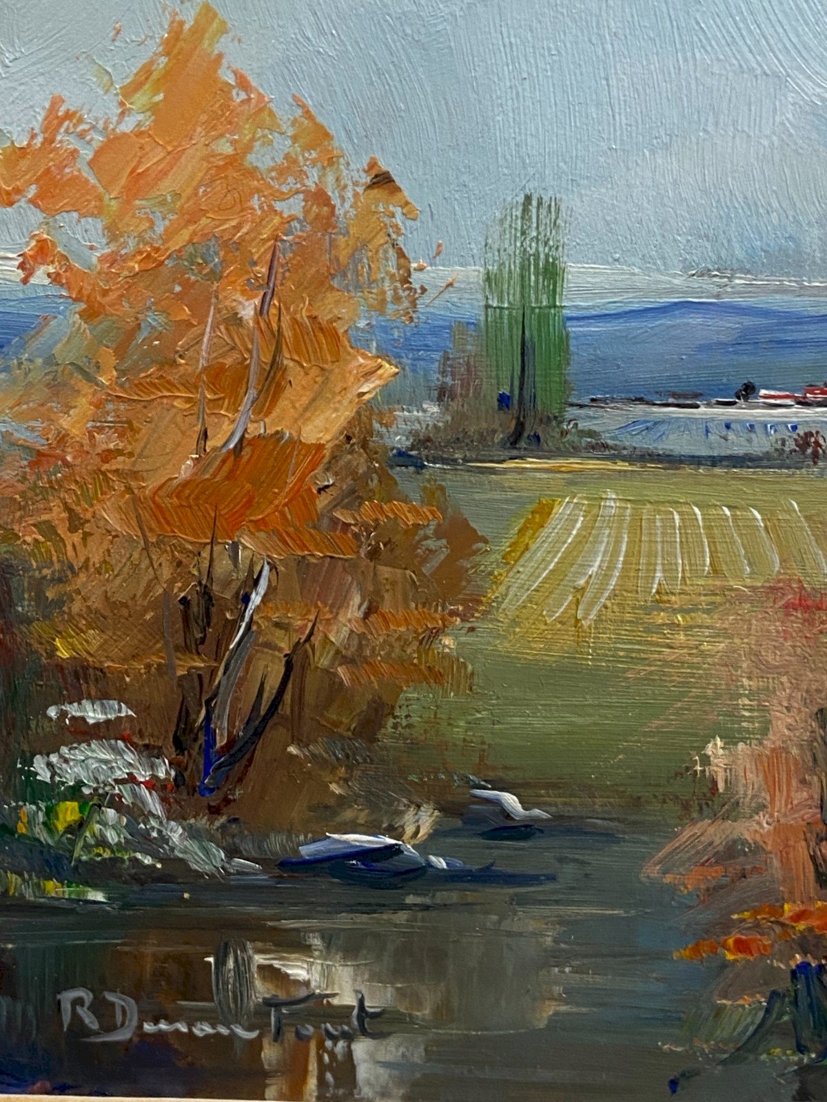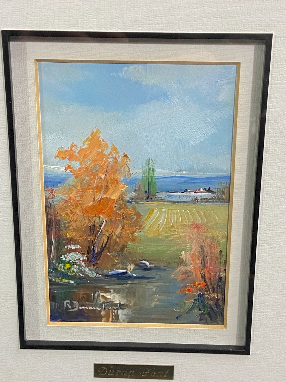 Charming pair of oil-painted landscapes with a knife in light and bright tones. Each composition depicts a sunlit countryside, bordered by golden trees with autumn foliage and cultivated fields stretching towards a blue horizon. The brushwork is vivid, fluid, and spontaneous, conveying the freshness and lightness characteristic of Duran-Font's decorative style. Spanish schools signed Ramon Duran-Font Maximum dimensions with frame: 40.2 x 35.3 cm / viewable dimensions only 15.5 x 10.5 cm Total weight: 2748 grams Possibility to form a suite of 4 paintings with a second pair currently for sale in my shop. Works in very good condition I will only mention small marks around the frames and other minor smudges Very careful shipping worldwide Type: Oil Country of origin: Spain Features: On panel Theme: Landscape