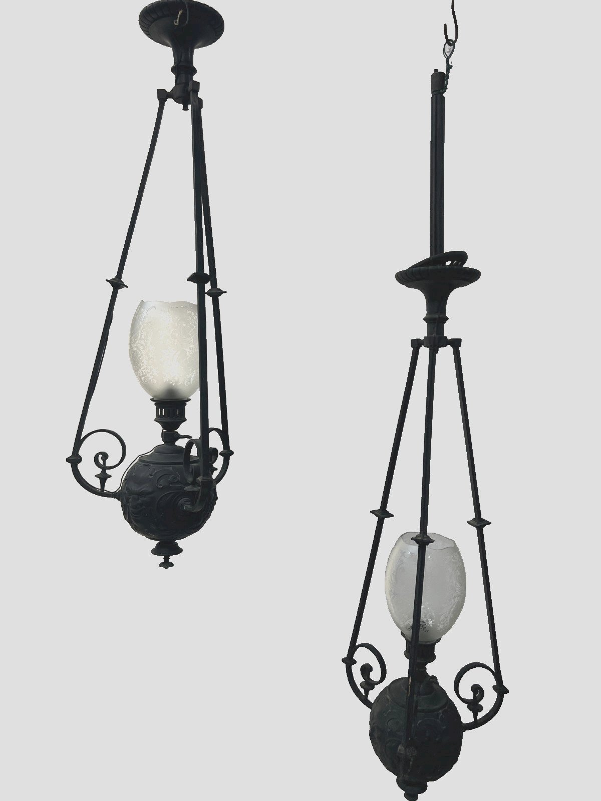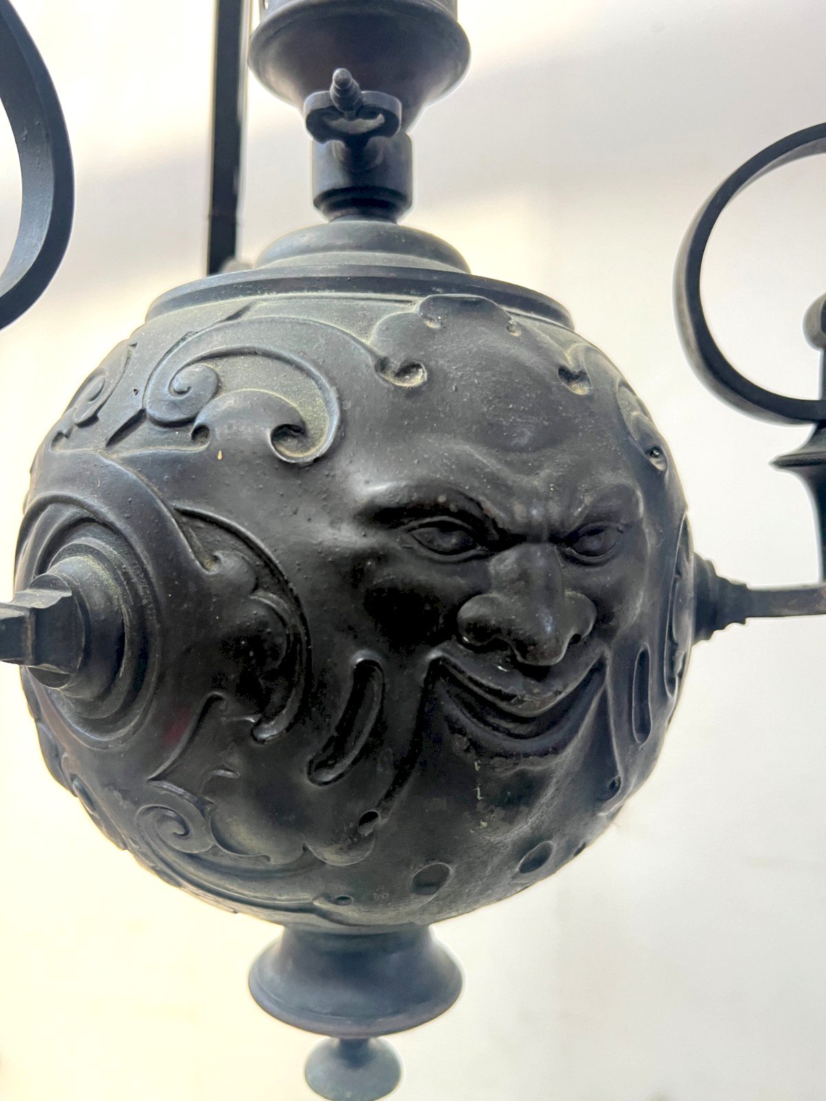 A pair of 19th-century patinated bronze chandeliers in the shape of a ball, decorated with masks. Central lighting with a cut glass tulip. Formerly gas-lit. Height 108 cm, Width 33 cm, Depth 33 cm. Period: 19th century. Type: Suspension, Chandelier. Period: 19th century and earlier. Height: 108. Material: Bronze. Length: 33. Width: 33.