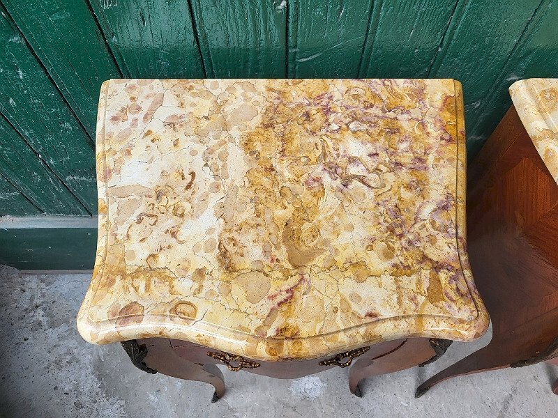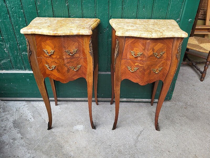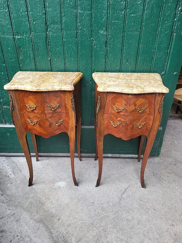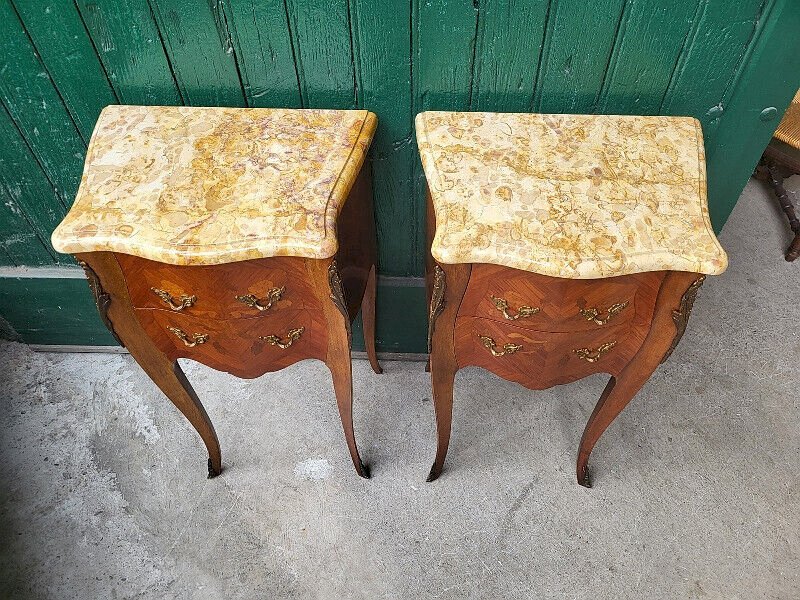 Beautiful pair of rosewood bedside tables with marble top. They are in very good condition, with just a few slight signs of use, all of which are visible in the photos. They measure 44.5 cm wide, 76.5 cm high, and 32.5 cm deep. I am at your disposal for any questions, either by email or by phone: . For larger photos, please send me your email. For delivery between the south and Paris, ask JM TRANSPORTS for the price at 06.12.25.48.48. For other destinations, please contact me. .. Type: Table Sub-type: Bedside table