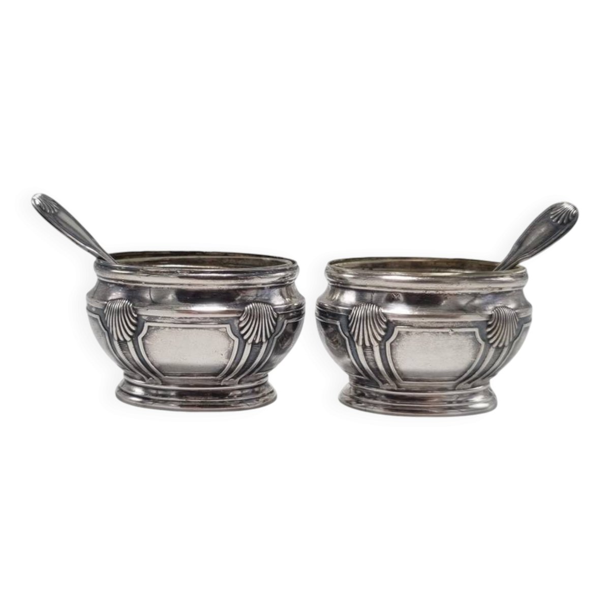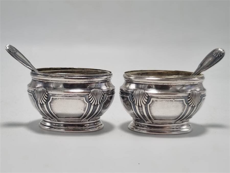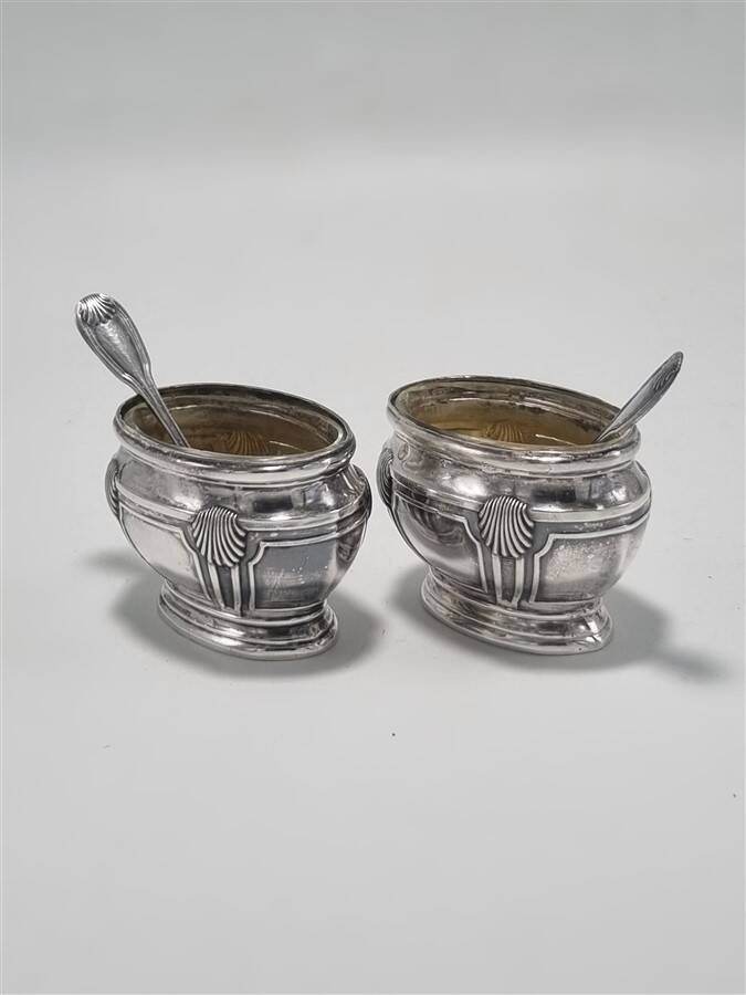 Pair of silver salt shakers with inner glasses and spoons. One of the glasses is chipped, see photo. Dimensions: approximately 6 X 3.5 X H 4 cm Weight: 90 g. L: 6 l: 3 H: 4
