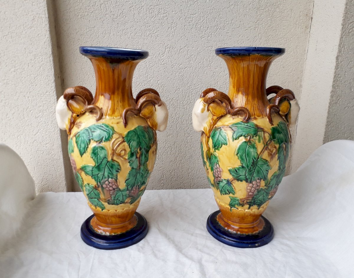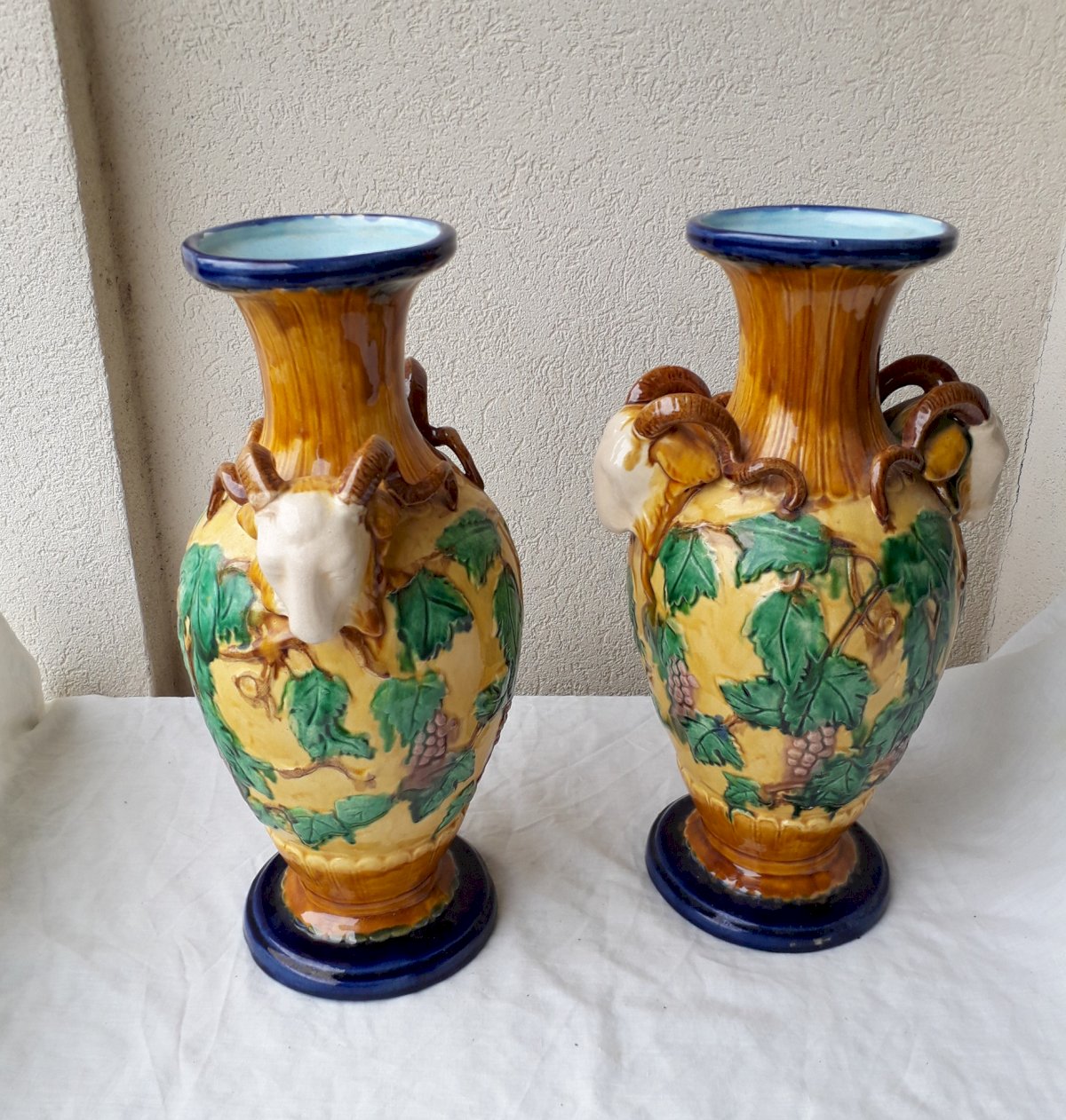 Old pair of slipware vases, without manufacturer indication, adorned with ram's heads and a vine leaf decoration. Very good overall condition, no breakage, very light signs of wear. Dimensions: height 34 cm, maximum width 19 cm, depth 15 cm. Total weight 3.2 kg. Feel free to contact me for any further information and/or to make your offers. See my other items for sale.