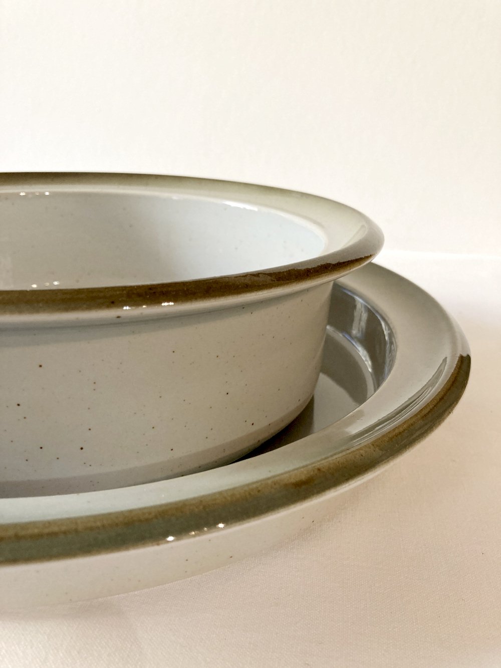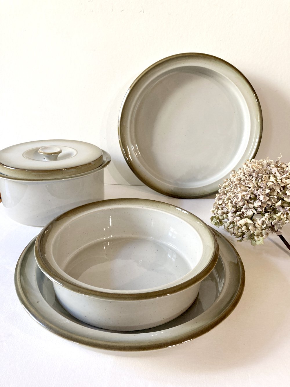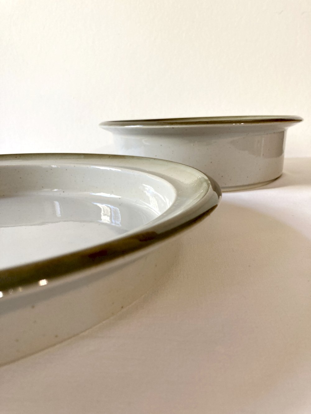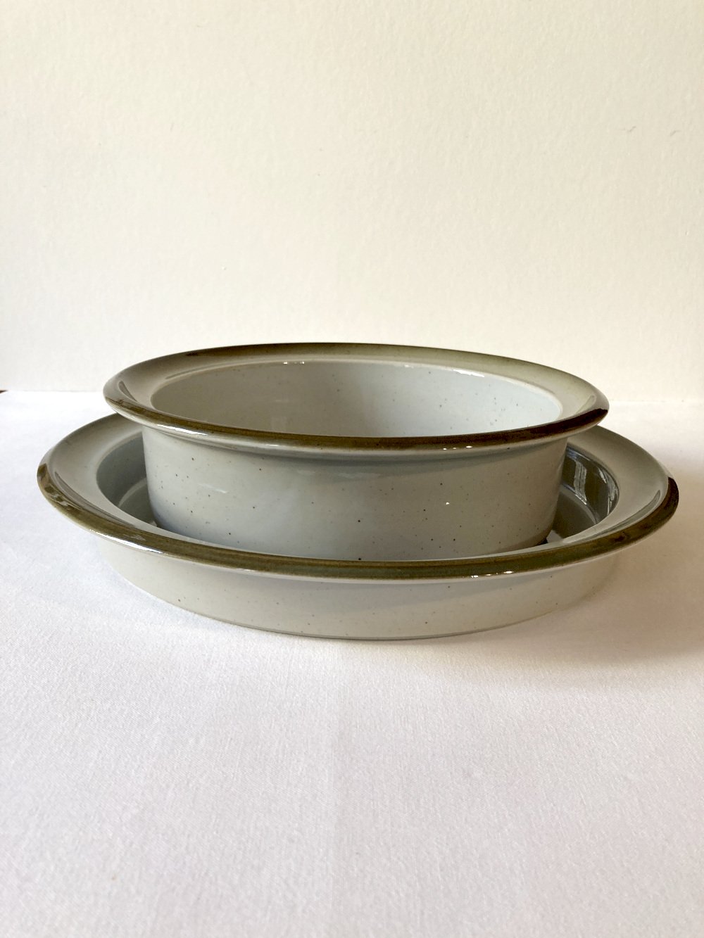 Duo of large fire stoneware serving dishes, Brenne pottery, 1970s-1980s. The so-called large fire baking process offers strength and shine to the stoneware, making it particularly durable. They arrive in perfect condition today, without cracks or chips. They are offered here in their less common gray-green glazed version, compared to the brown-toned examples. Other models from this service are available in my shop (preview in the last photo), please contact me for a bulk purchase. All these dishes are oven safe.