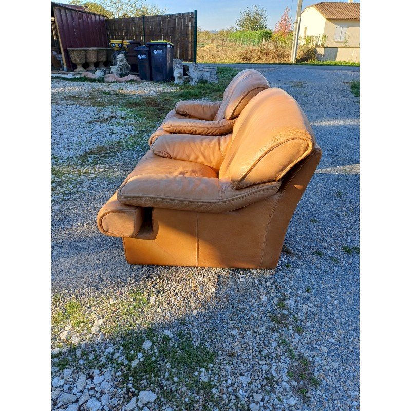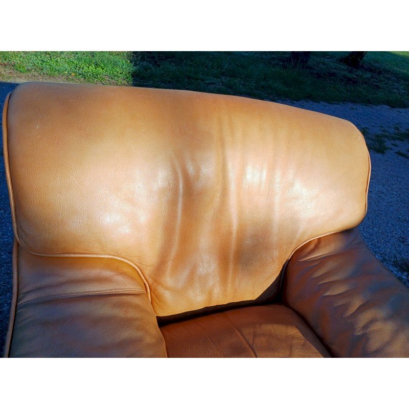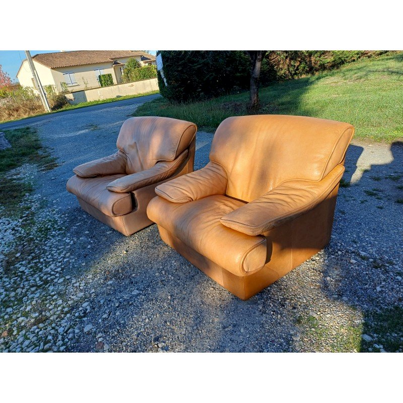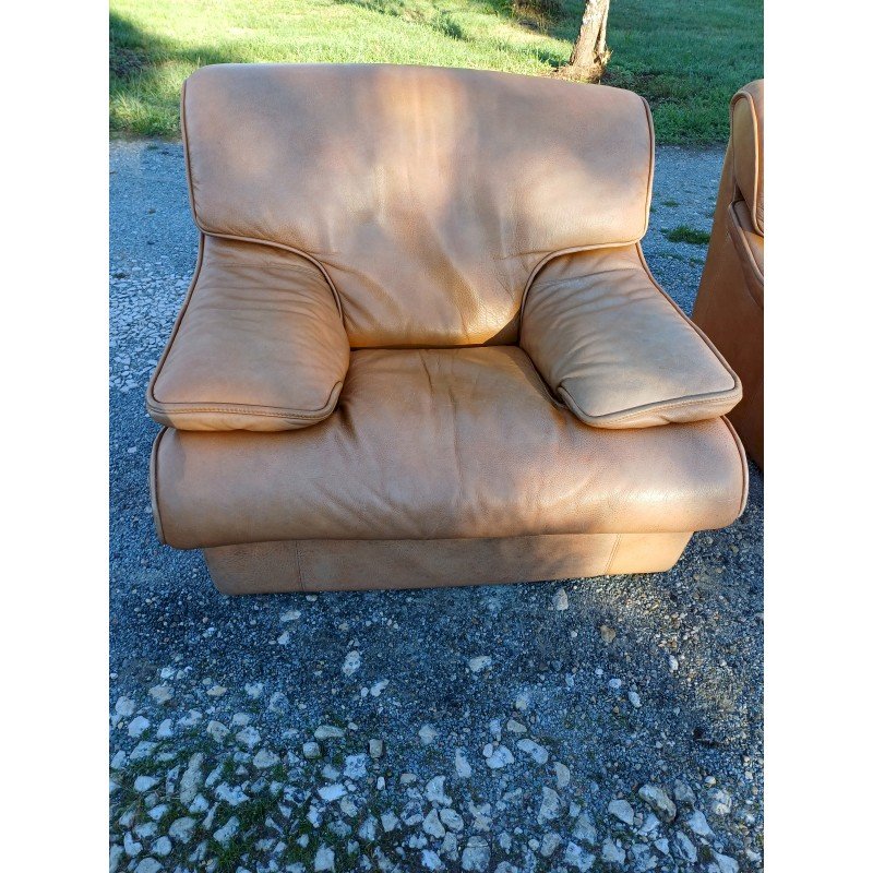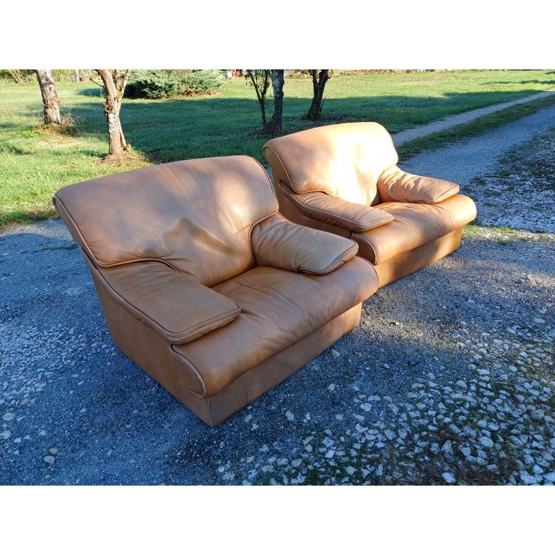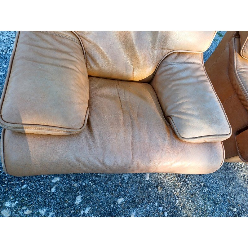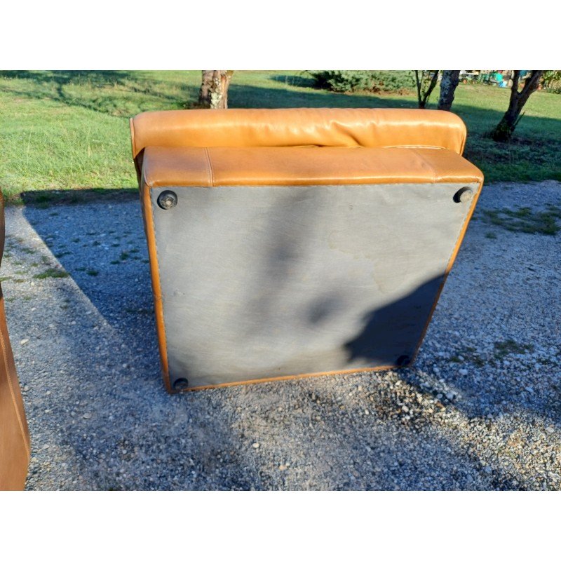 Pair of Vintage Armchairs in Light Brown Skai, Height: 82 cm, Seat Height: 38 cm, Length and Width: 100 cm by 110 cm, fully removable covers, very good condition.