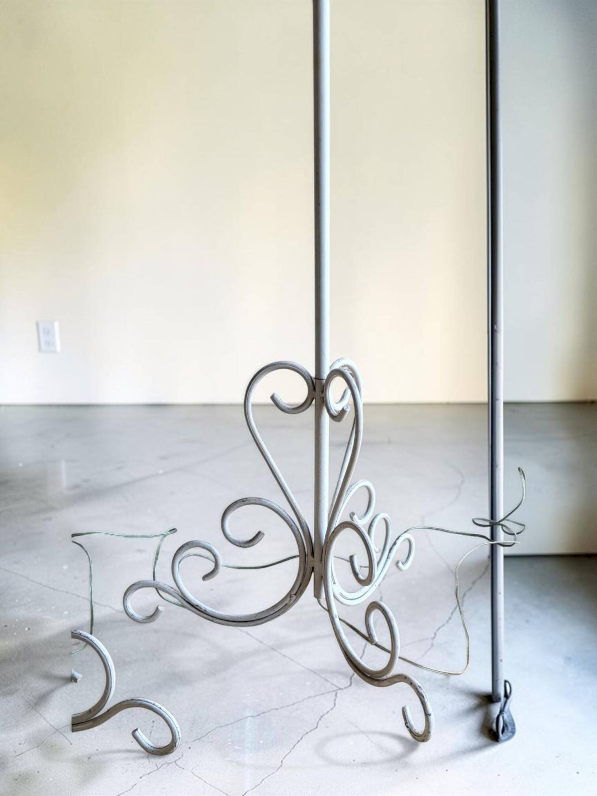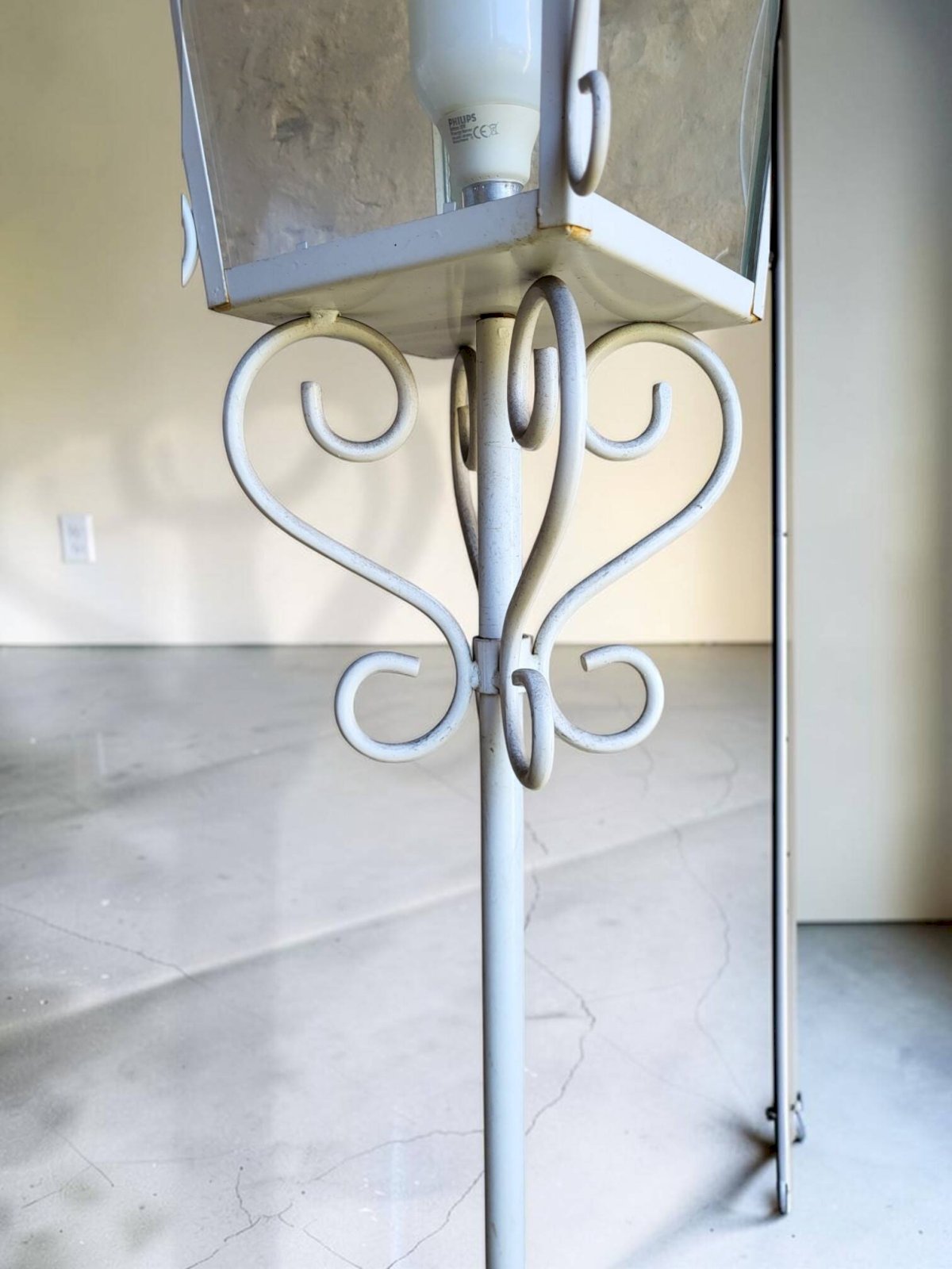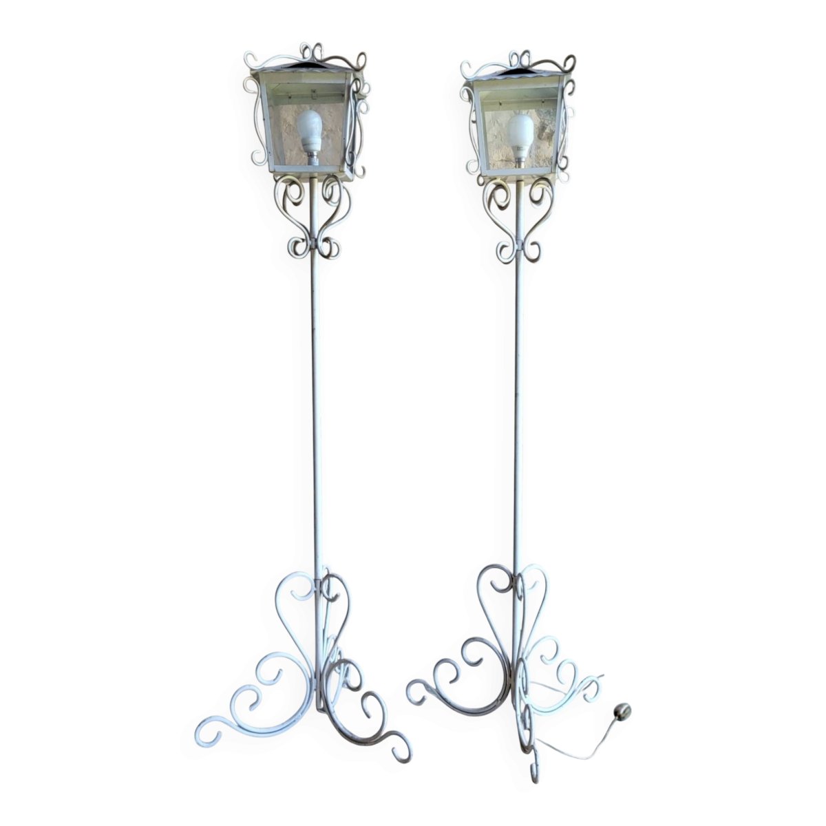 Pair of indoor/outdoor floor lamps in white lacquered wrought iron. Circa 1950-60. Height 171 cm. Footprint 54/55 cm. In good condition and functional / normal signs of wear and age. L: 54 W: 54 H: 171