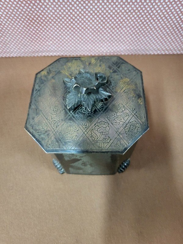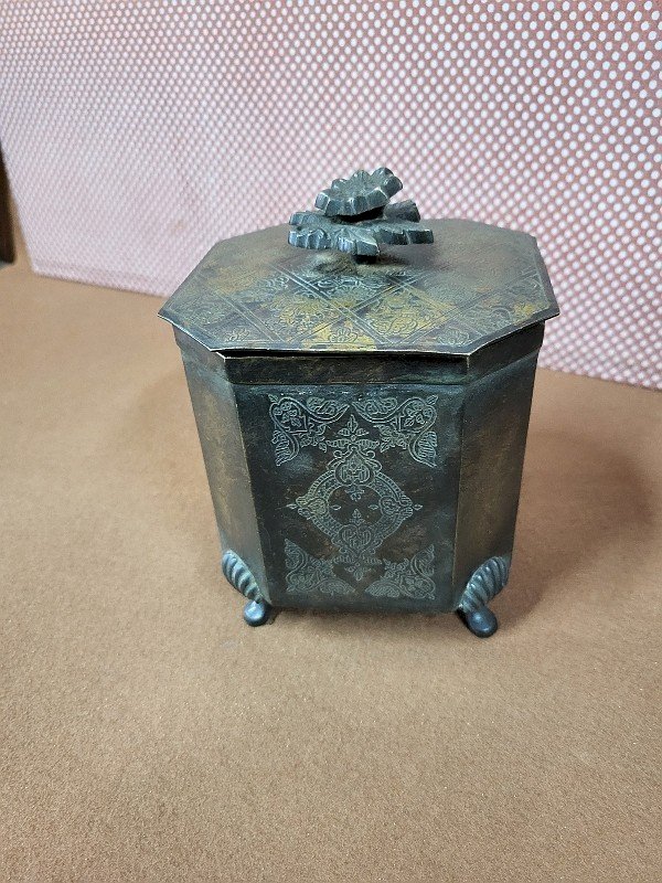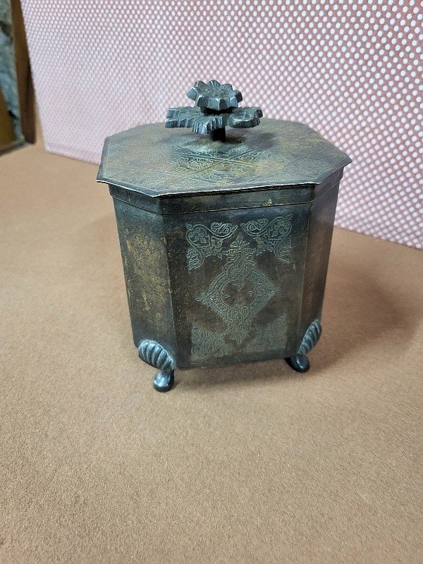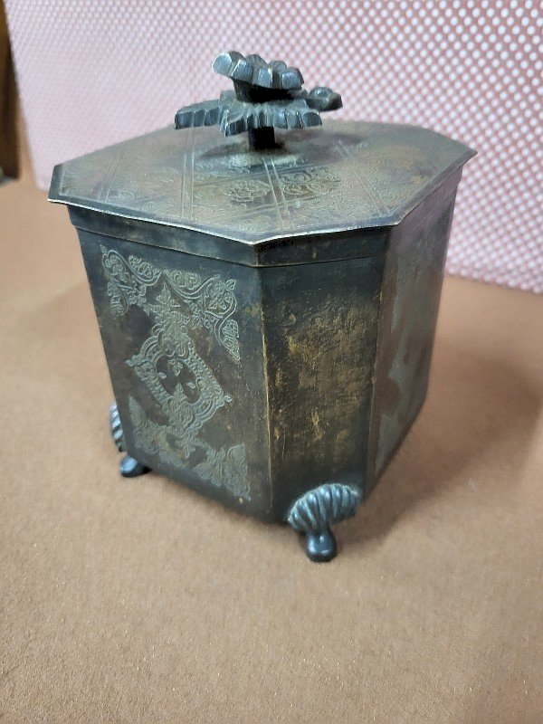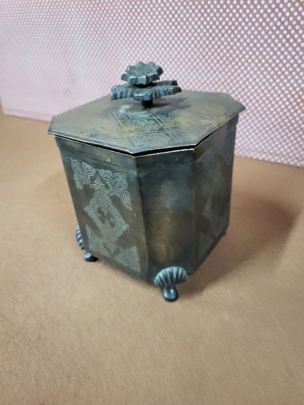 beautiful patinated brass tea box with a lid, it is in very good condition, it just has slight signs of wear on the sides, it is a very nice piece, measuring 11 cm wide by 11 cm deep and 15 cm high Type:Display object, Decorative Sub-type:TEA BOX Material:Brass