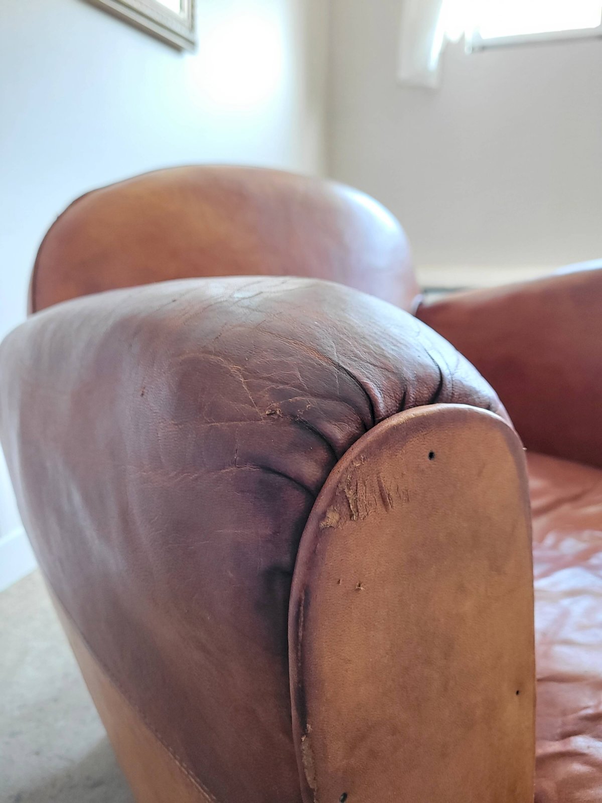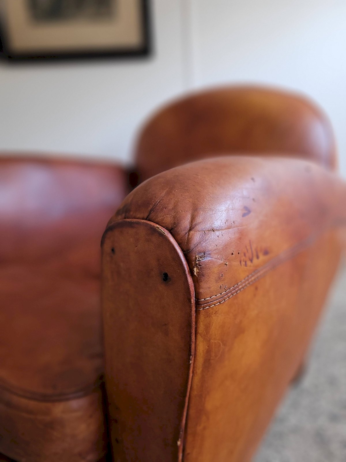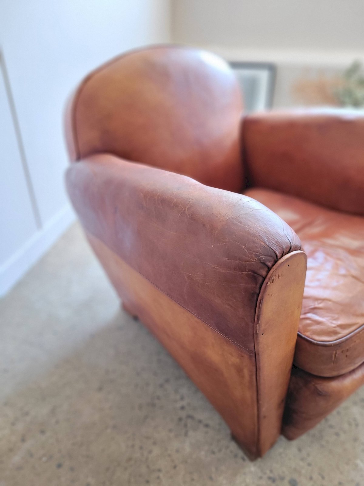 Patinated leather club armchair. Superb genuine leather club armchair.