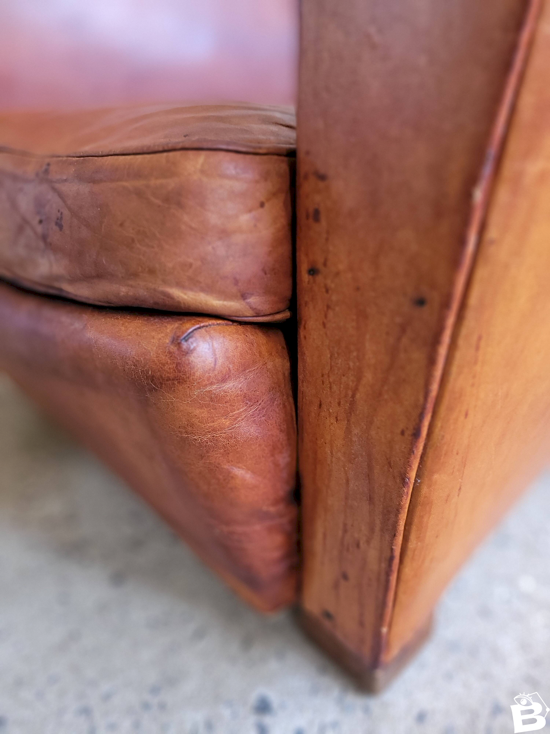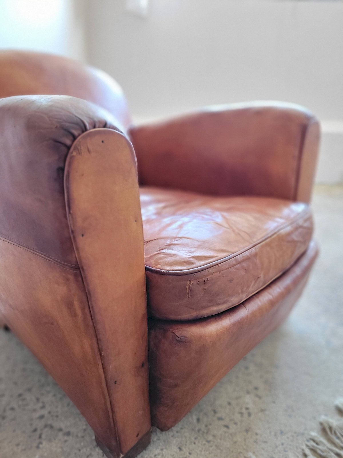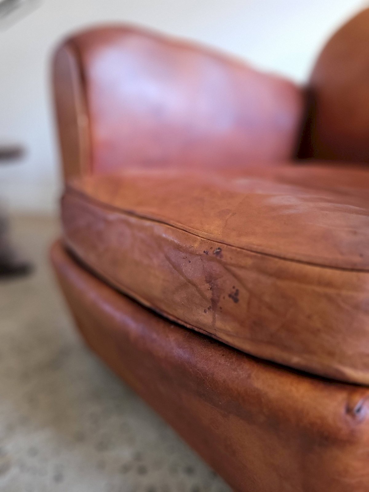 Patinated leather club armchair. Superb genuine leather club armchair.