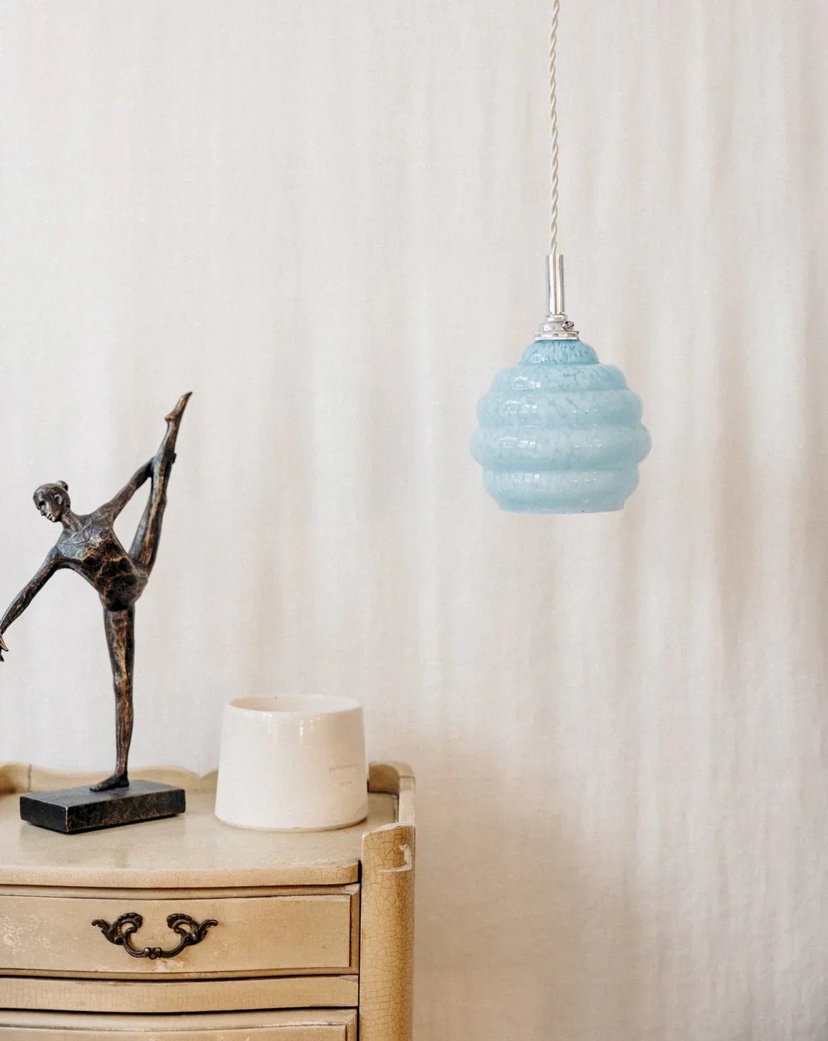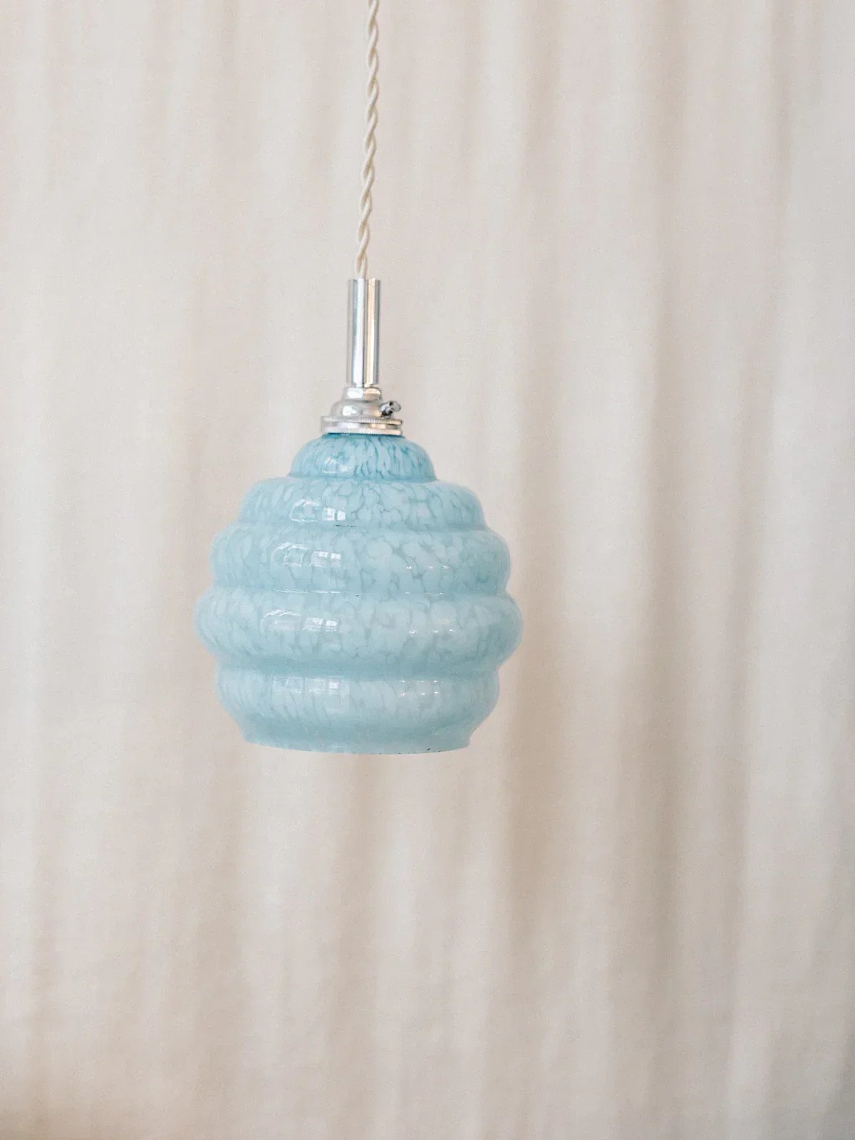 Alert gem! This small blue portable lamp in Clichy glass is the perfect decorative item to bring a touch of charm to your interior. We love it both hung along a wall and sitting above a countertop, dining table, or even in a bathroom. The detail that makes all the difference: its pretty braided cord. Use a filament bulb that offers a low-intensity yellow light for lovely illumination that will highlight your Paulette. Length: 12 cm Width: 12 cm Height: 20 cm Cable length: 275 cm Condition: Pre-owned: Item has been used. Item shows some superficial signs of wear, ... Pre-owned: Item has been used. Item shows some superficial signs of wear, fully operational and functioning properly. It may be a demonstration model or an item returned to the store after a short period of use, including any possible imperfections. Brand: Debongout Type: Thrifted product Style: Country Material: Glass, Brass Vintage: Yes