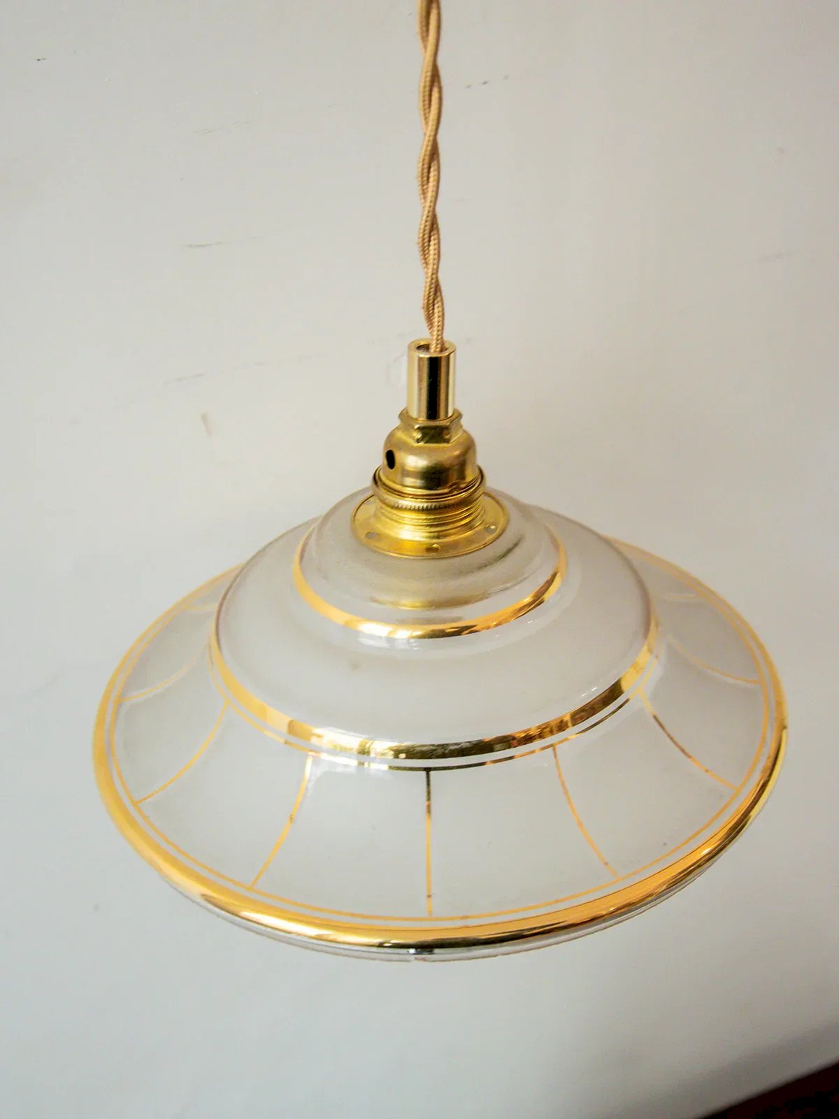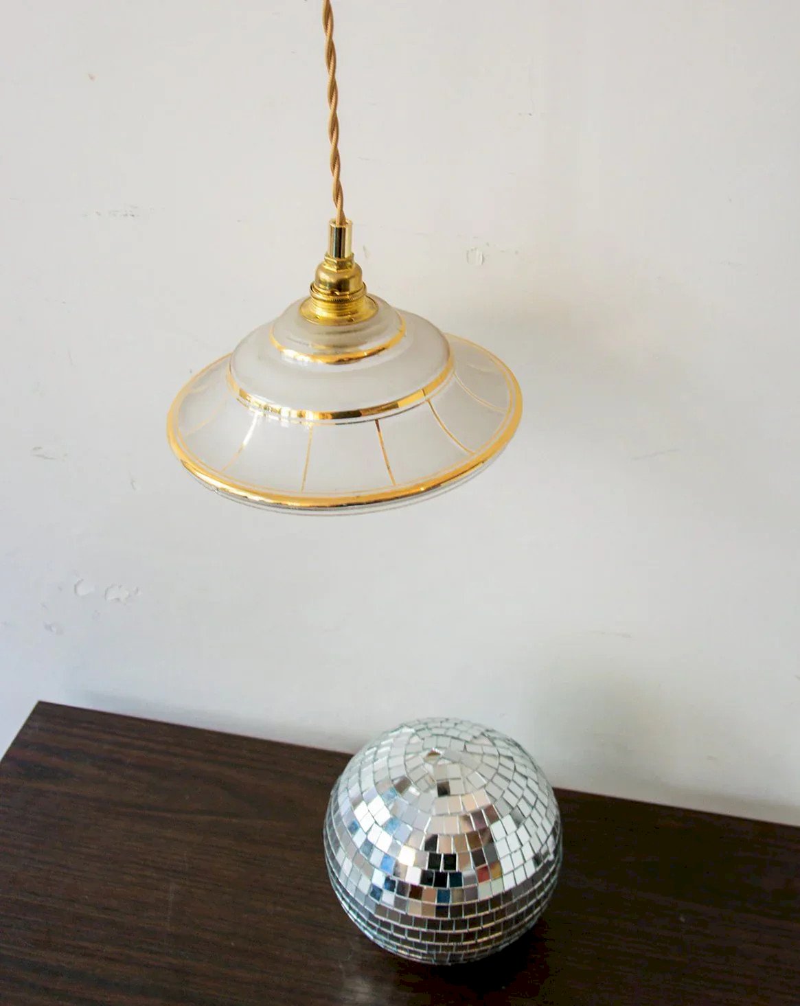 This small transparent portable lamp with a matte effect is the perfect decorative item to add a touch of charm to your interior. We love it both hanging along a wall and sitting above a countertop, dining table, or even in a bathroom. The detail that makes all the difference: its beige braided cord and delicate golden accents. Use a filament bulb that provides a dim yellow light for a lovely brightness that enhances your Paulette. Diameter: 18 cm Height: 13 cm Cable length: 210 cm Condition: Used: Item has been used. Item shows some superficial signs of wear... Used: Item has been used. Item shows some superficial signs of wear, fully operational and functioning properly. It may be a demonstration model or a returned item after a short period of use. Any imperfections should be noted. Brand: Debongout Type: Thrifted Product Style: Country Material: Glass, Brass Vintage: Yes