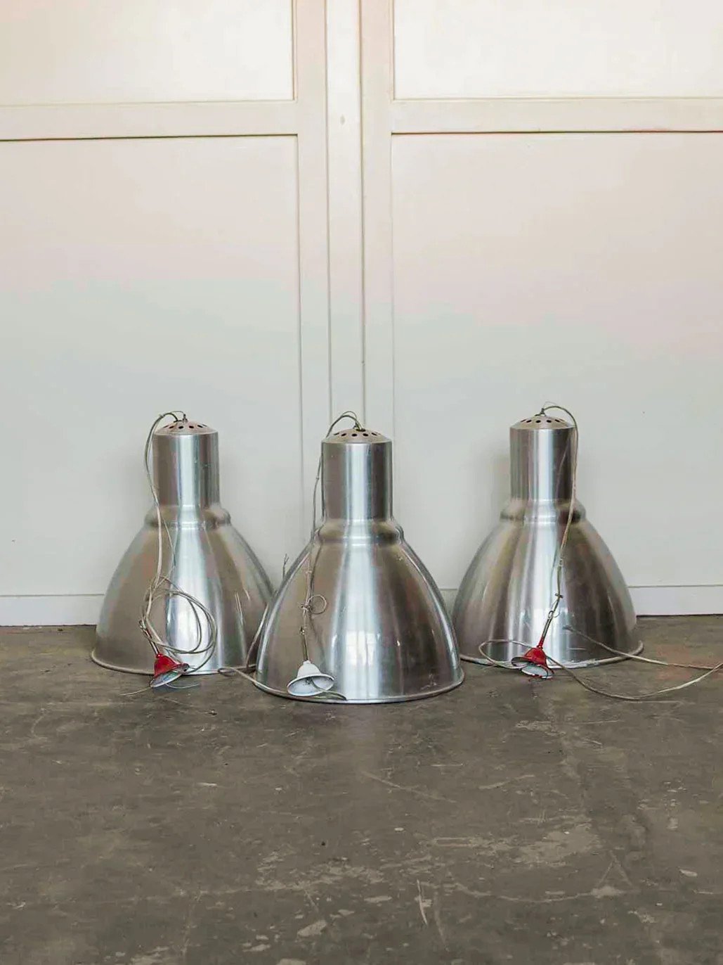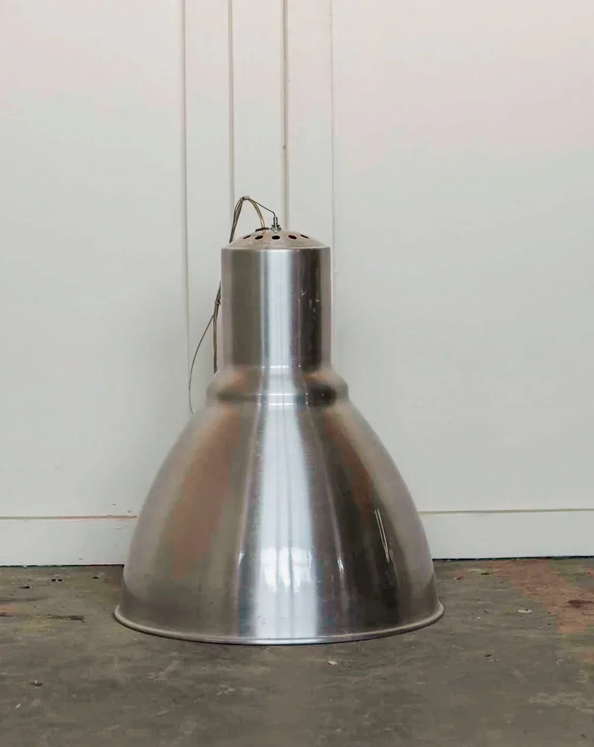 Discover this 1980s industrial pendant light with a beautiful brushed steel exterior and red enamel interior, a piece that draws the eye and diffuses warm, colorful light. Its robust silhouette and technical finishes integrate naturally into a kitchen, a renovated workshop, or a loft-style living room, while the enamel ensures a well-maintained luminous finish. A white enamel wall sconce accompanies the pendant for elegant and functional accent lighting. Height: 52 cm Diameter: 54.5 cm Condition: Used: Item that has been used. Item showing some superficial signs of wear... Used: Item that has been used. Item showing some superficial signs of wear, fully operational and functioning correctly. It may be a showroom model or an item returned to the store after a short period of use. Possible imperfections. Brand: Debongout Type: Vintage find Product: Yes Style: Country