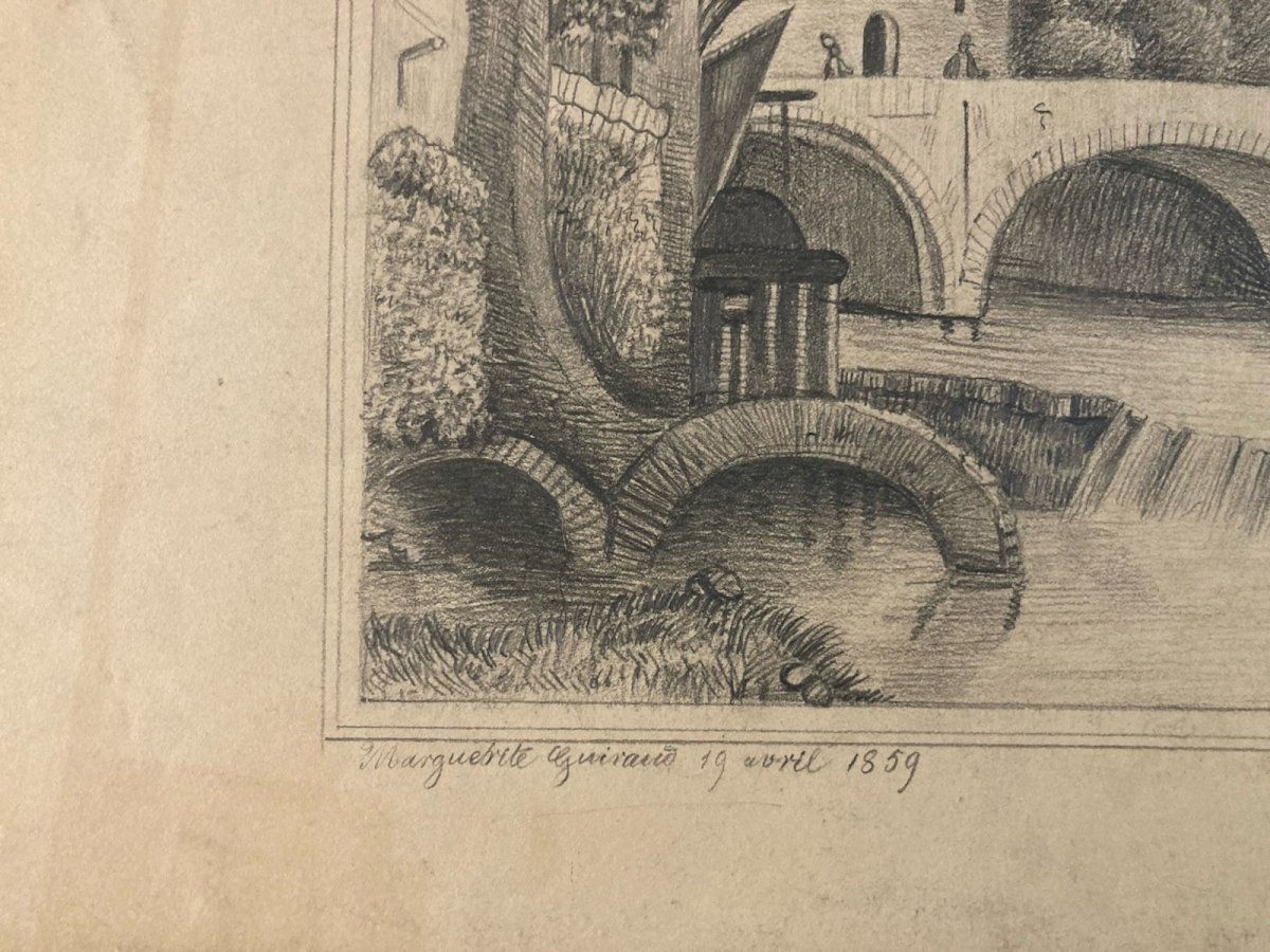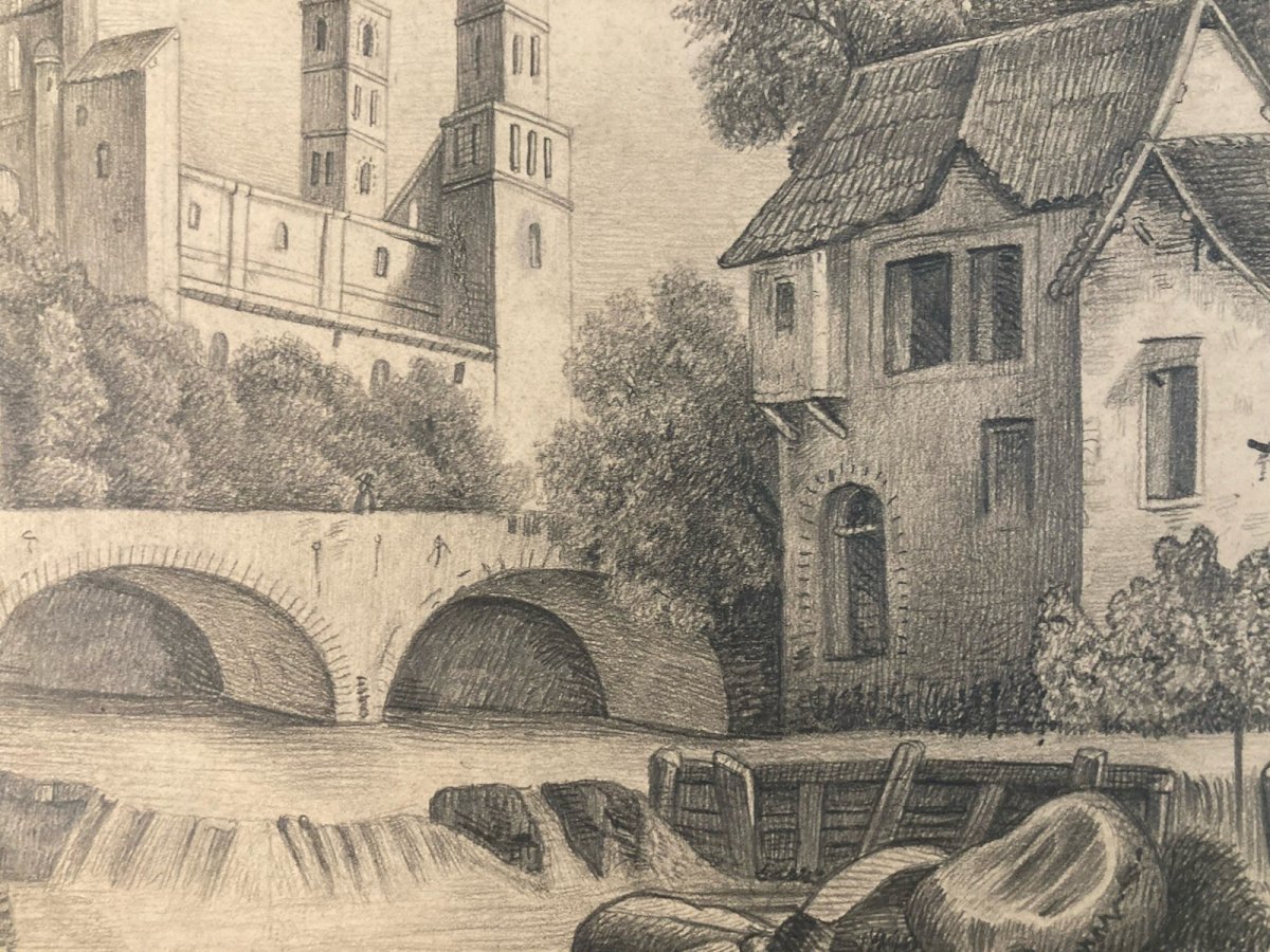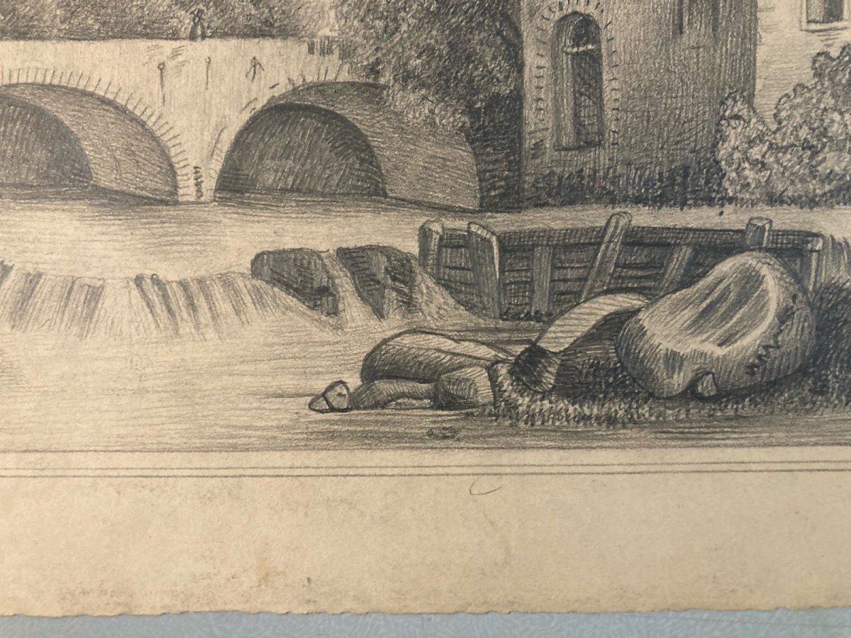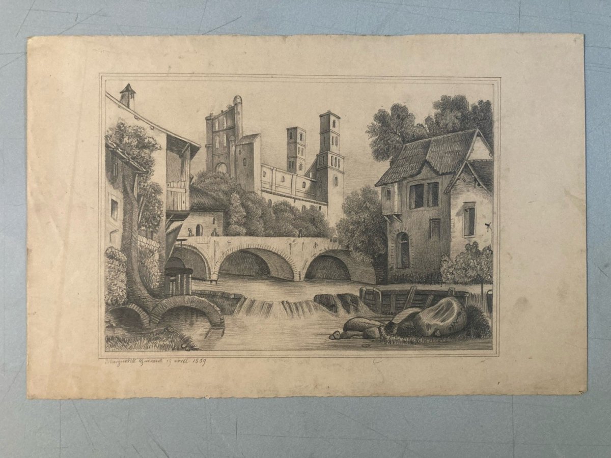Pencil Drawing 19th Century to Identify Castle River Village Ancient Art