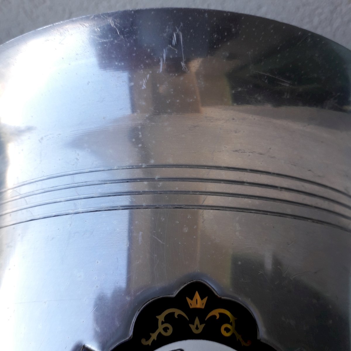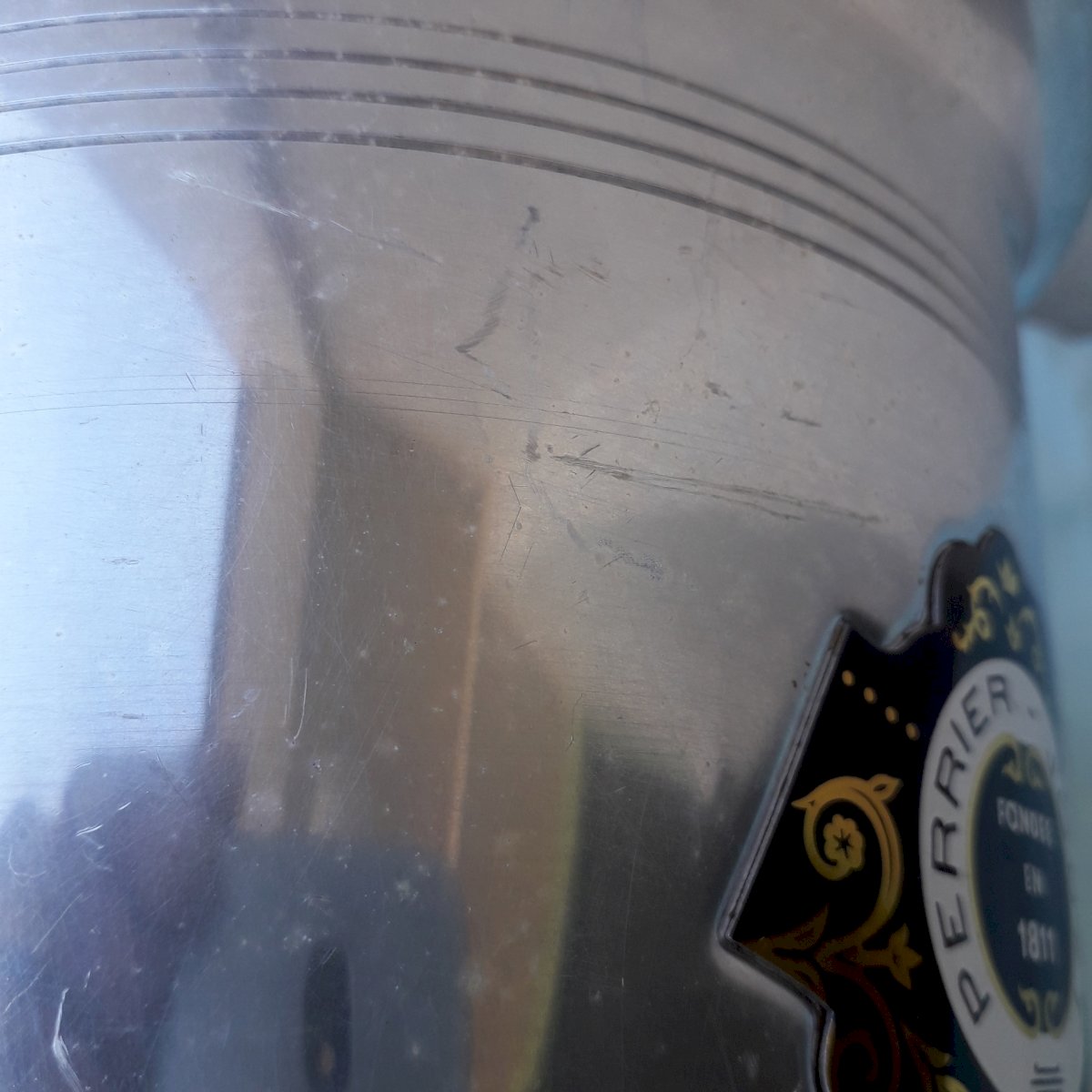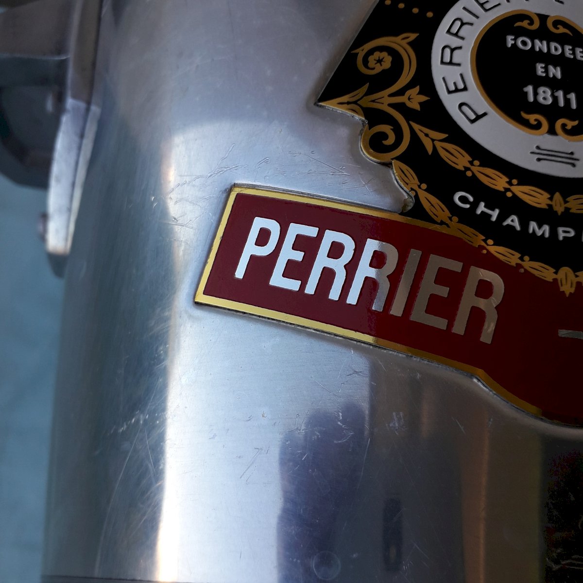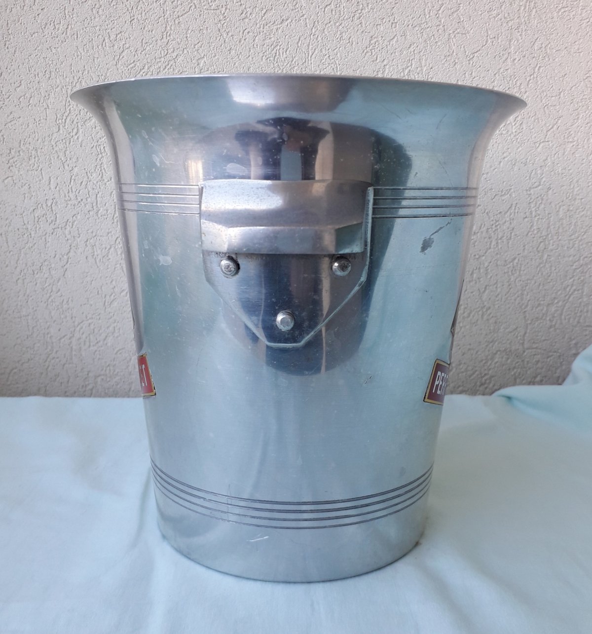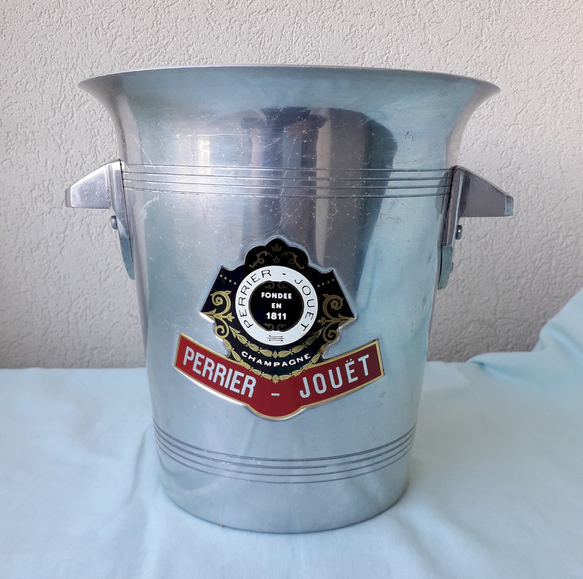 Metal champagne bucket from the brand "Perrier-Jouët", made in France. In its original condition, signs of use on the entire item (see photos) without any breakage. Dimensions: height 20.5 cm, width (with handles) 22 cm, base diameter 14 cm. Weight 0.5 kg. Please feel free to contact me for any additional information and/or to make your offers. See my other items for sale.