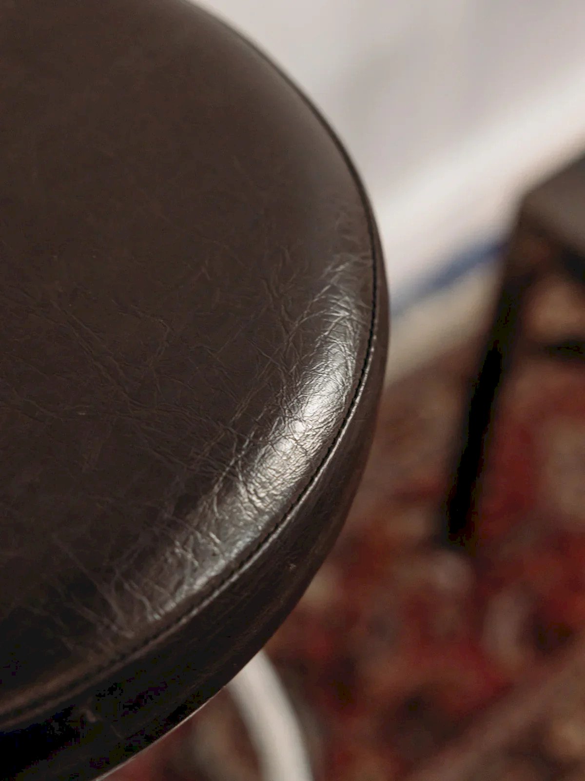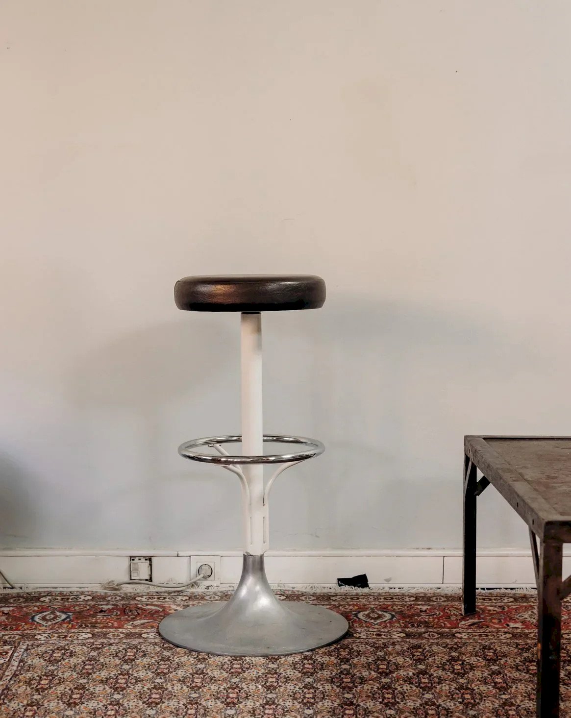 Adopt this brown leatherette bar stool with a metal tulip base, a discreet blend of contemporary elegance and comfort. Its white metal structure and tubular footrest provide stability and an airy silhouette, making it ideal for placement near a kitchen counter or a convivial bar. The compact proportions bring a strong presence without cluttering the space, creating a warm and modern atmosphere. Height: 86 cm Seat diameter: 35 cm Base diameter: 50 cm Condition: Used: Item has been used. Item shows some superficial signs of wear, fully operational and functioning correctly. It may be a demonstration model or an item returned to the store after a short period of use, with any potential imperfections. Color: Multicolored Height: Metal, Leatherette Width: Bar stools Brand: Debongout Type: Vintage product Material: Metal, Leatherette Style: Contemporary