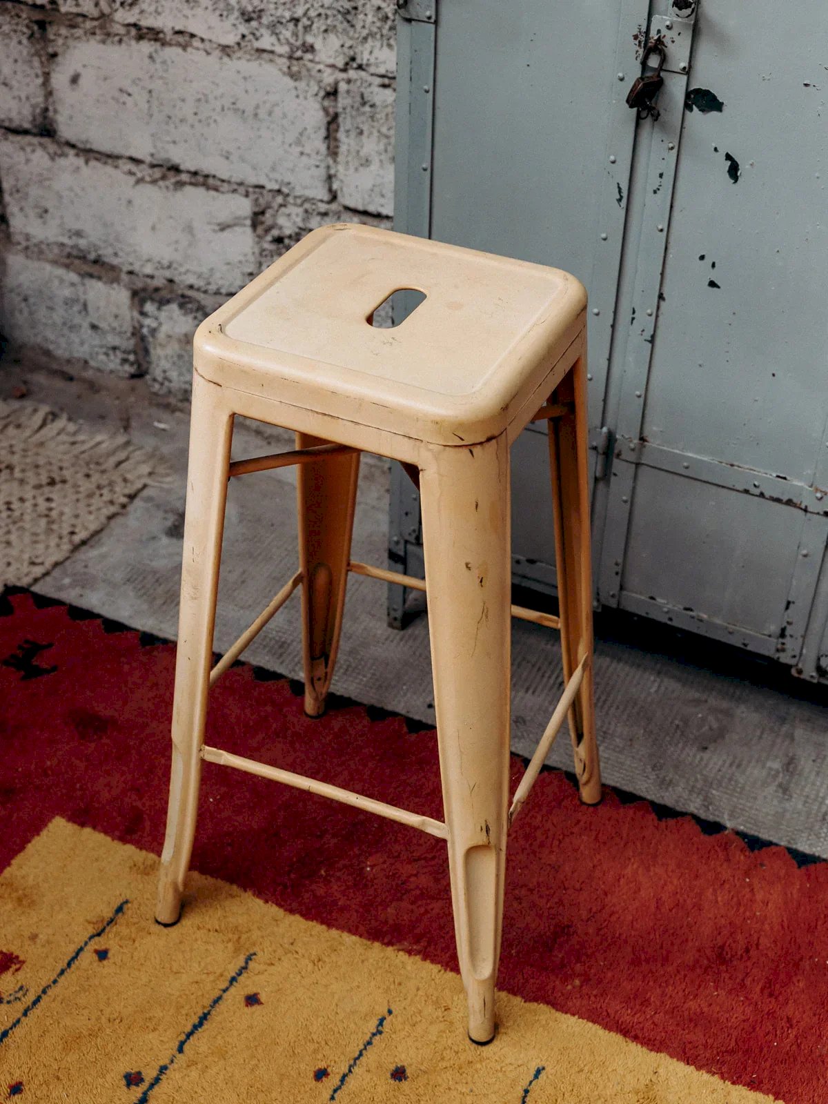 Discover this high metal stool with a square and modern design, perfect for adding a splash of color with its bright yellow structure. Its crossed bars provide enhanced stability while adding an interesting graphic detail. Ideal for a bar or kitchen, it combines functionality and style. Solid and lightweight, it easily fits into various spaces. A unique piece to energize your decor. Seat length: 30 cm Base length: 42 cm Height: 77 cm Seat depth: 30 cm Base depth: 42 cm Condition: Used: an item that has been used. Item showing some minor surface wear... Used: an item that has been used. Item showing some minor surface wear, fully operational and functioning correctly. It may be a demonstration model or a product returned to the store after a short period of use. any potential imperfections. Color: Multicolor Height: Metal Width: Bar stools Brand: Debongout Type: Vintage product Material: Metal Style: Contemporary