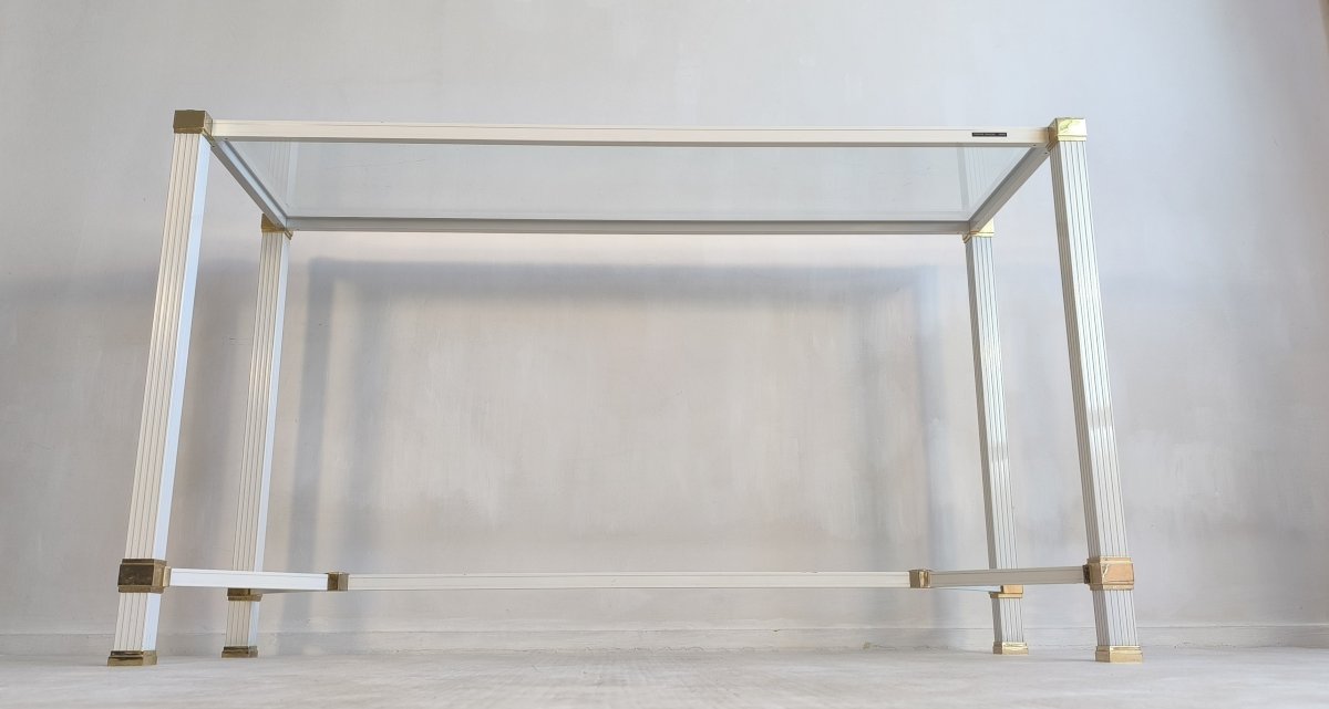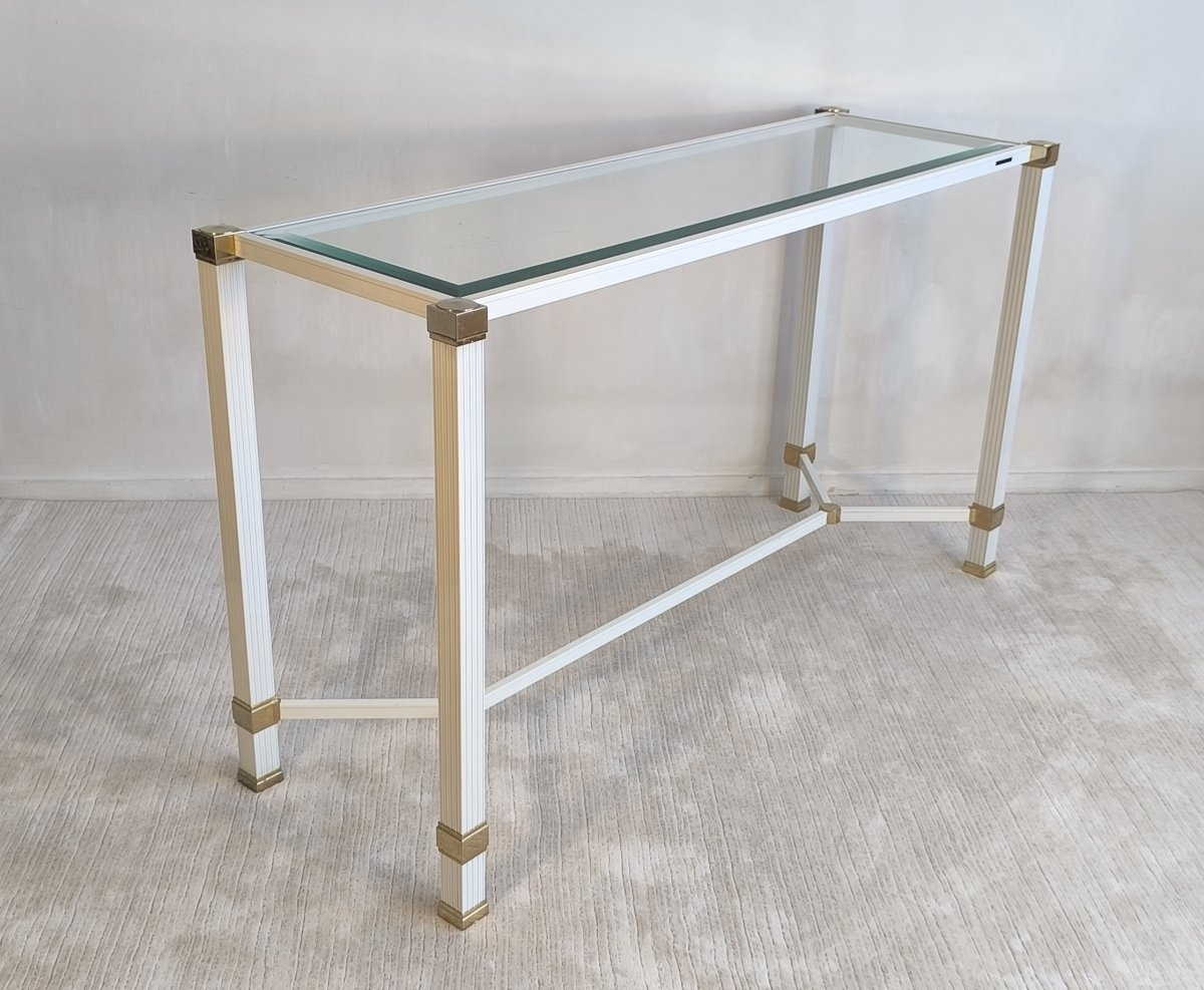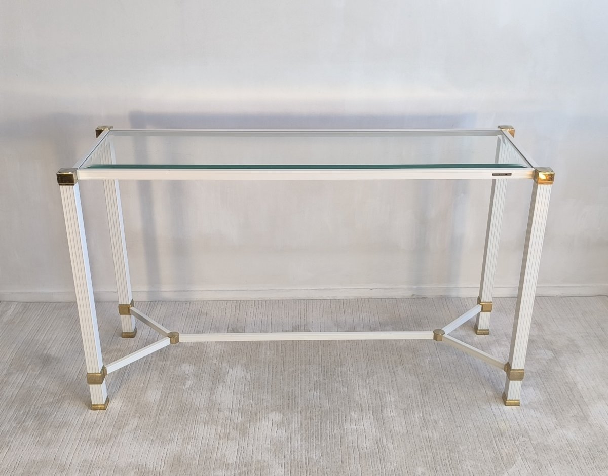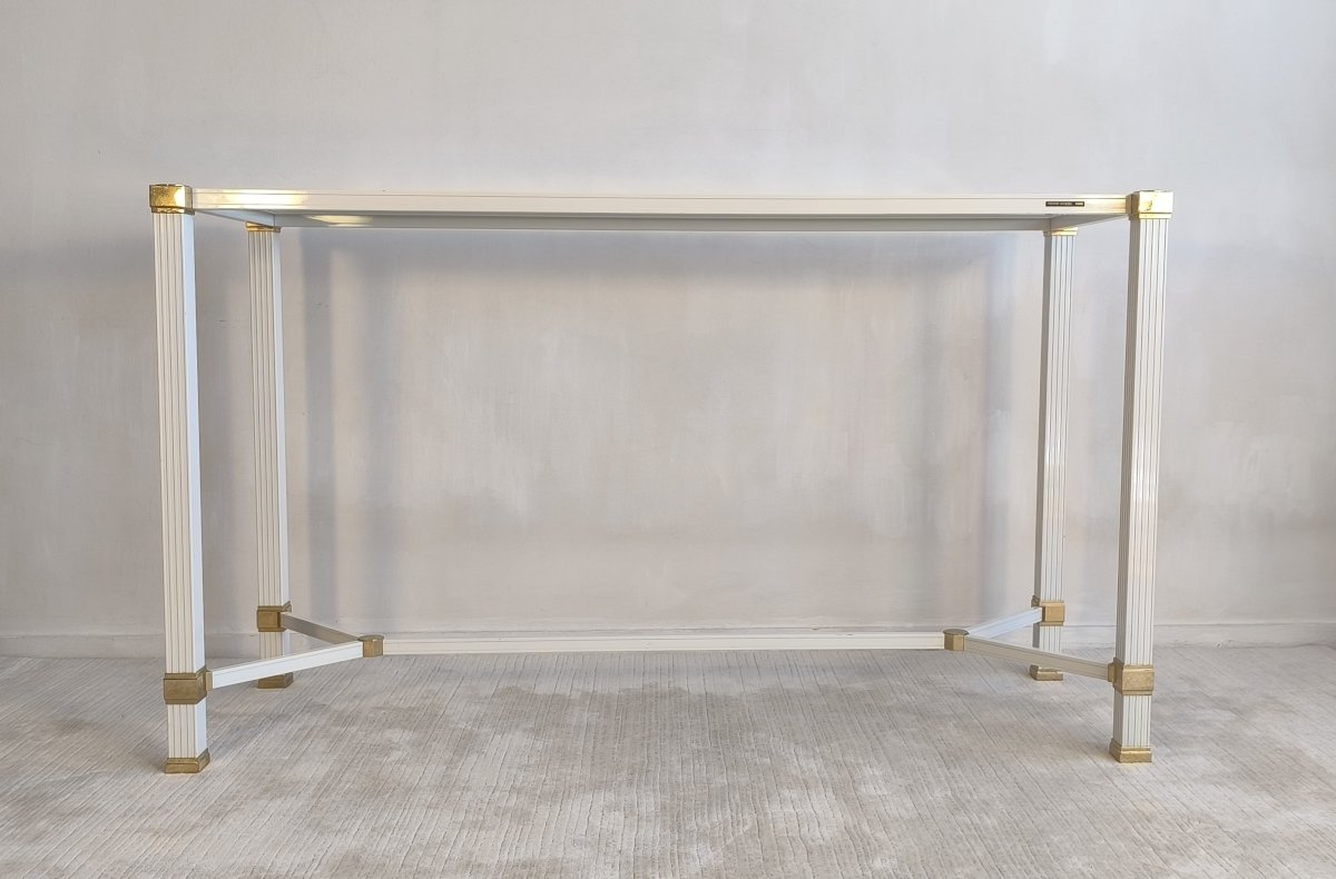 Magnificent rare white lacquered console with stretcher, signed by the famous French designer Pierre Vandel, structure in lacquered aluminum, fluted feet, thick 10mm glass beveled on the edges of 28mm.