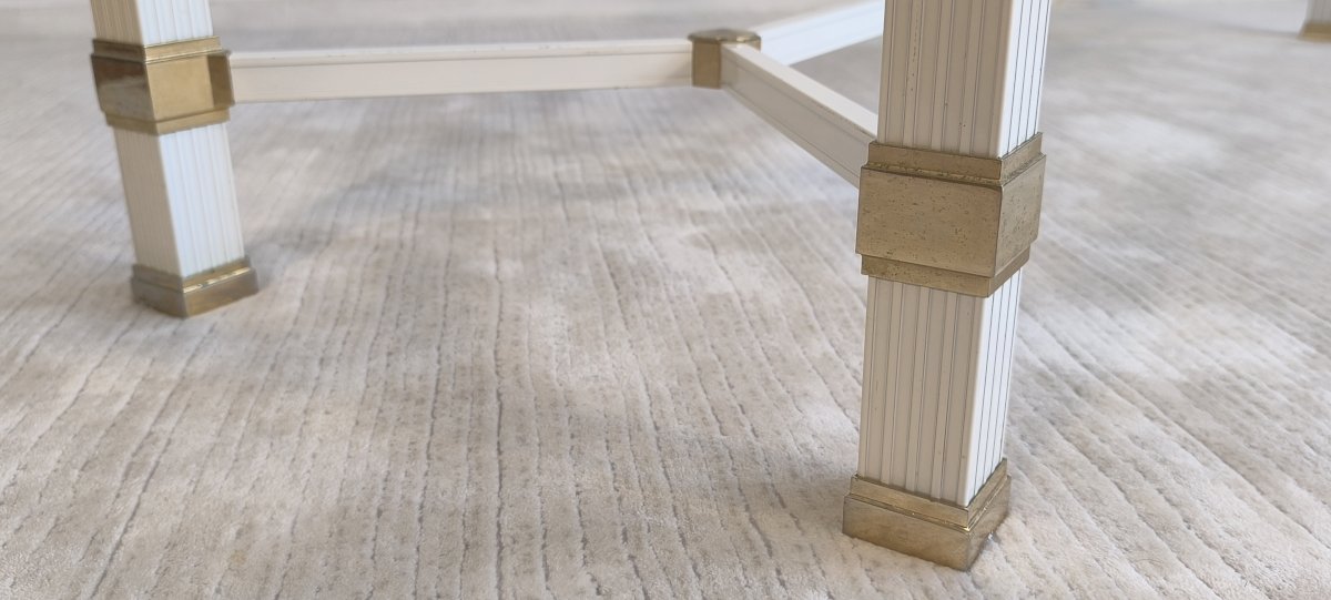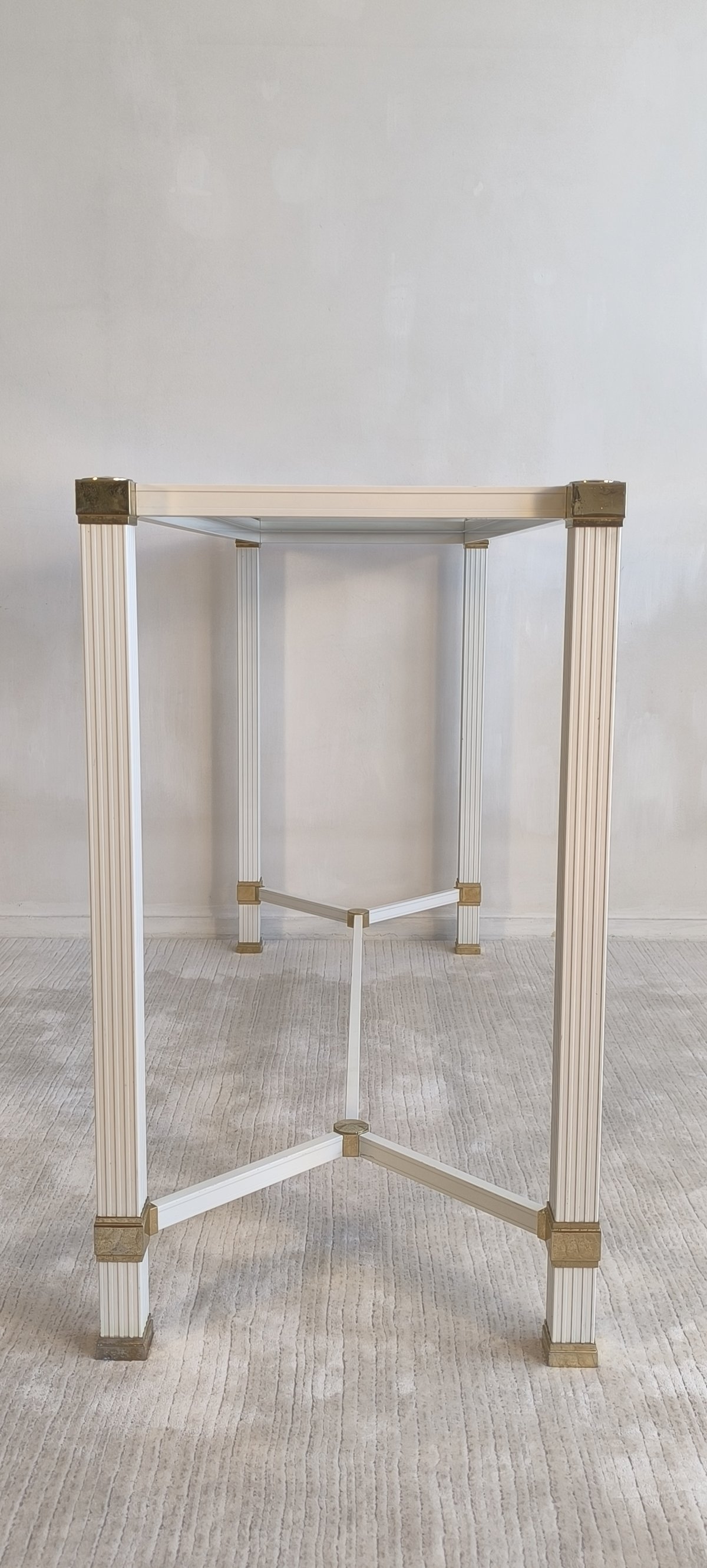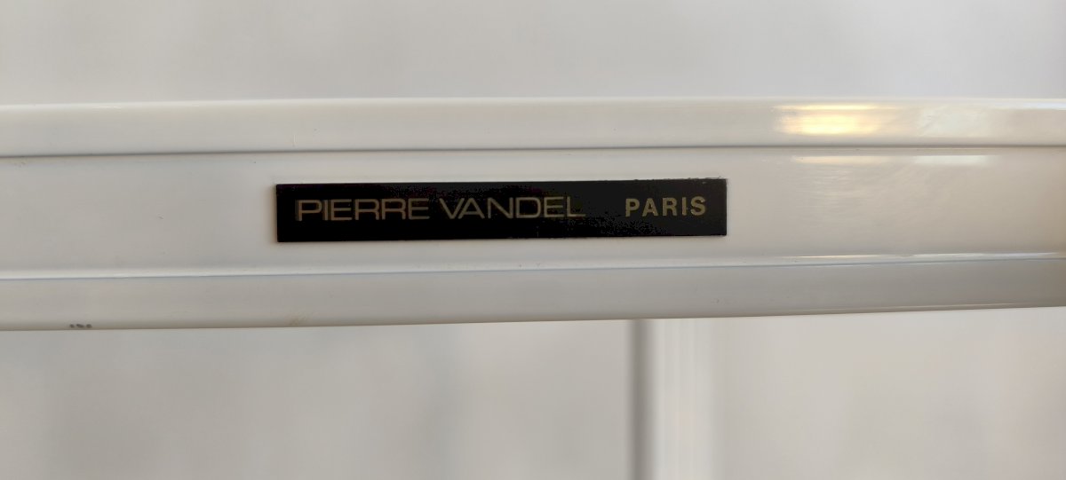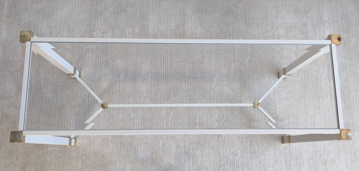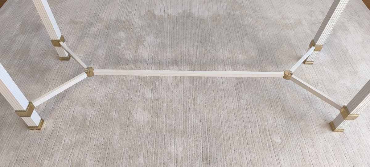 Magnificent rare white lacquered console with stretcher, signed by the famous French designer Pierre Vandel, structure in lacquered aluminum, fluted feet, thick 10mm glass beveled on the edges of 28mm.