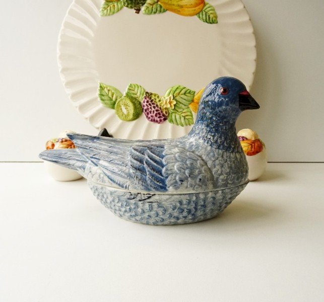 1980s, Pigeon Terrine in Faience, from the Michel Caugant collection, blue color.
