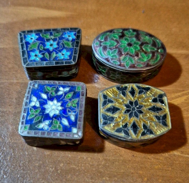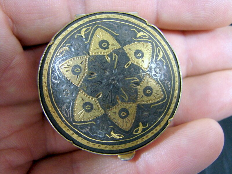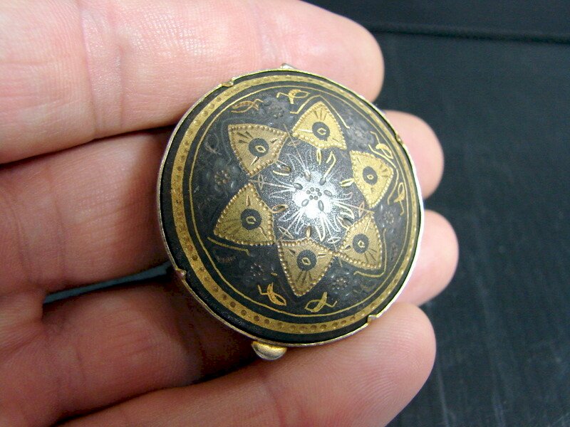 Visit my small gallery of rare objects in "my sales" by clicking on "View other items from the seller" at the top right. CHECK OUT OTHER ITEMS IN "MY SALES"! Pill Box / Golden Brass Pill Box with Fine Gold Damascene Lid from Toledo, souvenir from Las Palmas 1967, see the photos. Very good overall condition, see the photos. Dimensions: Diameter: 4 cm, Height: 1.5 cm. See other items in my sales. Happy bidding! Bundle your purchases and save on shipping costs!