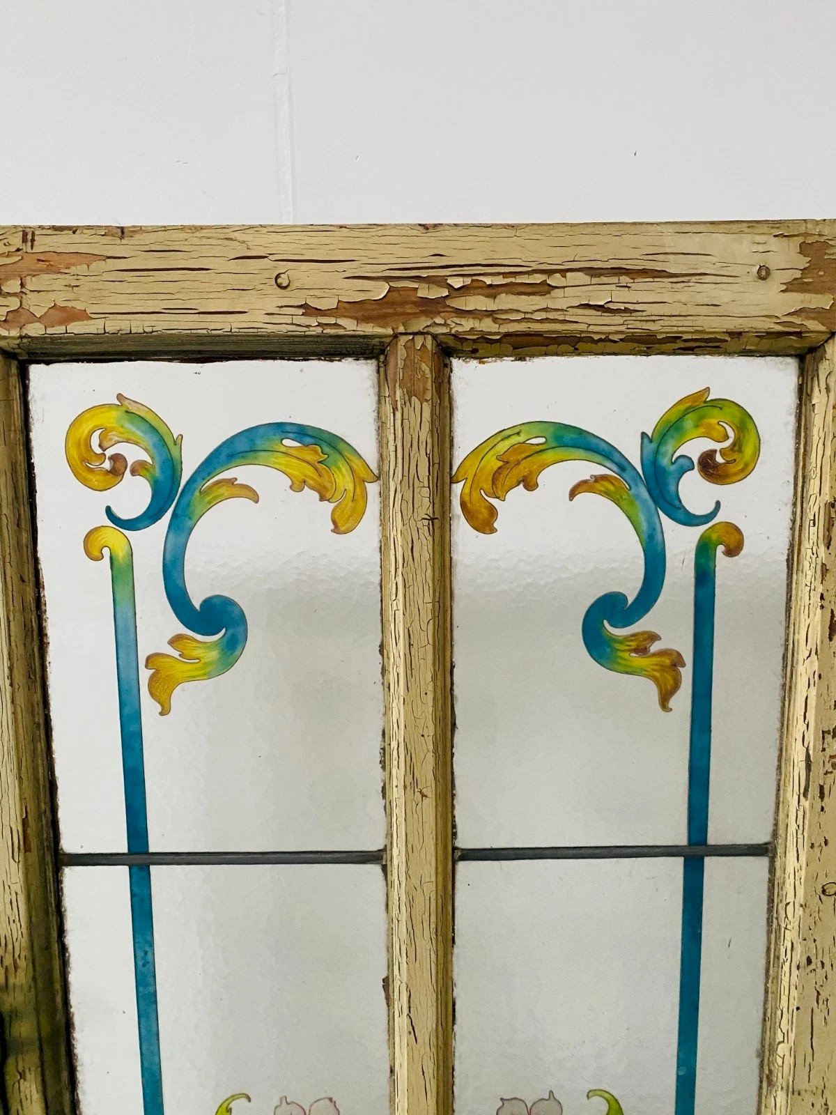Passage door in patinated fir and painted glass Door with reserve with two molded panels Painted glass with floral decoration Good condition Door sold without frame Period XX century Door H 172 x W 70 x D 3 cm Glass H 106 x W 25 x D 0.5 cm Type: Door Period: Art Deco Country of origin: France Height: 172 Material: Glass Length: 70 Width: 3