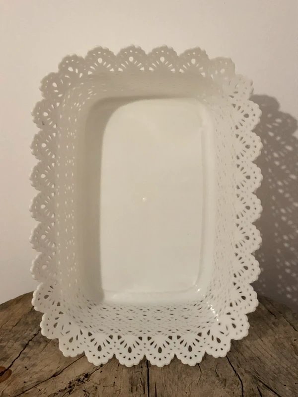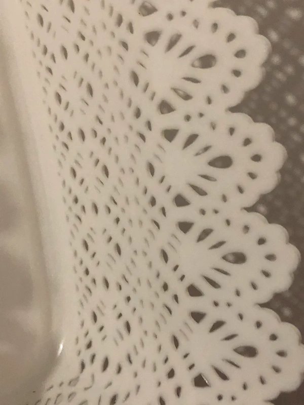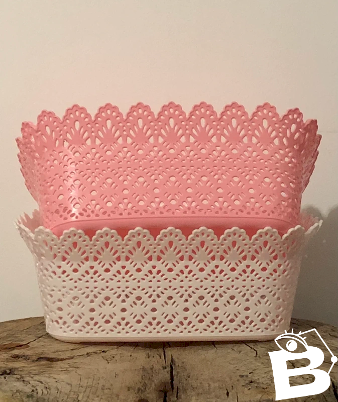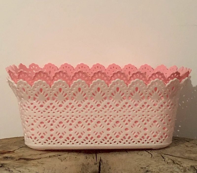 Pink and white lace-style baskets in very good condition, discreet stripes at the bottom, see the photos. Height 10 cm, dimensions 19*26 cm.