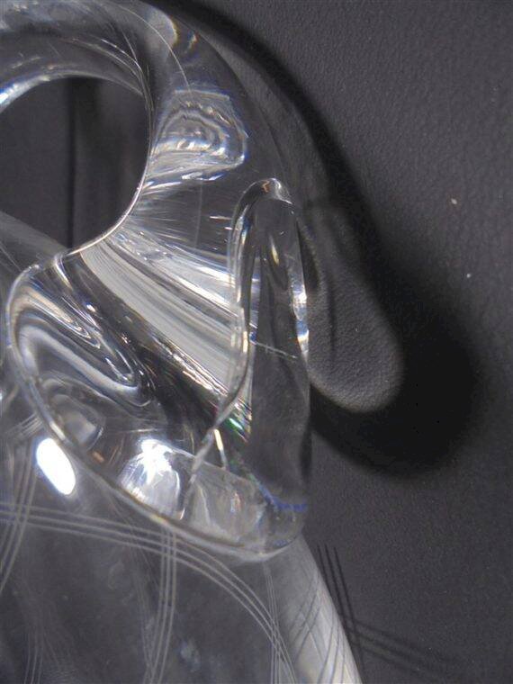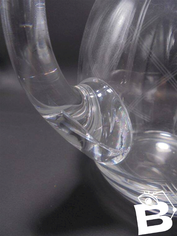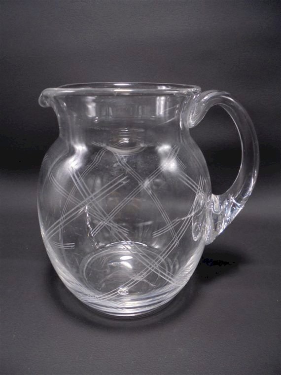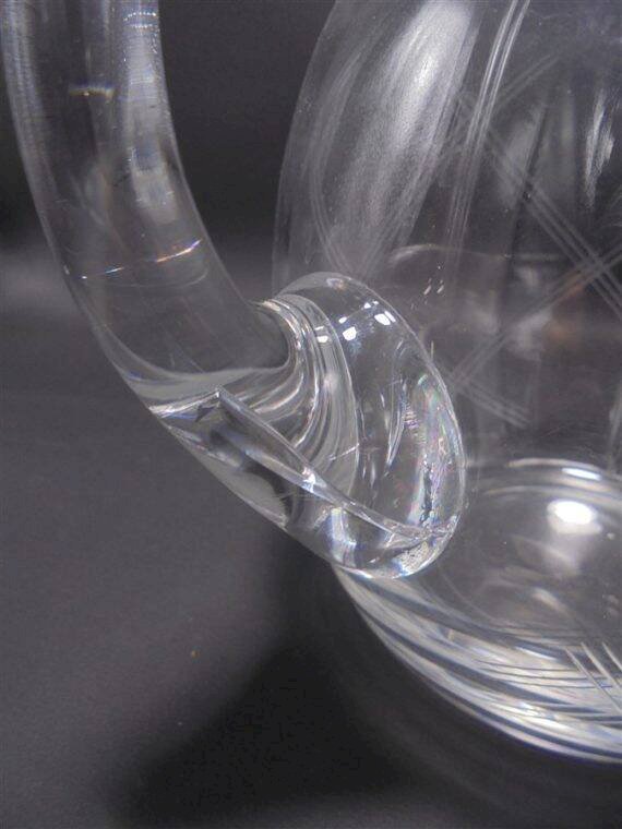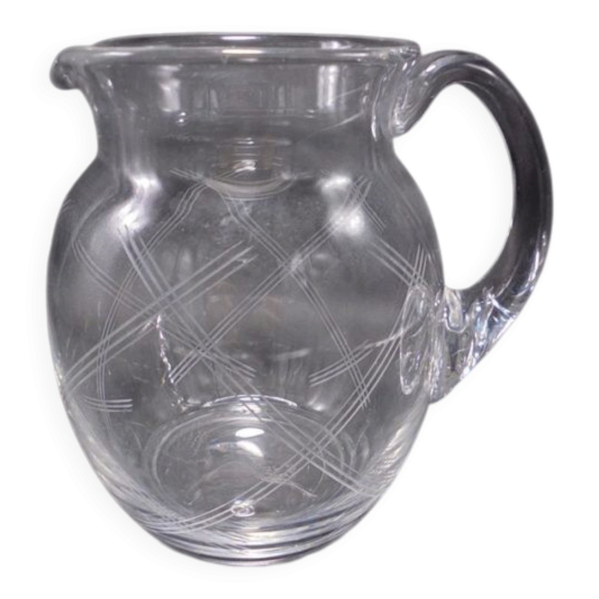 Glass jug with chiseled decoration, it has slight signs of use and especially a crack in the handle, it should be noted that it is not fragile at all. Height: 16.3 cm Width: 14 cm Depth: 15.5 cm Weight: 990 g L: 14 l: 15.5 H: 16.3