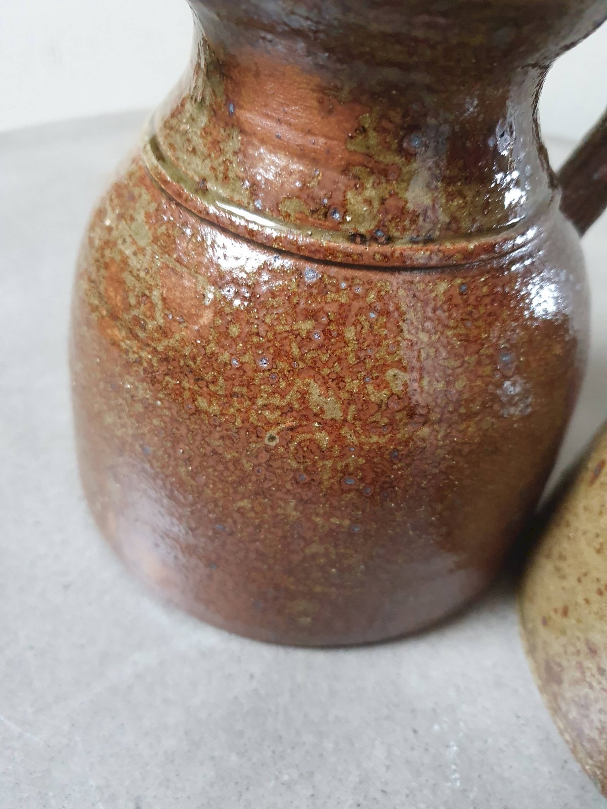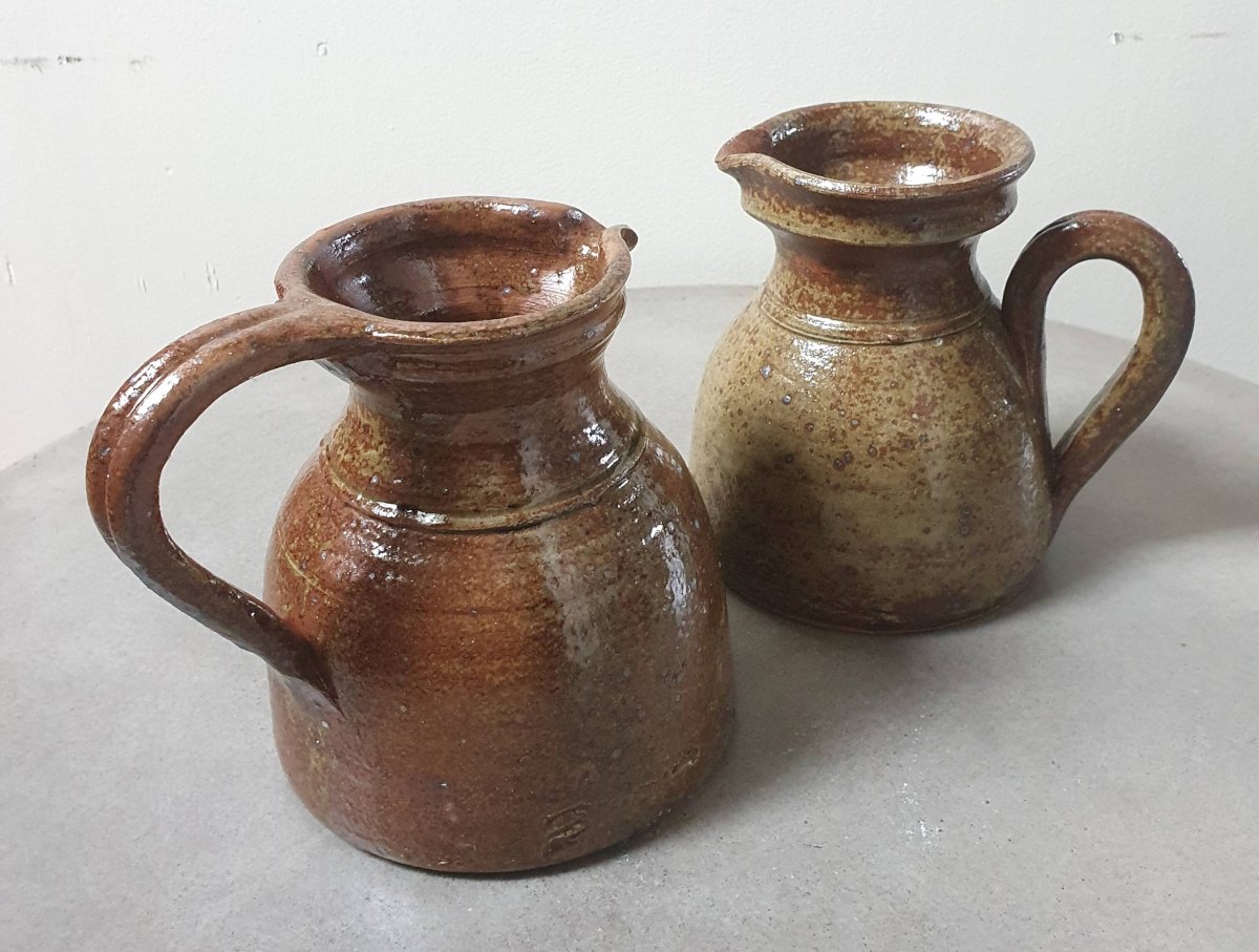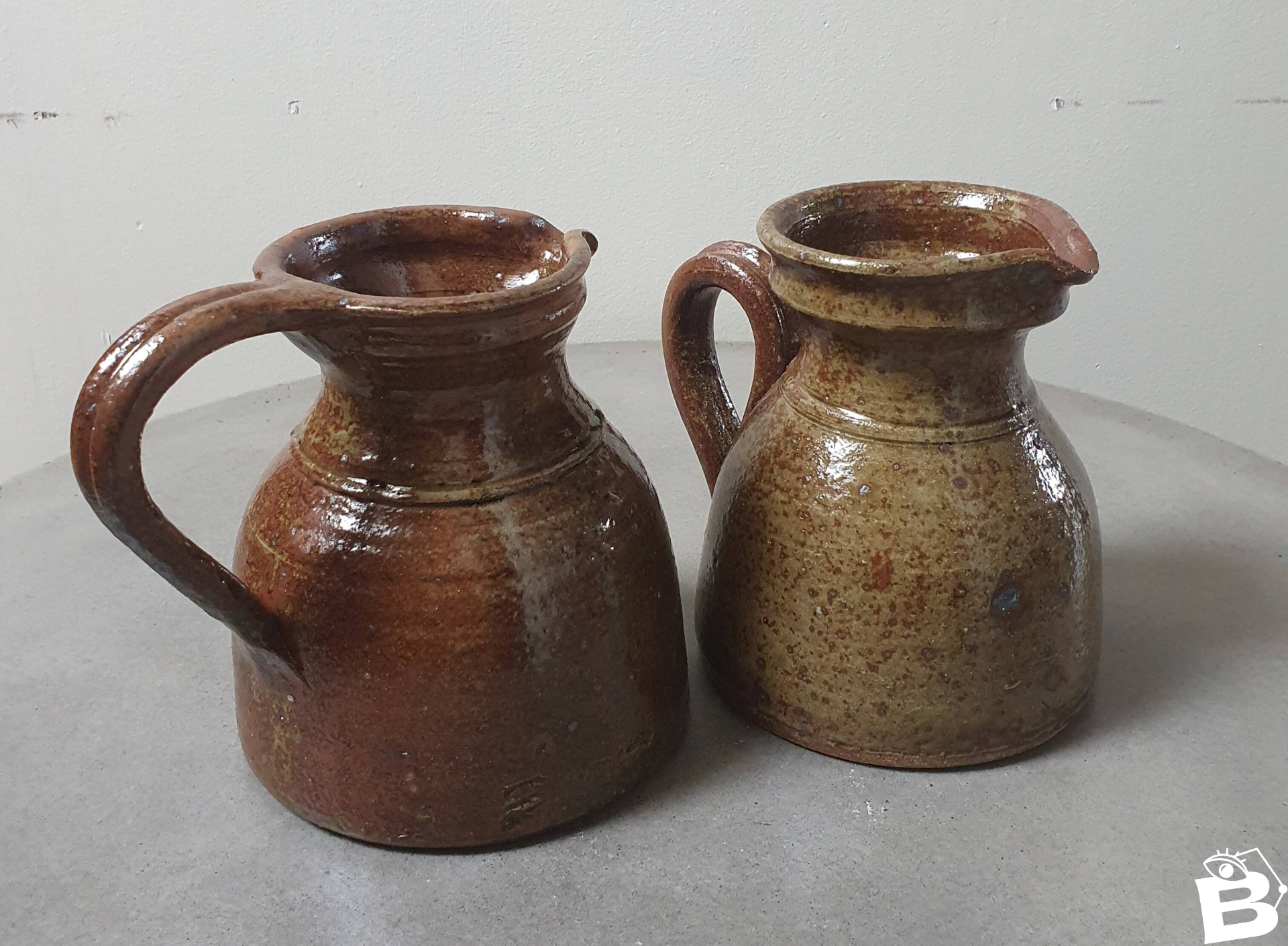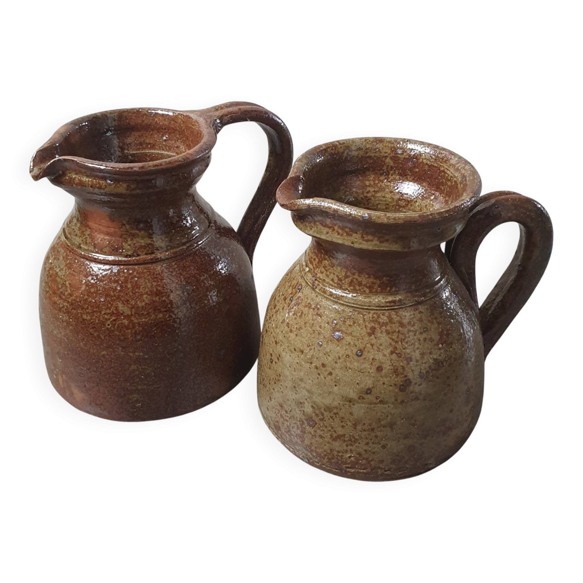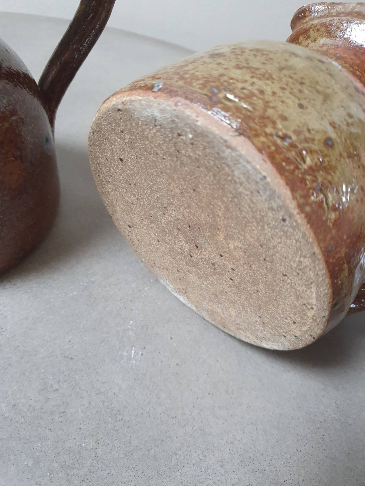 Set of two glazed stoneware jugs, speckled, in good general condition, brown in color. L: 15 cm W: 10 cm H: 14 cm
