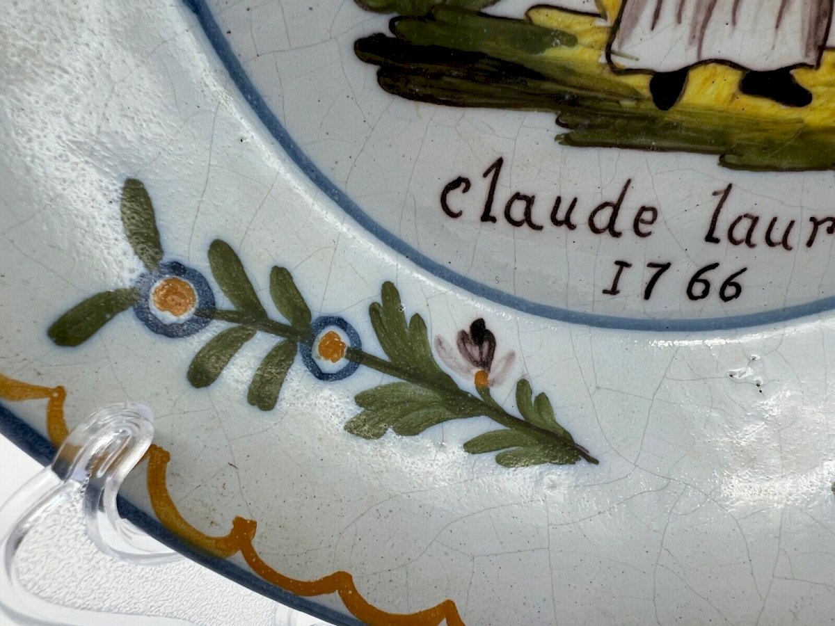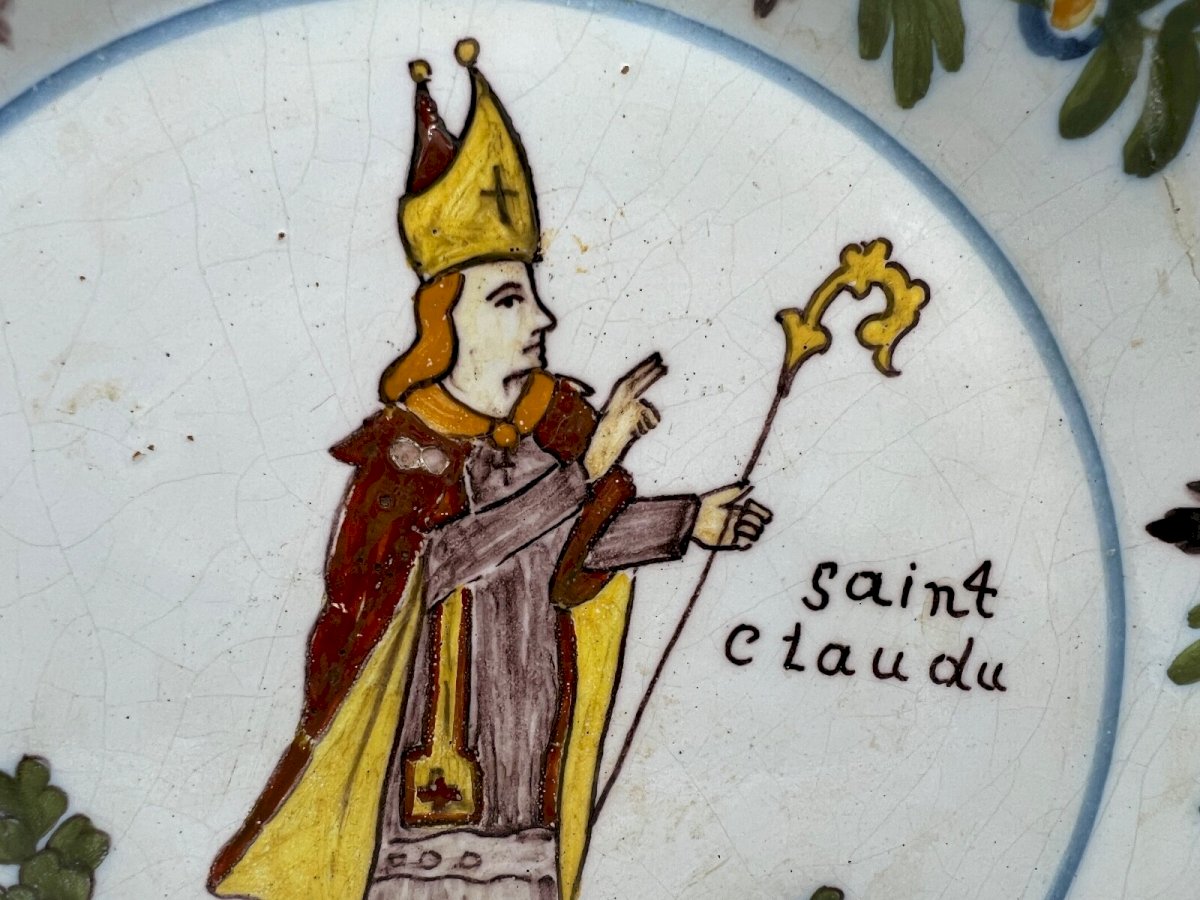 Nevers Faience Plate A faience plate from Nevers dating back to the late 18th century. Dated 1766. A hollow plate with a patronymic decoration at the center depicting Saint Claude on a mound, inscribed: Claude Laurent. By "patronymic faience," we mean a piece whose personalized decoration associates a first name, a surname, and a date with the image of a patron saint. In the 17th and 18th centuries, the immense religious fervor enjoyed by saints gradually loses its intensity: if they are mentioned in patronymic faiences, it is more out of habit and respect for tradition than from conviction. They are depicted with distinctive attributes that recall their function or the most significant episodes of their lives or martyrdom, symbolized by a palm. The images, of which it is hardly possible to determine the direct origin, are borrowed from a typology derived from the most conventional hagiographic iconography, which was also used at the same time in statuary, paintings, and engravings. It is certain that marriages, their celebration or commemoration, constituted the main occasion for such commissions. Numerous examples documented by archives show that the inscribed date corresponds in most cases to the manufacturing date of the piece, with a delay of about six months relative to the event being celebrated. These plates were most often ordered in several copies, with numbers varying from two to six, and occasionally reaching a dozen, and they were given as gifts to loved ones. Finally, it seems evident that in a domestic universe poor in images, their function was essentially commemorative and decorative, and the plates were typically placed in the china cabinet, while the bowls could be hung on the wall thanks to two holes on the back provided for that purpose. Saint Claude Bishop of Besançon. Initially a soldier, he embraced monastic life at Condat in Jura before being elected bishop of Besançon. But as soon as he could, he resigned this position to return to solitude. His monastery and the nearby village took his name, and the diocese placed itself under his patronage: 500 years after his death, thanks to the intact preservation of his body, many pilgrims flock to the abbey where miracles abound. The pilgrimage to Saint-Claude then enjoys a reputation equal to that of Lourdes today. Notable pilgrims include King Louis XI, Saint Jeanne de Chantal, and Saint Francis de Sales. The body of the saintly miracle worker is displayed twice a day for the piety of visitors who kiss his hands and feet. Numerous miracles are recorded in manuscripts and attested by the presence of witnesses, including that of a dead child brought back to life. This is why Saint Claude is often depicted with a child. With the French Revolution, an iconoclastic madness overtakes the representatives of the people. The body of Saint Claude was burned in 1794; only the left forearm survived, authenticated by one of the doctors who had examined the body fifty years earlier. This forearm is still preserved today in a reliquary in the cathedral. Condition: a piece of the edge of the wing has been re-glued, small chip on the edge. Diameter: 23.5 cm Height: 4 cm Country of origin: France
