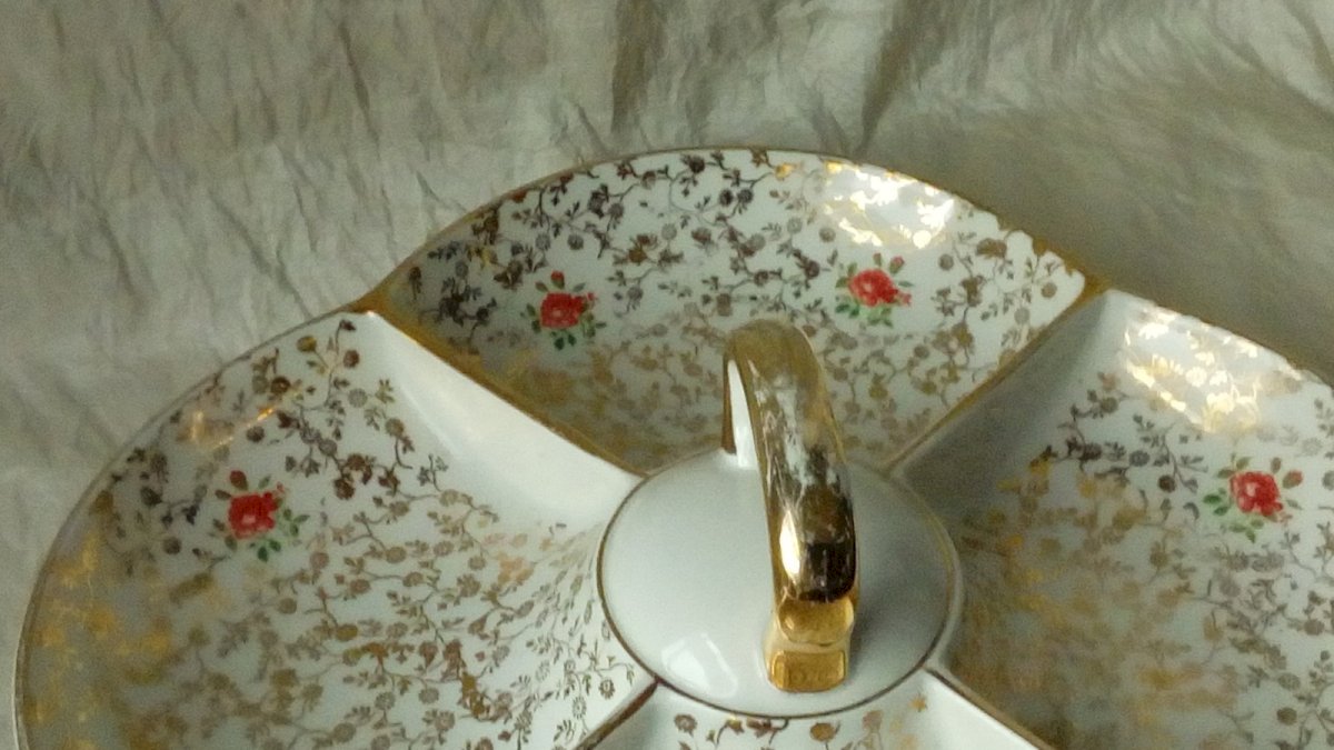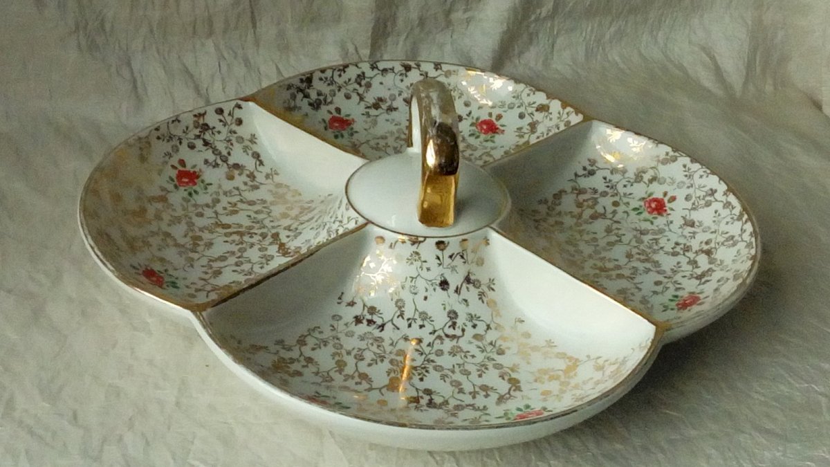 PLATEAU APPETIZER IN MENDIANT FAIENCE WITH 4 COMPARTMENTS VILLEROY BOCH METTLACH FRANCE-SAAR UNSIGNED PLATE FLORAL DECOR DIAMETER 30 cm HEIGHT 7 cm LIGHTLY FADED GILDING ON THE HANDLE VISIBLE IN THE PHOTOS Country of origin: Germany