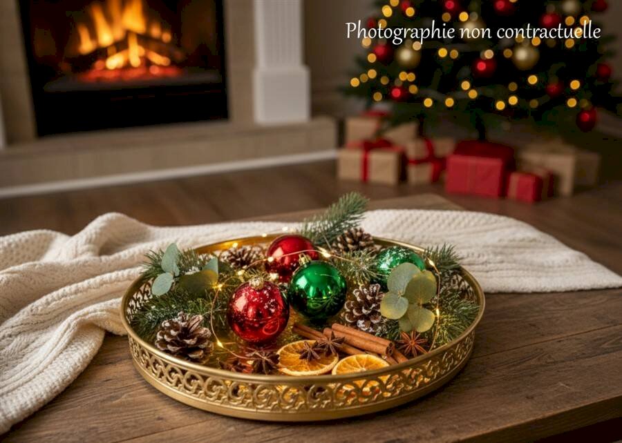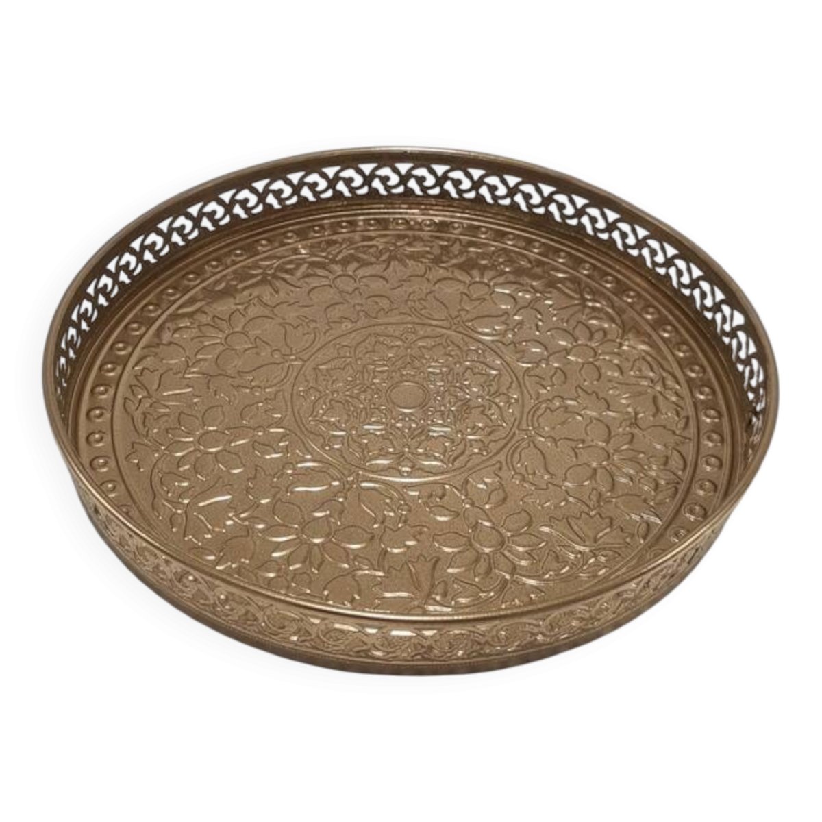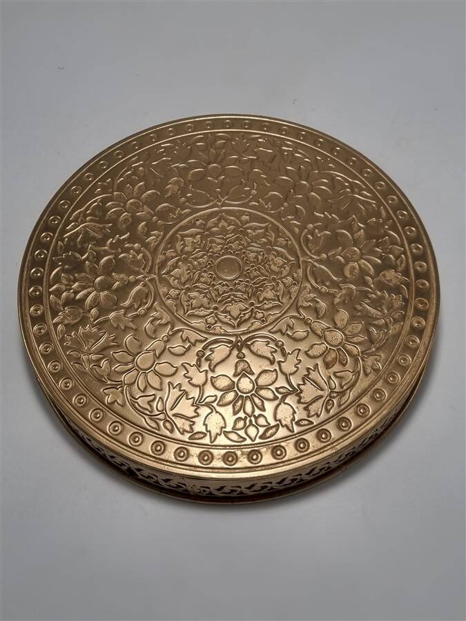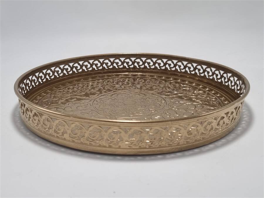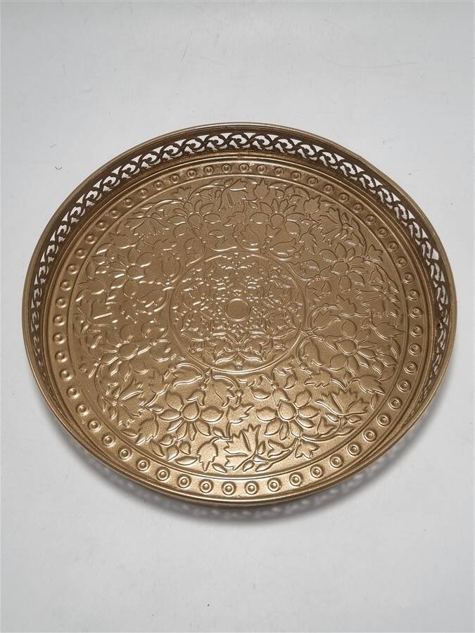 Round metal tray, painted gold.
