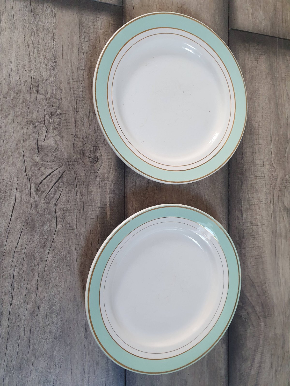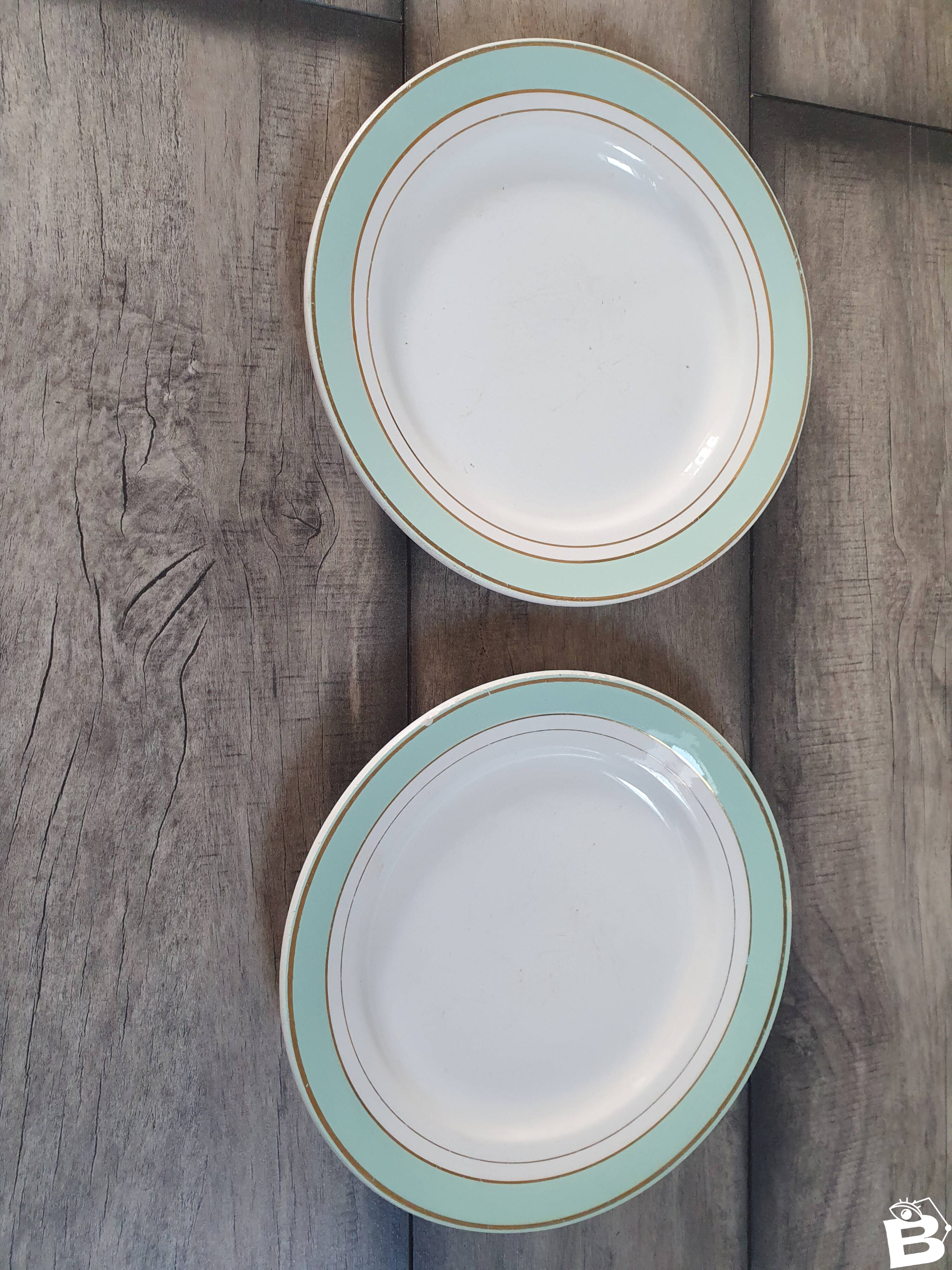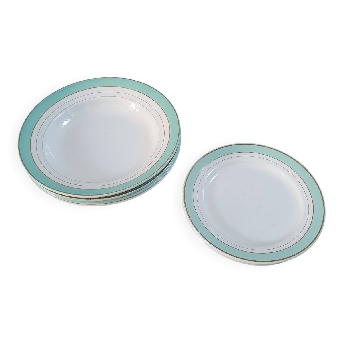 Set of 4 antique deep plates, porcelain, gold rim, mint green, Regency collection, Lunéville. Plate diameter: 22.5 cm. + 2 small bowls, Epinay model, Lunéville. Plate diameter 18 cm. A bit worn over time, I note a few micro impacts on the 2 small bowls. Condition is fair. L: 22 W: 22 H: 4