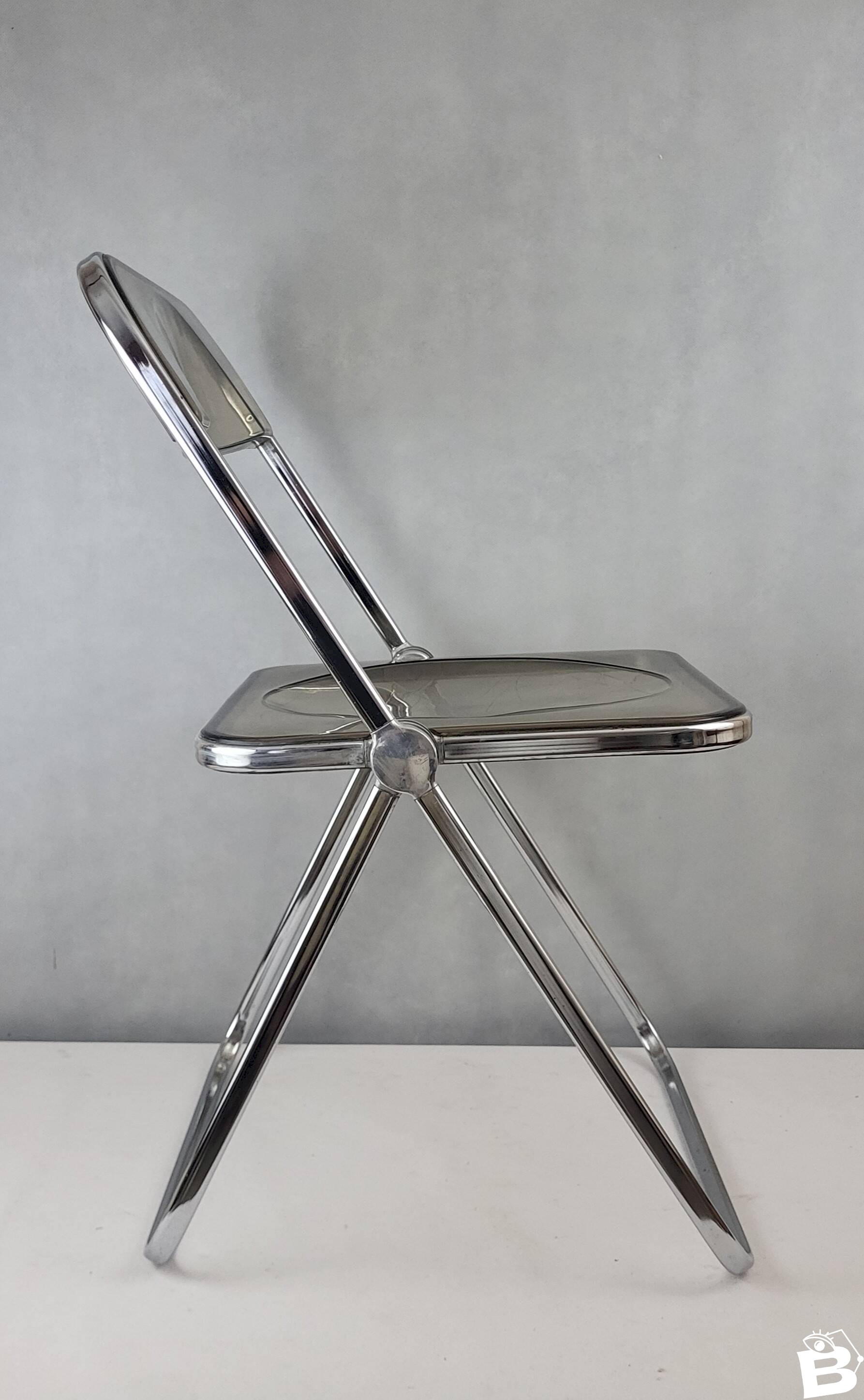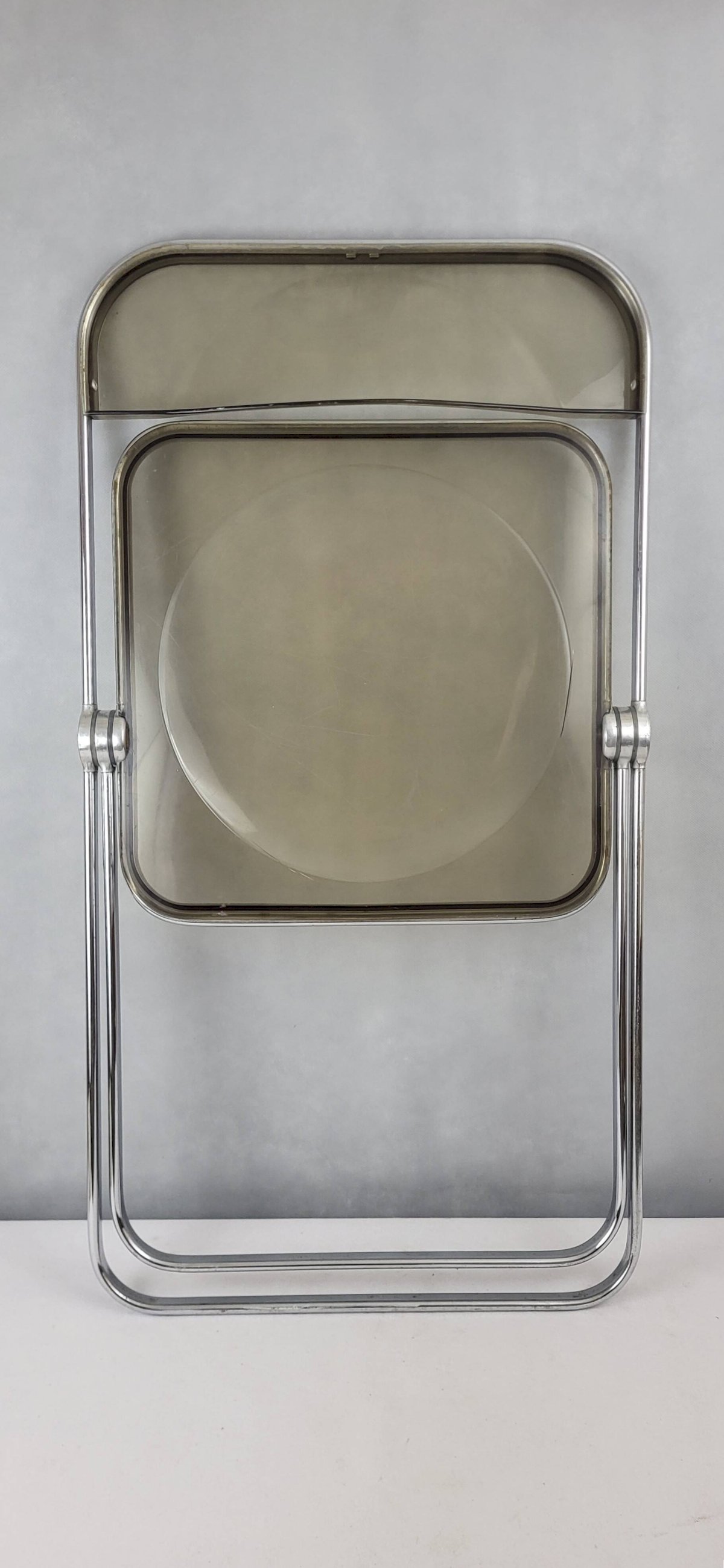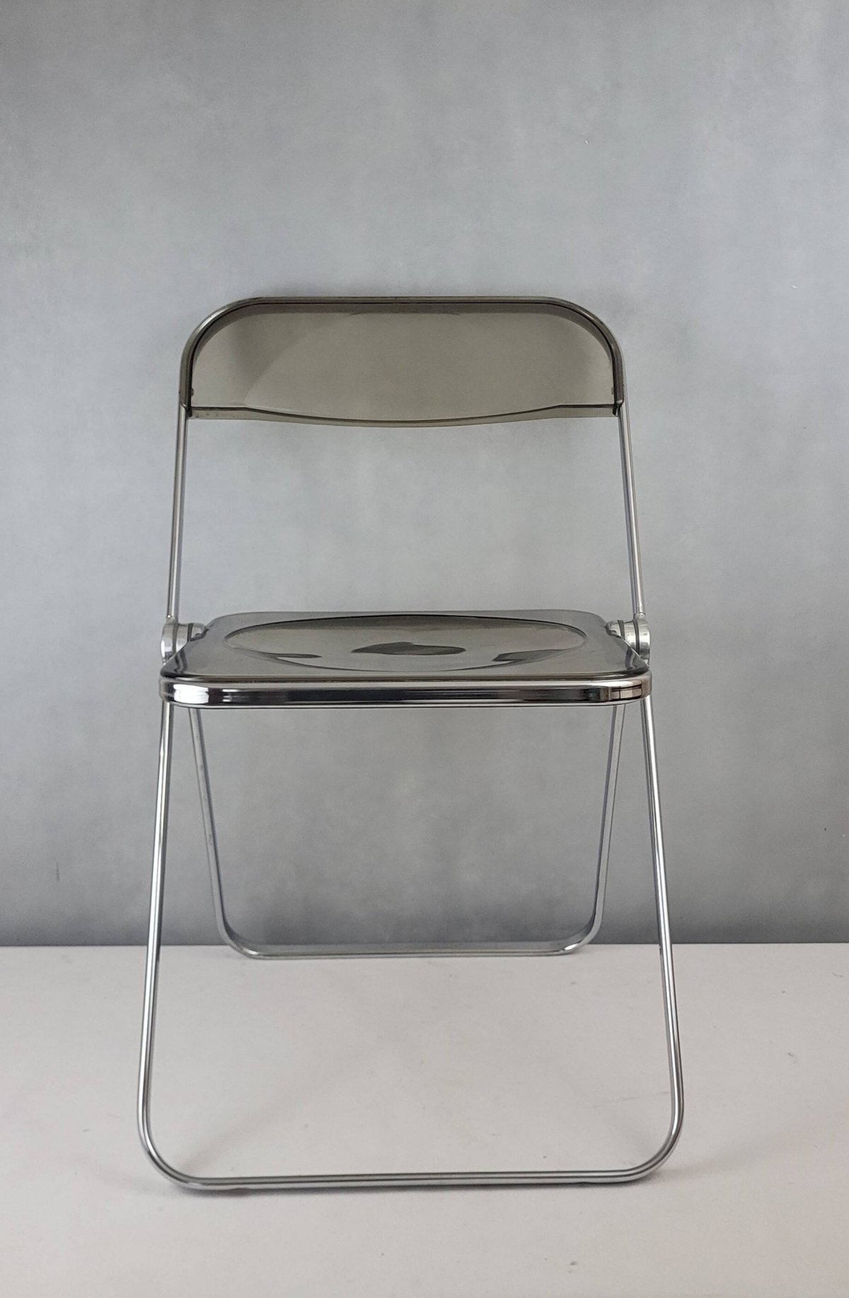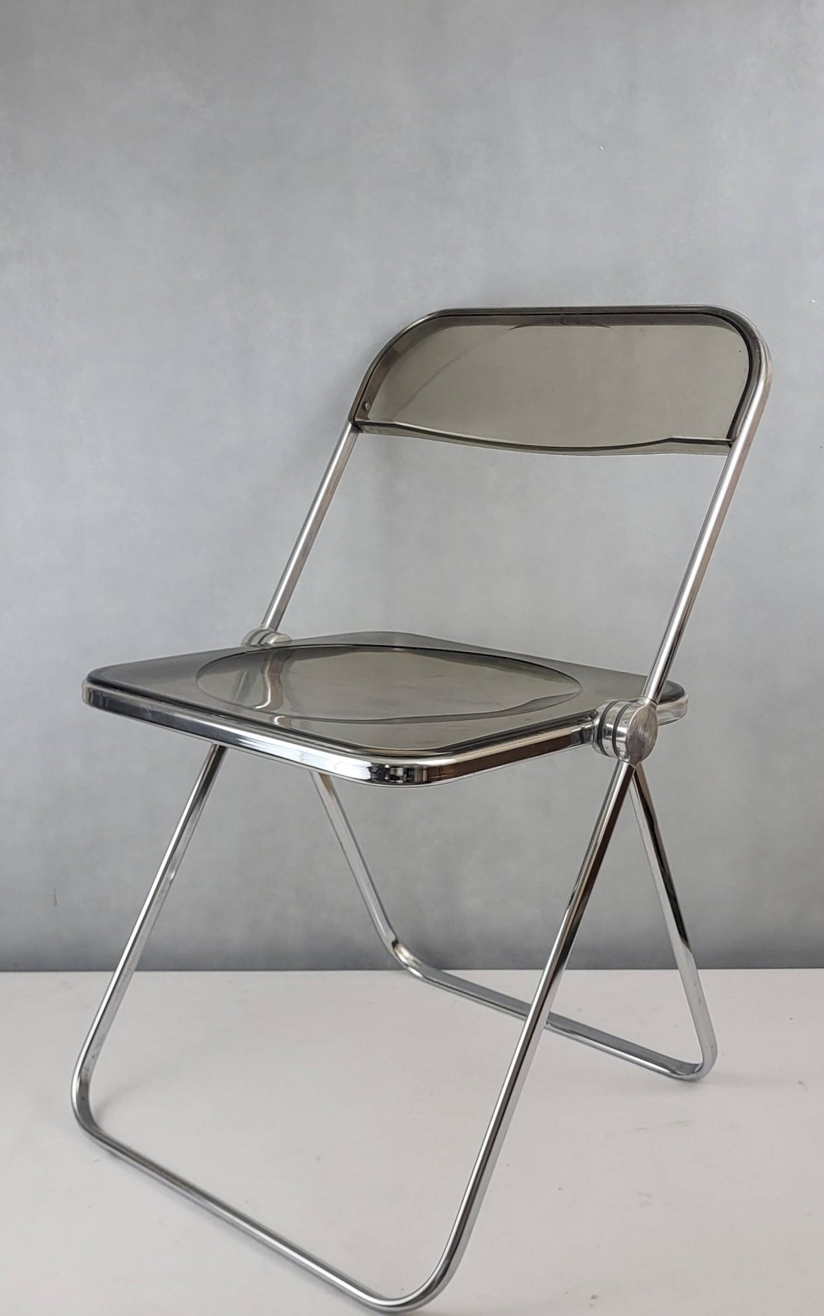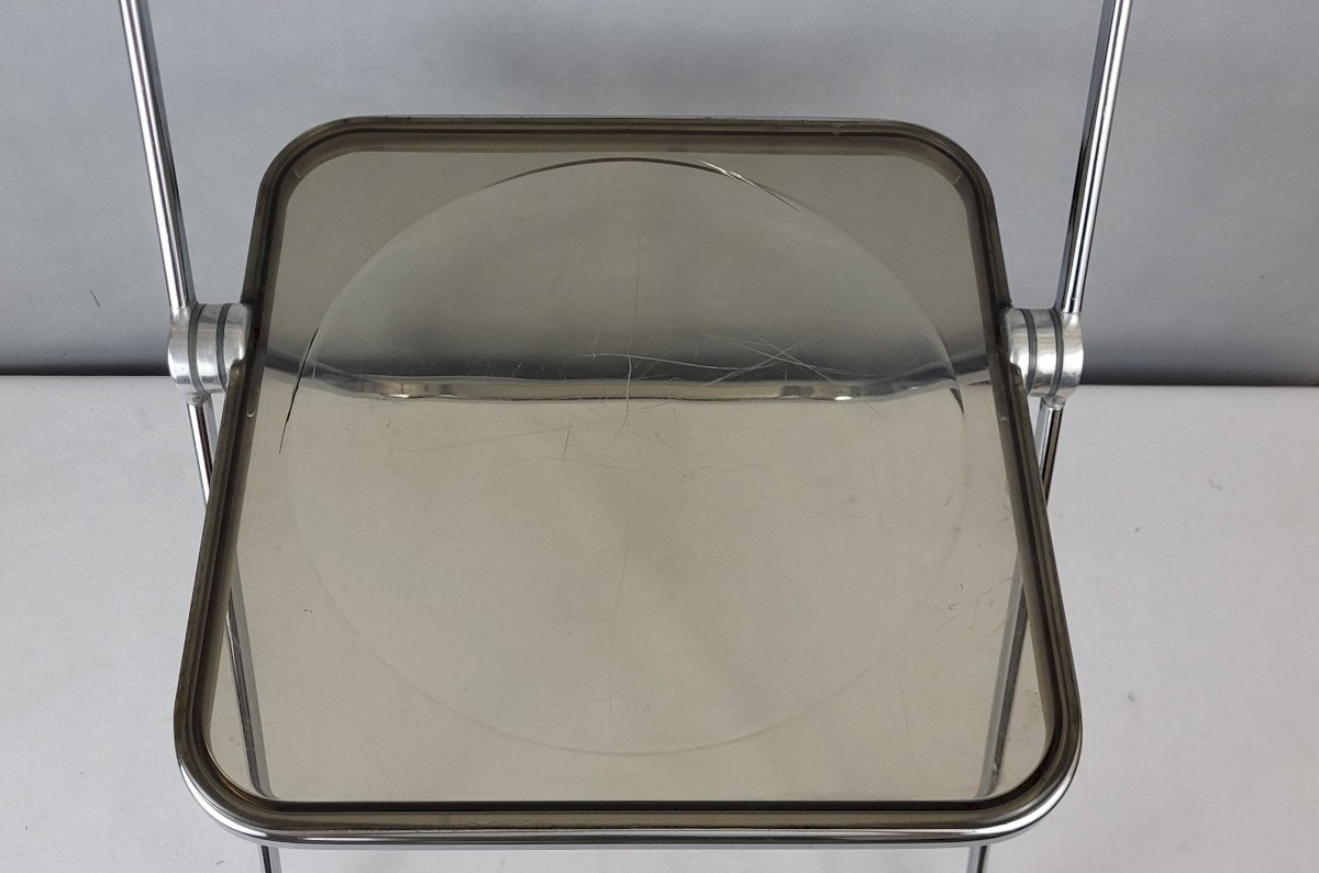 PLIA chair by Giancarlo Piretti for Castelli Italy 1970s / Chromed metal & smoked plexiglass. Height 75 cm. Seat height 43 cm. Width 45 cm. Depth 46 cm. In good condition (structure) and functional. There are micro scratches from use on the entire chromed metal (minimal), oxidation on the feet (stabilized), scratches from use on the plexiglass. L: 45 W: 46 H: 75