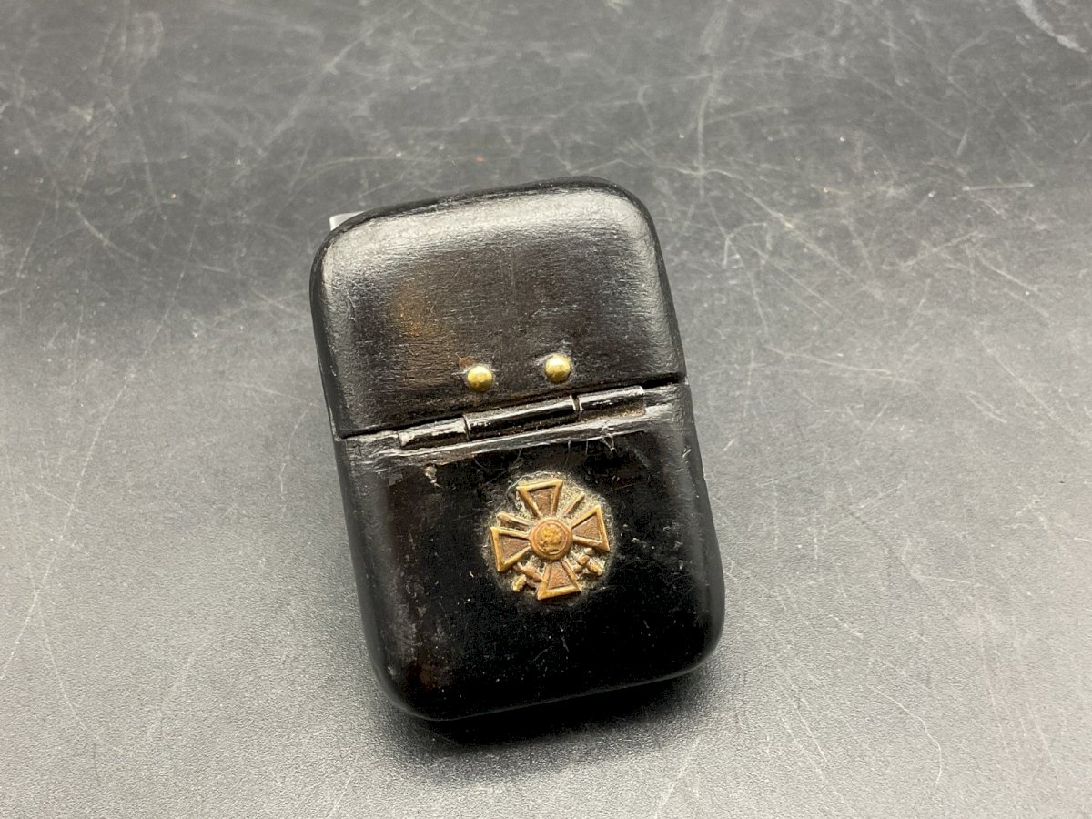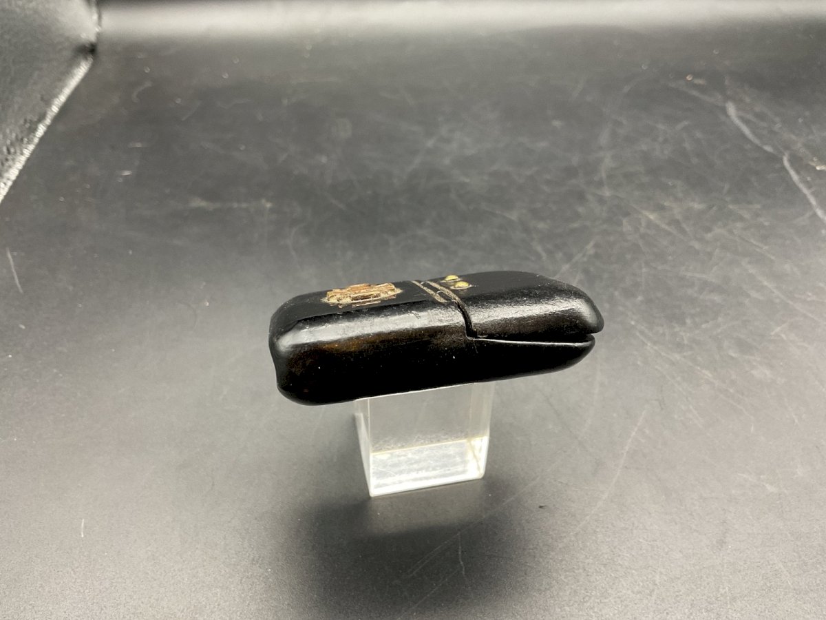 Pocket matchbox made of papier-mâché with military cross. Dimensions: 5.4 x 3.8 cm Condition: Used item. Please refer to the seller's description for more details on possible imperfections. Era: Antique (before 1900) Type: Matches: Box Style: Carved, Engraved Material: papier-mâché.
