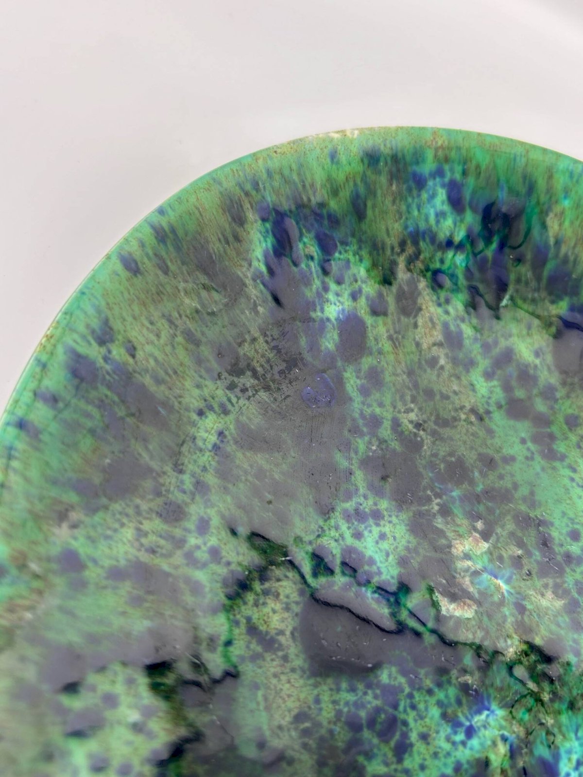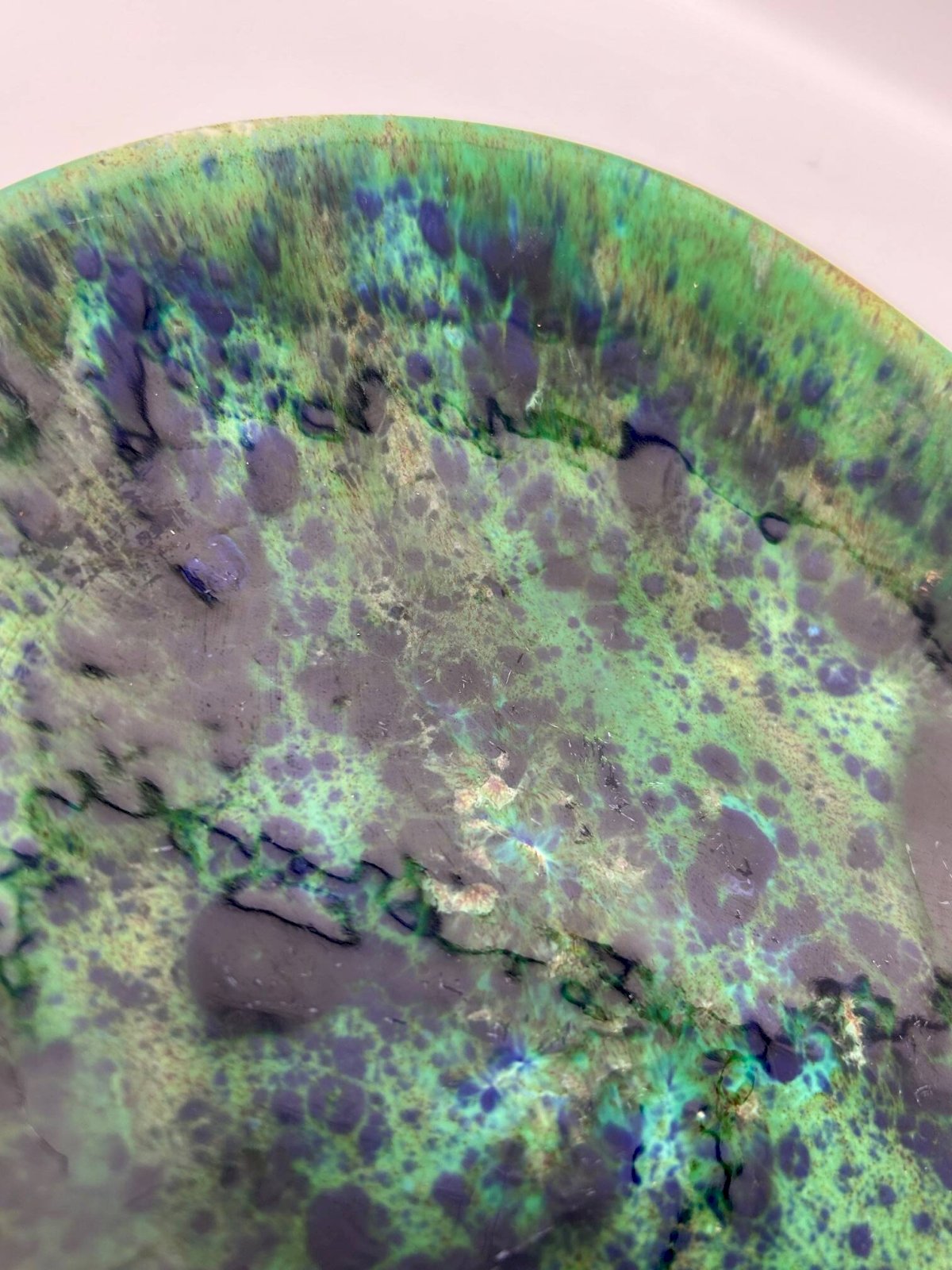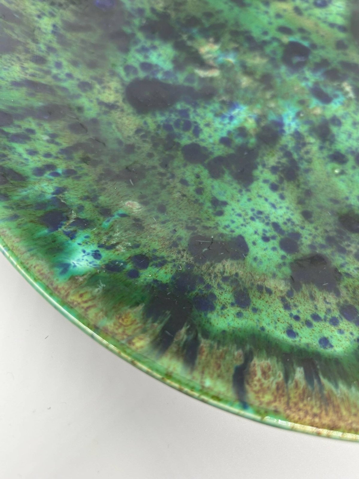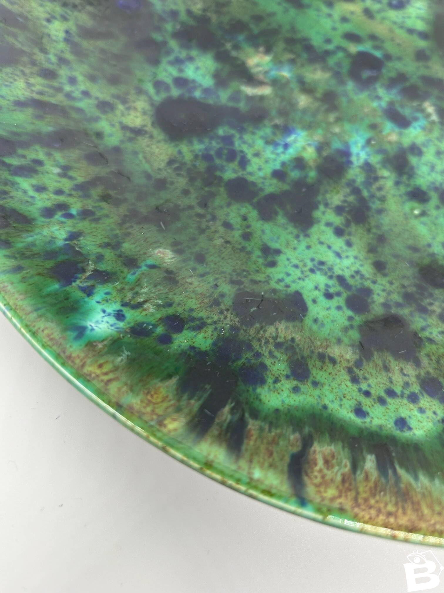 Ceramic catchall signed Morvan. The Morvan ceramics were created in 1932 by Gaston Gaubier, who came from a large family in ceramics. Morvan ceramics are recognizable by their so-called flamed earthenware, glazed with colored oxides. L: 25 W: 22 H: 3
