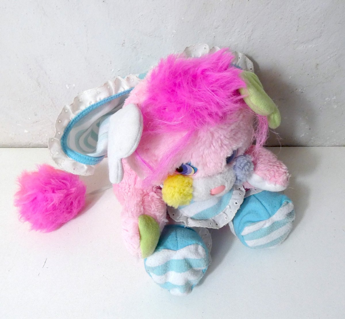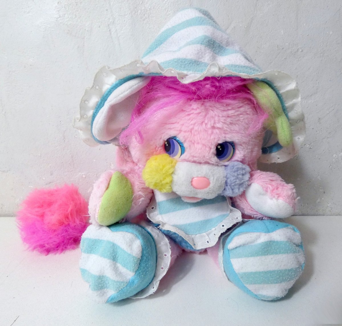 Popples Baby Cribsy Plush / vintage. MATTEL. In very good condition, with superficial signs of use and aging. The rattle hidden in the tail pompom is in very good condition. Baby Cribsy is complete with his nightcap, bib, and two booties. Condition: Used: Item has been used. See seller's description for more details... Used: Item has been used. any imperfections.