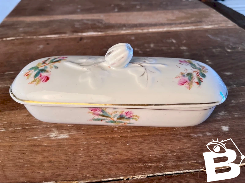 Candy box / Jewelry box White porcelain with rose decoration / silver border
