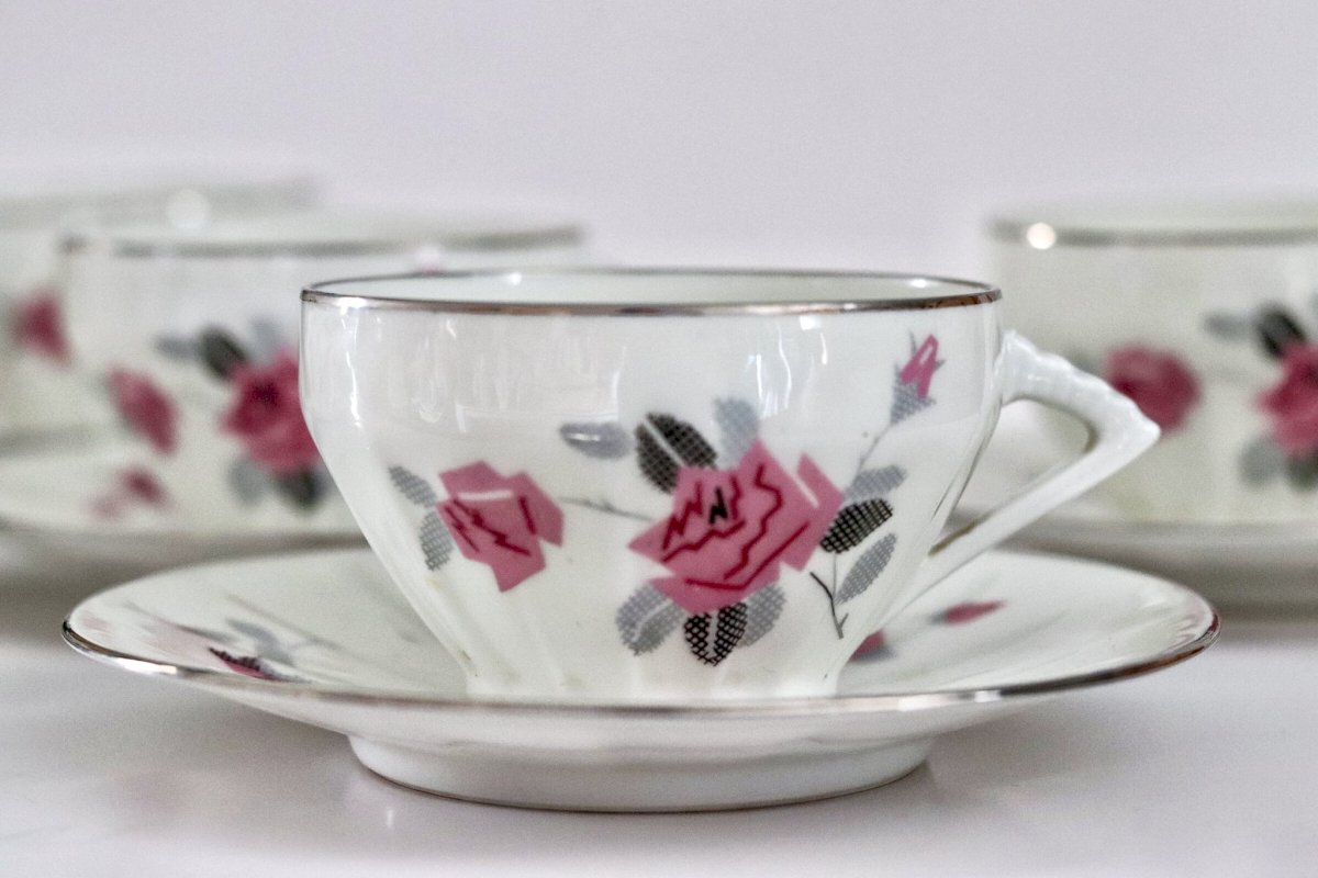 •Floral decoration in delicate shades of pink, enhanced by fine silver trims and lovely handles with a modernist shape.