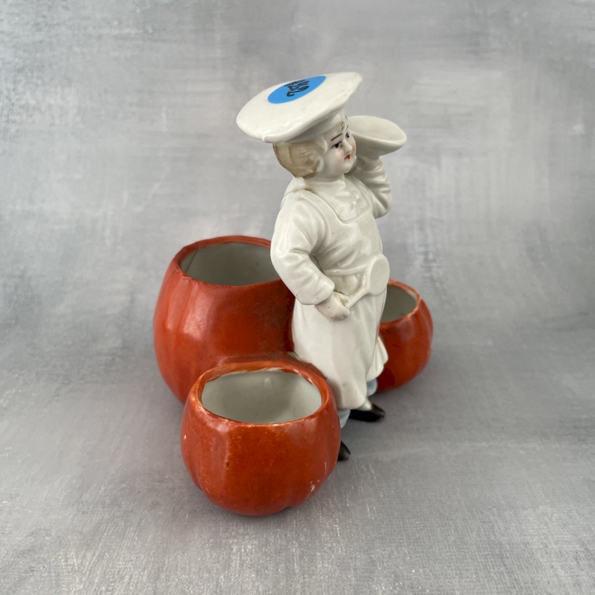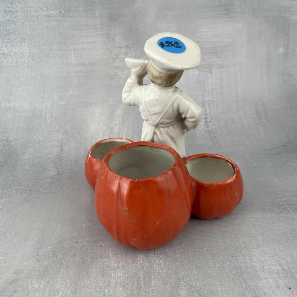Porcelain condiment service, chef and pumpkin / pumpkin salt pepper mustard Height ~ 10.5 cm Base dimensions ~ 10 x 7 cm Total weight ~ 160 g Cracks and chips, see photos. Remember to combine your purchases to reduce shipping costs! Condition: Used Item has been used. any imperfections. Subtype: Set, Salt and Pepper Shaker Material: Ceramic, Porcelain