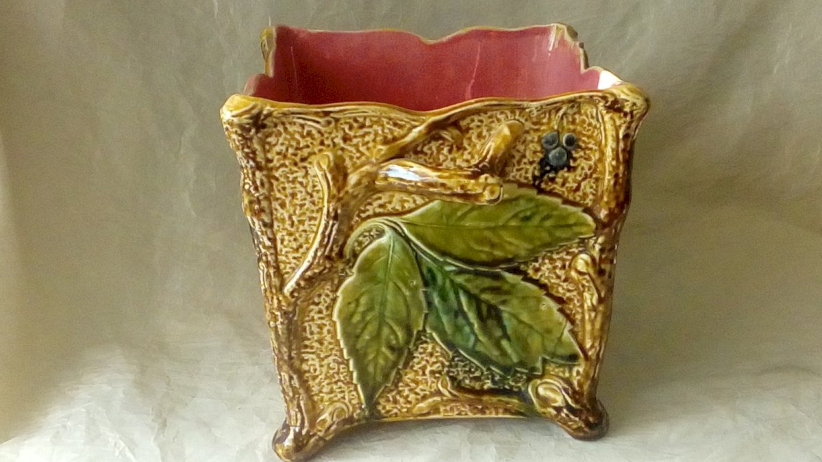 VERY BEAUTIFUL AND ANCIENT FLOWER POT IN BARBOTINE FROM THE ART NOUVEAU PERIOD LATE 19TH CENTURY DECORATED WITH GRAPE LEAVES SIGNATURE TO DECIPHER I DID RESEARCH BUT FOUND NOTHING HEIGHT 18 cm 17 cm ON THE SIDE SMALL CHIP ON THE EDGE VISIBLE IN PHOTOS NO CRACKS