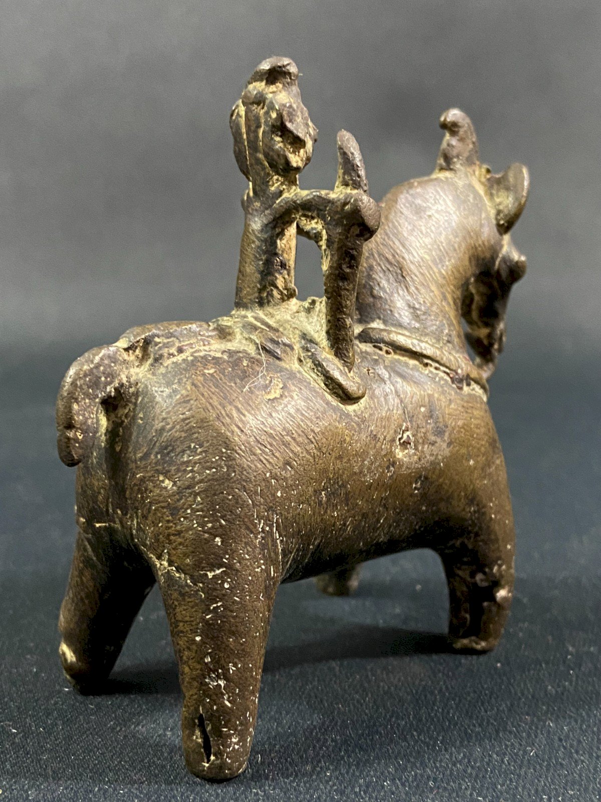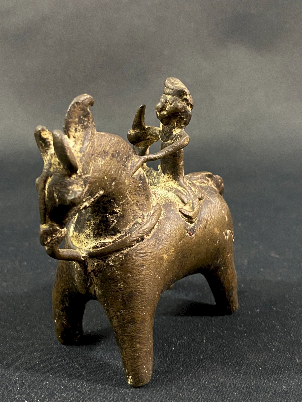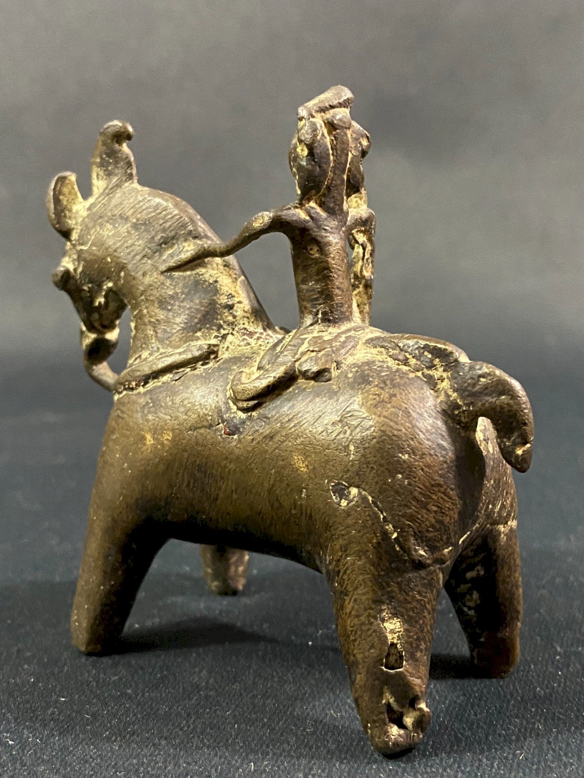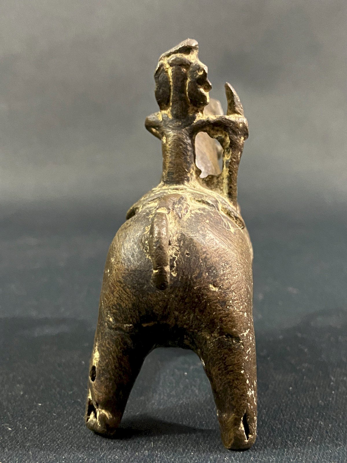 Prestige cavalry figure of the Mossi in bronze from Burkina Faso (Upper Volta), mid-20th century. Symbol of authority and power of the ancient Mossi cavalry kingdoms. Lost-wax casting. Stocky horse with curved ears, detailed reins and collar. Prestige piece with a brown patina. Maximum dimensions: 8.5 x 3.7 x Height 8.6 cm. Weight: 240 grams. Signs of wear and minor casting defects. Very careful shipping worldwide. Authenticity: Original. Type: Figurine, Statue. Origin: Africa. Country of manufacture: Burkina Faso. Material: Bronze.