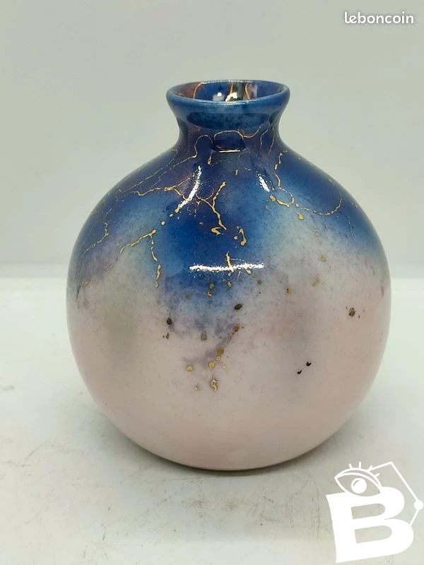 Beautiful small antique blue and white vase with gilded inlays, bearing a mark and surrounded by the text "porcelain from France." Charming, uncommon design, height 11 cm and diameter 9.5 cm...