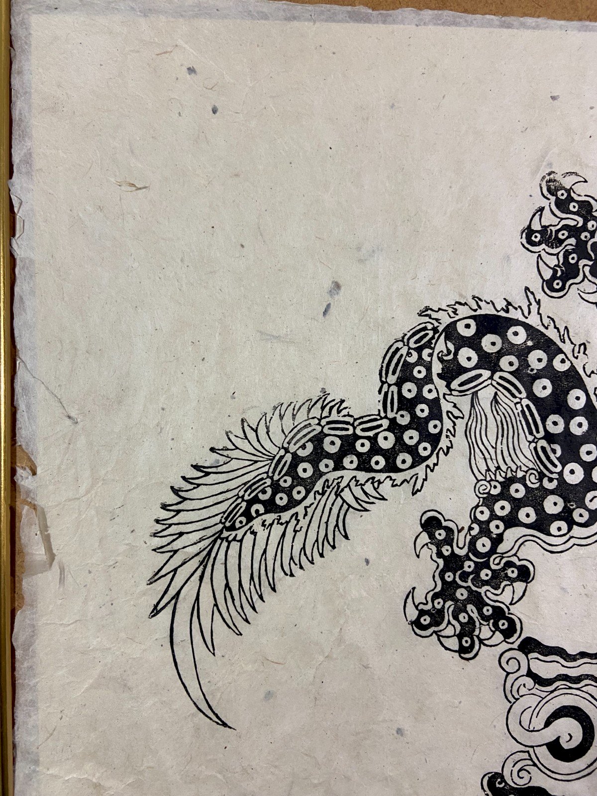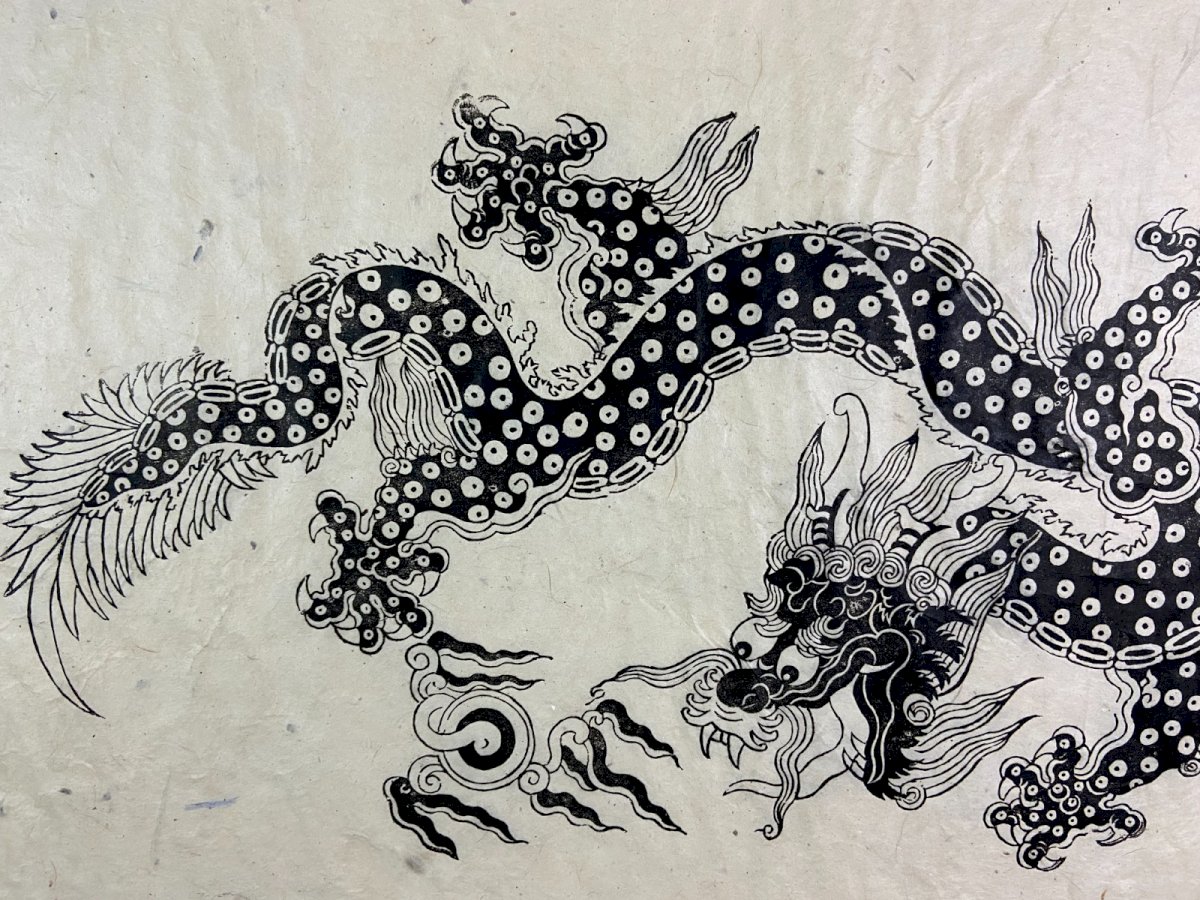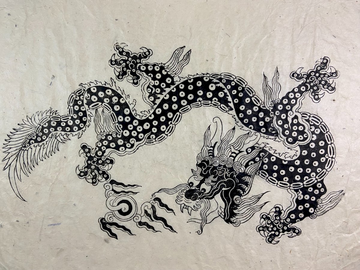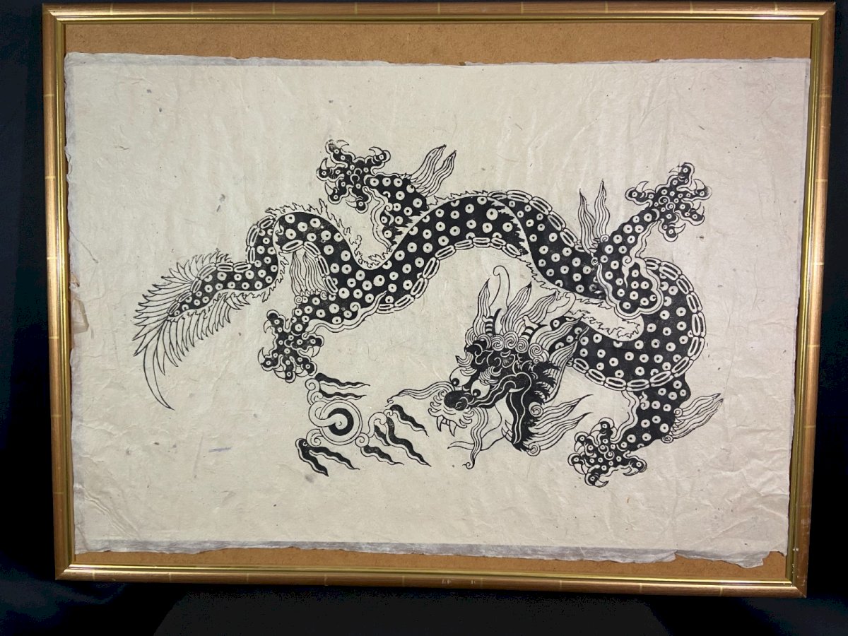 Superb Asian print depicting a five-clawed imperial dragon, an exclusive symbol of the emperor and celestial power. The drawing is executed in black ink on very fine and fibrous handmade paper, with a visible texture, probably rice paper (xuan) or mulberry paper (kozo). The outlines show variations in density typical of a woodblock print, which has been enhanced by hand to strengthen the blacks. China 19th century: the very fibrous paper with irregular edges confirms an old artisanal, non-industrial print. The subject features the five-clawed imperial dragon breathing the flaming pearl - a symbol of power, prosperity, and mastery of the elements: decorative motifs from the Qing dynasty (1644 - 1911), a period when imperial dragons appeared on banners, robes, and hangings. The piece is adhered to a thick sheet of contemporary quality paper. This is itself positioned within a modern frame with gilded moldings (which can be easily removed). I would note only slight small tears along the edge. Maximum dimensions with frame: 83.3 x 63.3 cm / Dimensions of the print only: 79 x 53.5 cm Total weight: 1569 grams. Very careful shipping worldwide. Authenticity: Original. Type: Print. Period: 19th century and earlier. Country of origin: China. Support: On paper. Genre: Qing dynasty China. Features: Framed. Theme: Animals.