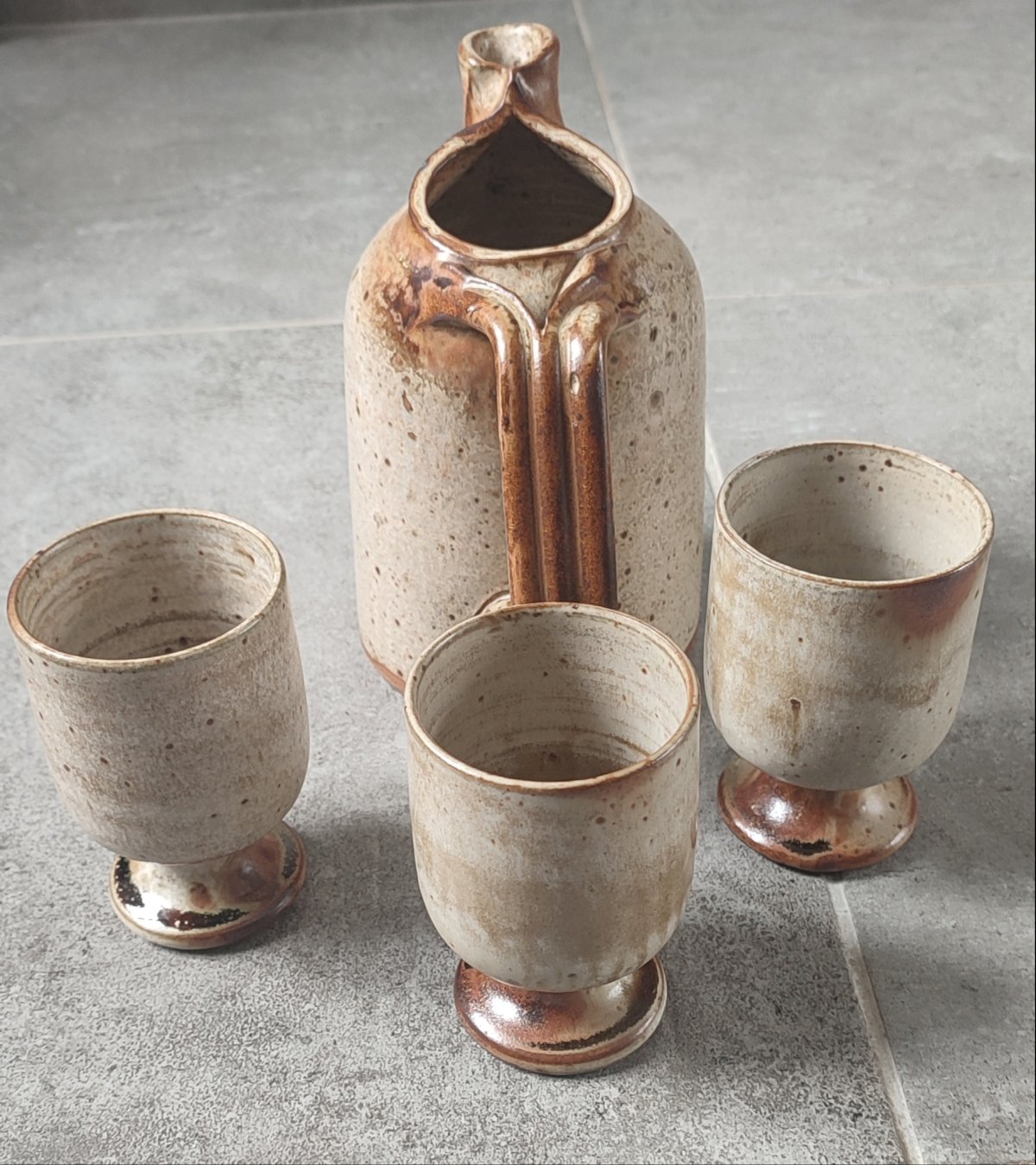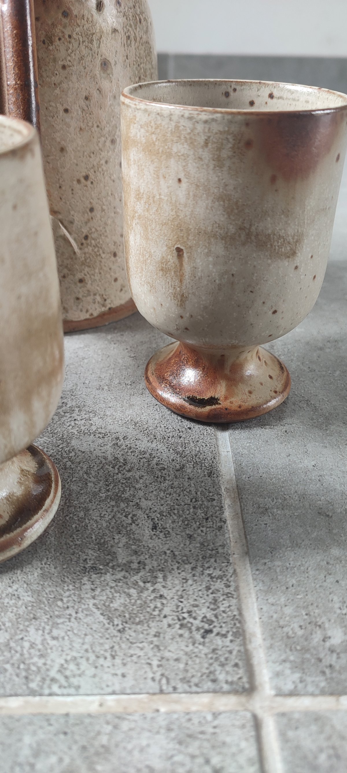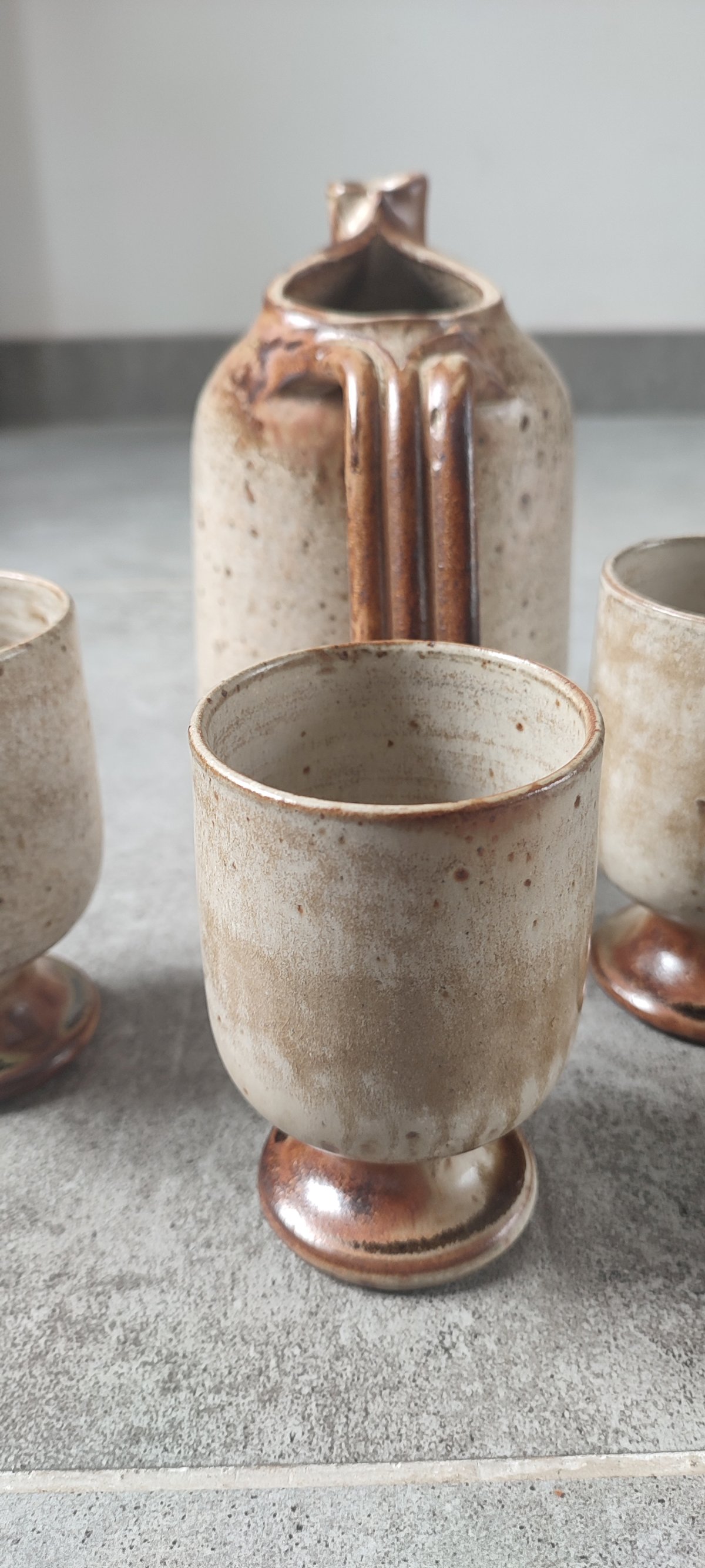 "Trio" service including a rounded pitcher with an asymmetrical neck and pinched spout featuring a sculptural and authentic silhouette, particularly on-trend, and three stackable goblets on a pedestal, made by Jean-Pierre Prud'homme (with the signature "JP" incised under the base and numbered).