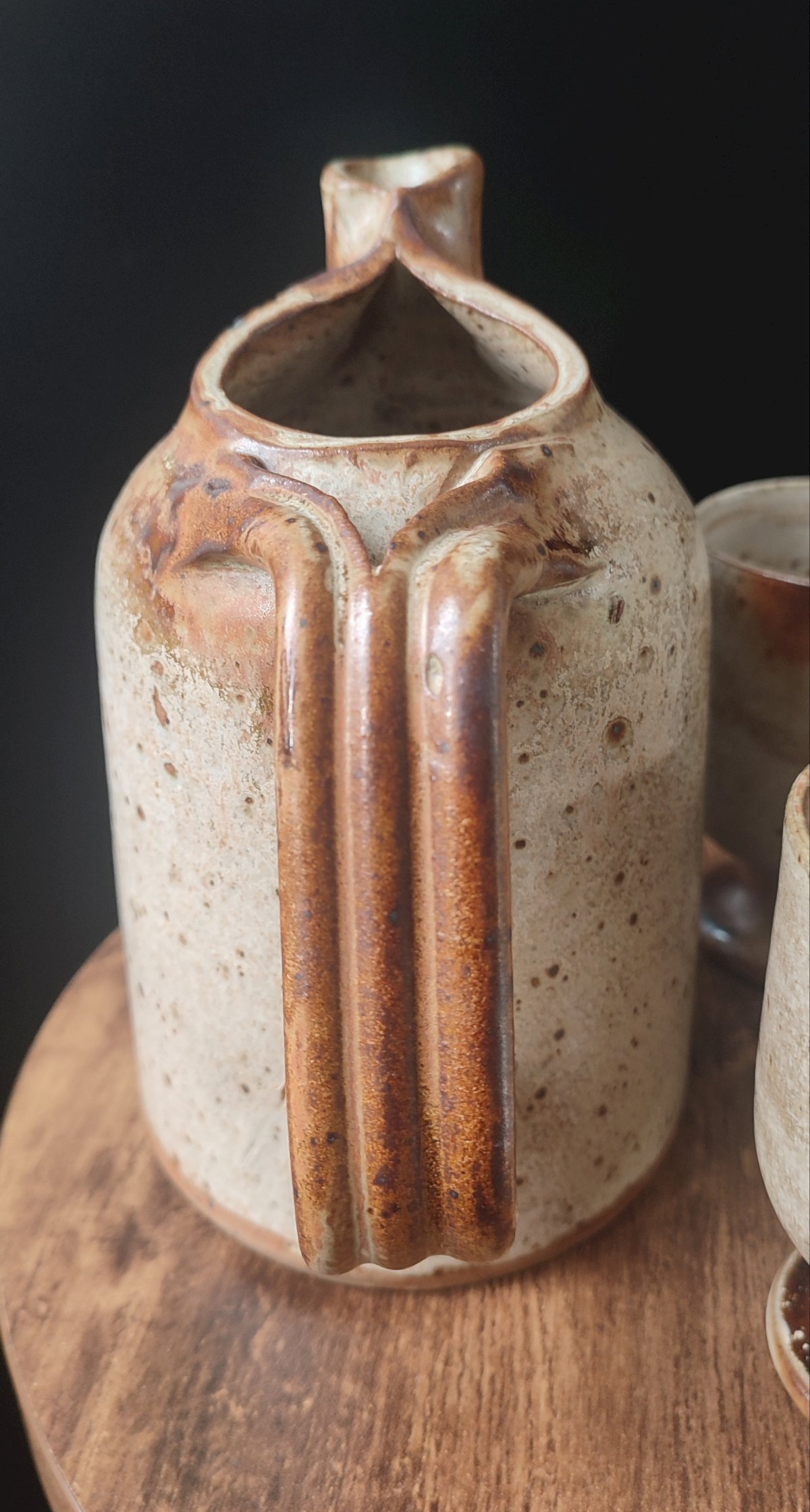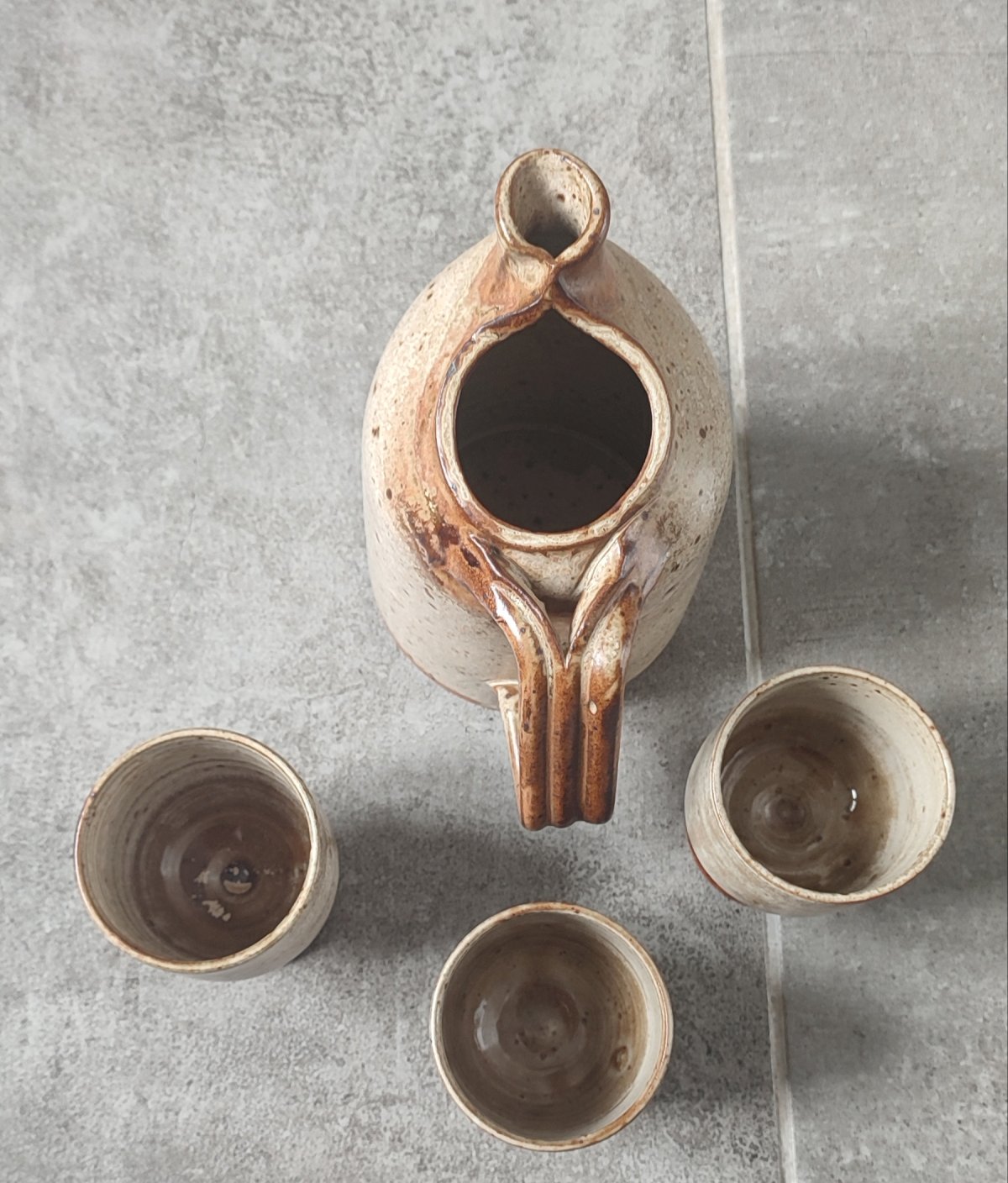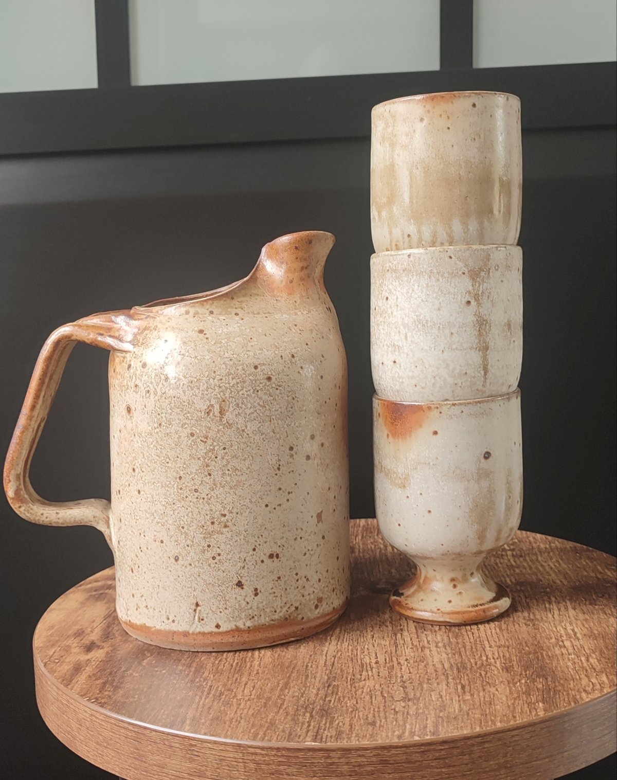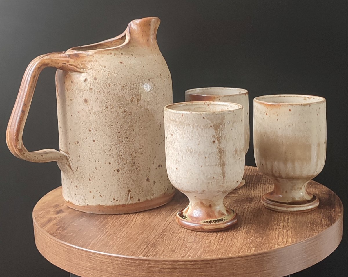 "Trio" service including a rounded pitcher with an asymmetrical neck and pinched spout featuring a sculptural and authentic silhouette, particularly on-trend, and three stackable goblets on a pedestal, made by Jean-Pierre Prud'homme (with the signature "JP" incised under the base and numbered).