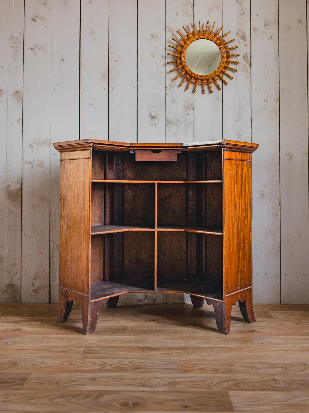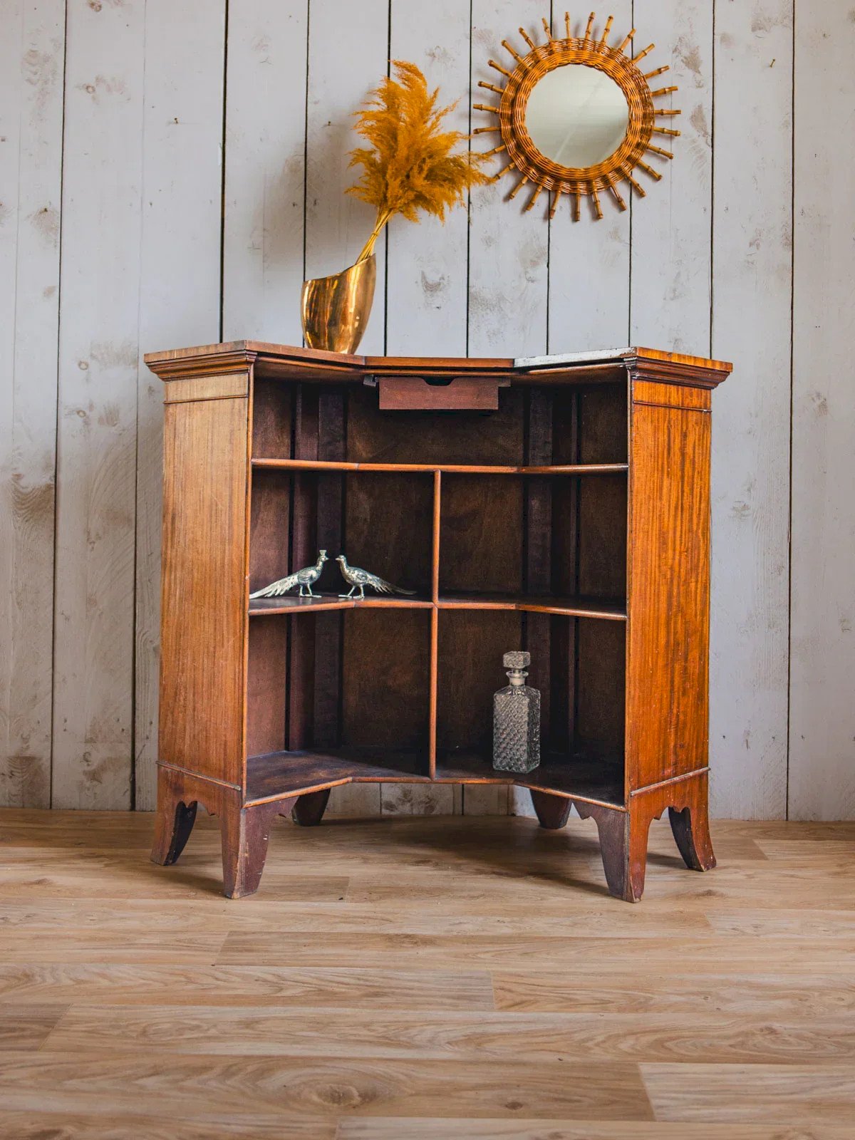 Adopt this dark wood counter bar with a sober and warm charm, whose deep patina enhances its presence in a contemporary or more traditional interior. Its generous width offers a comfortable service area for receiving and organizing glasses and bottles, while its simple lines bring a discreet elegance to your convivial space. Ideal for animating an open kitchen or structuring a living room. Signs of time present, superficial scratches, and a discreet shine. Length: 125 cm Width: 36.5 cm Height: 106 cm Height of niches: 18 / 27 / 35 cm Interior depth: 28 cm Condition: Used: Item that has been used. Item showing some superficial signs of wear, fully operational and functioning properly. It may be a demonstration model or an item returned to the store after a short period of use. possible imperfections. Brand: Debongout Type: Curated product Material: Wood Style: Contemporary Customized: Bar furniture
