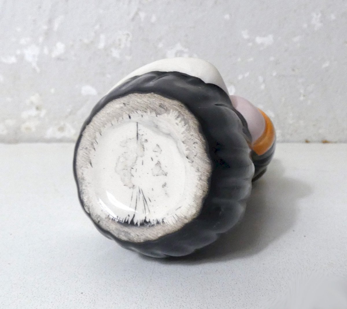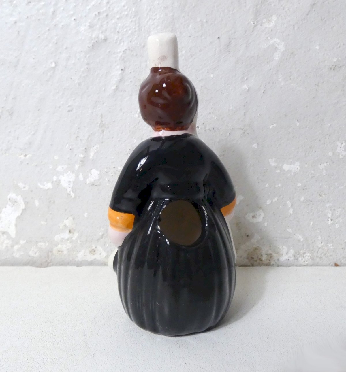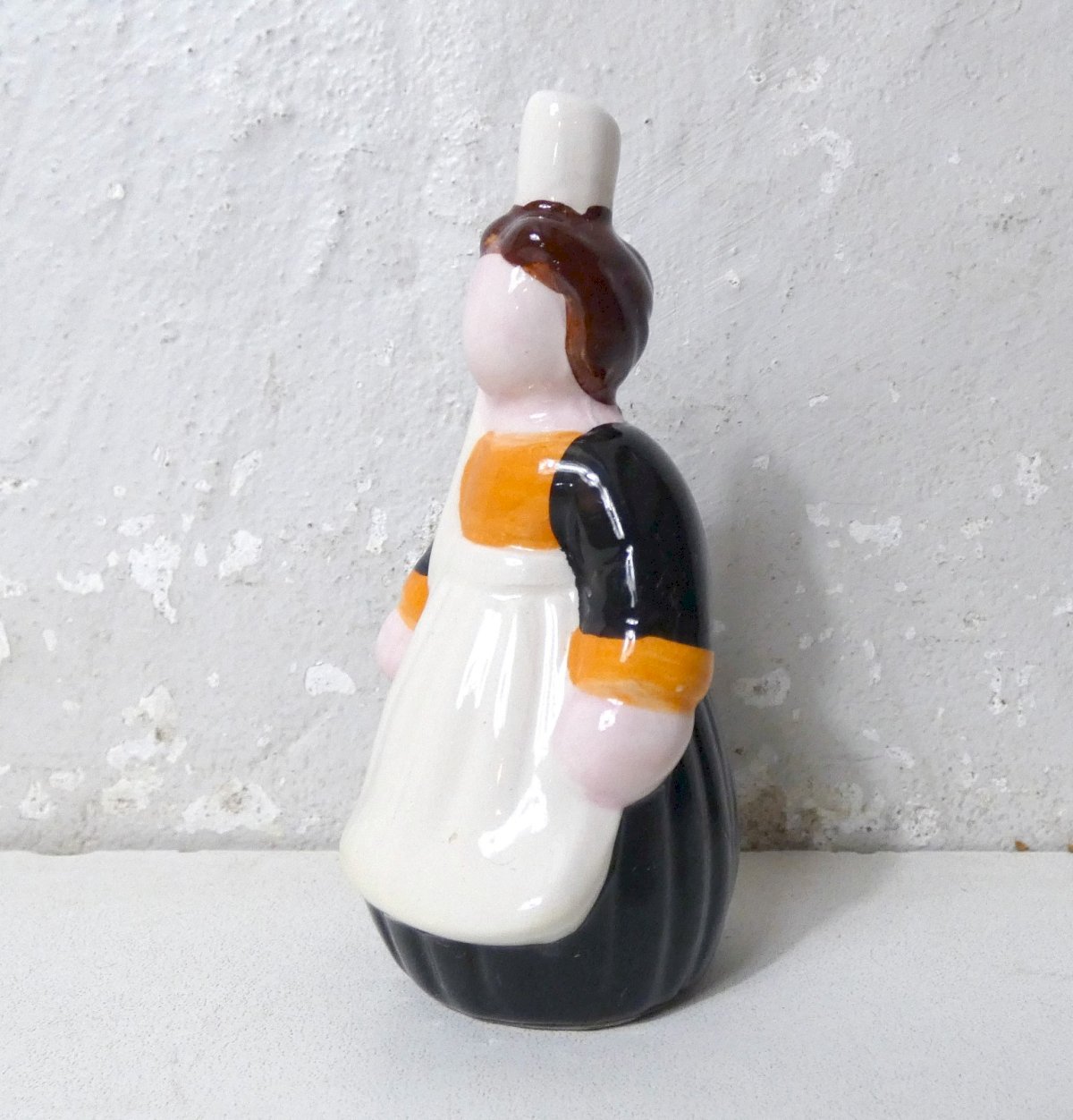 Quimper style, or Maï workshop, Breton pottery. Small bigoudène in faïence, with a hole at the back to place toothpicks. Height: 11 cm. Width: 5.5 cm. Depth: 5 cm. In excellent condition.