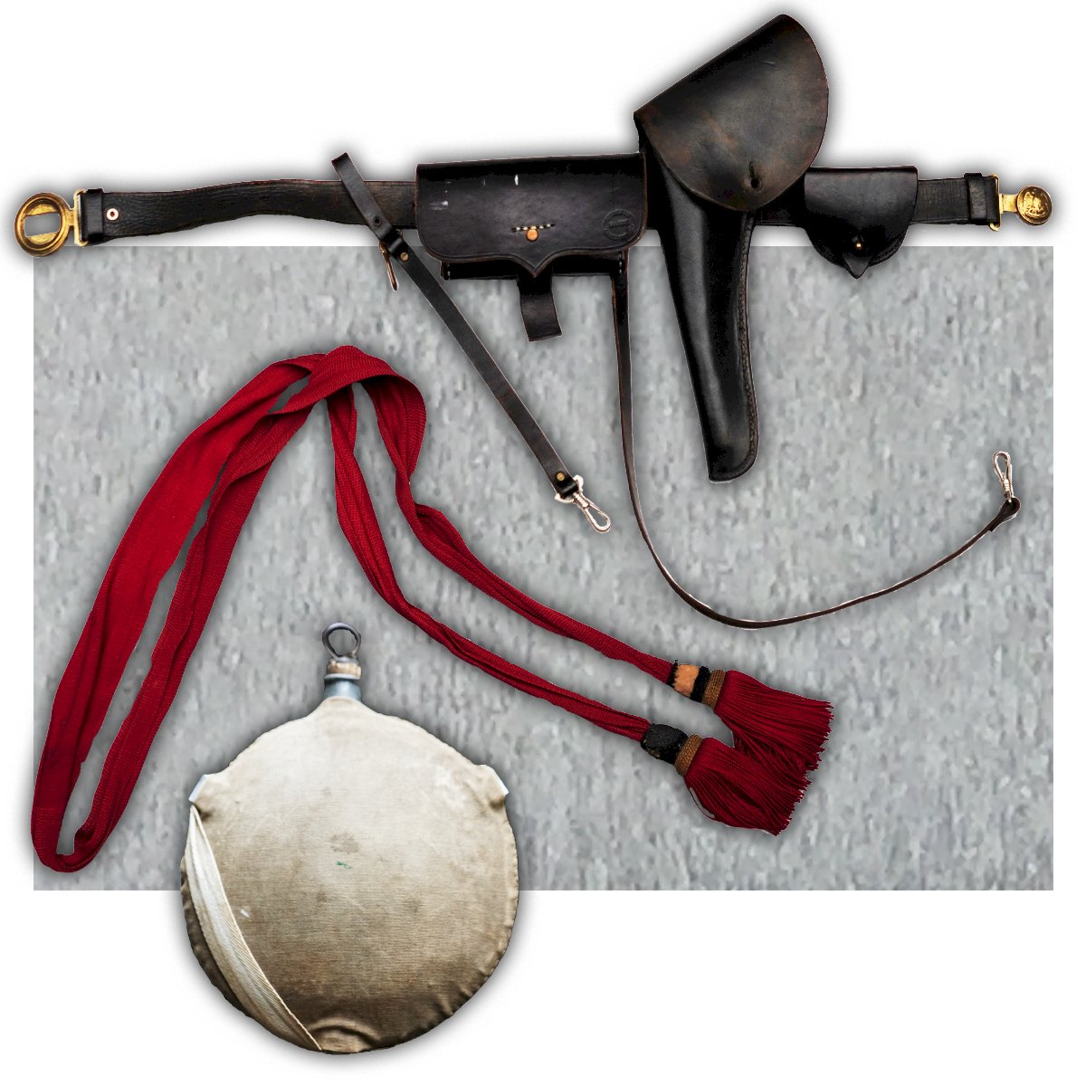 LOT: JACKET + PANTS + CAP + SCARF + CANTEEN + HOLSTER + AMMO POUCH + BELT