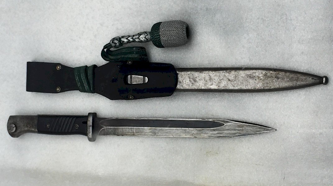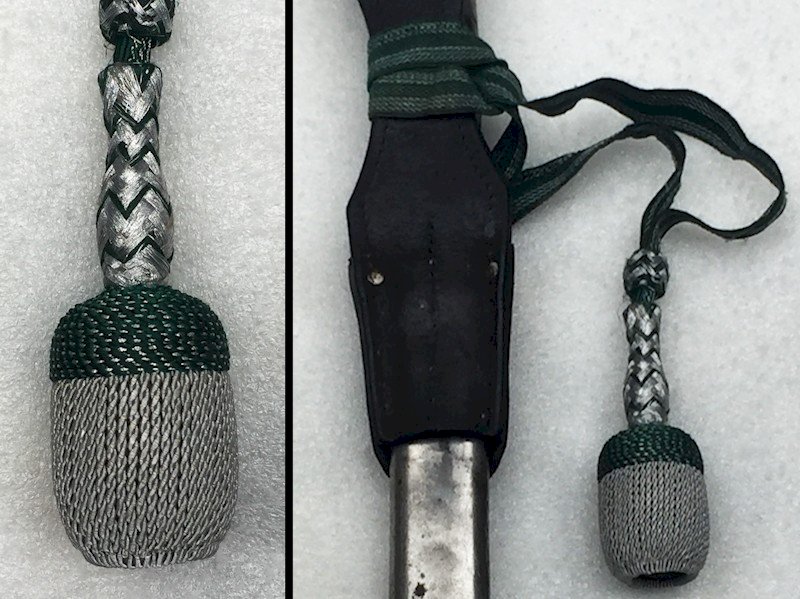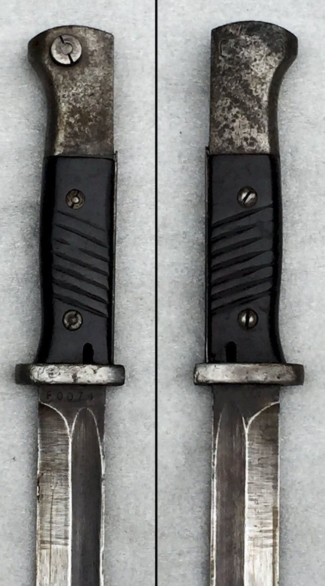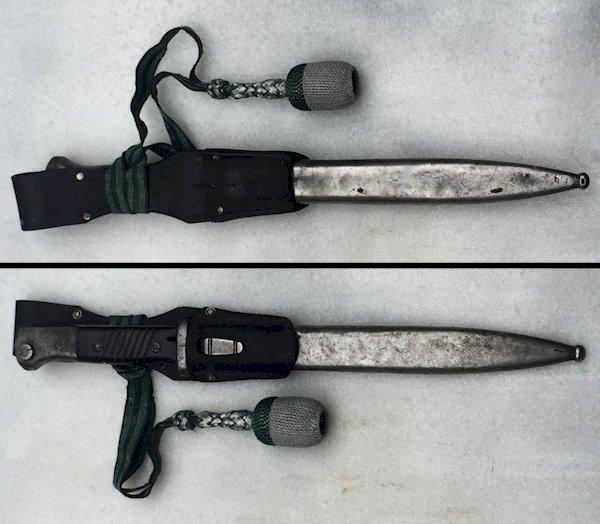Superb Mauser K98 WW2 bayonet (1941) with a scabbard in good condition and leather frog with its beautiful green fabric and silver thread, produced by "CARL EICKHORN". Marked at the heel: "C l C 44" and "9006", scabbard marked: "F0074". Wooden grip and scabbard in blued steel, remnants of bluing on the blade in good condition, piece as found. A very beautiful and rare piece, perfect for discerning collectors!