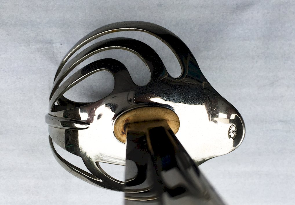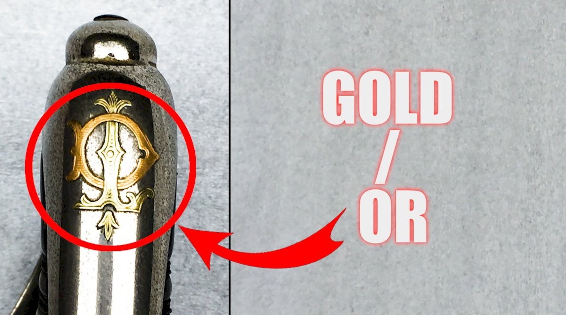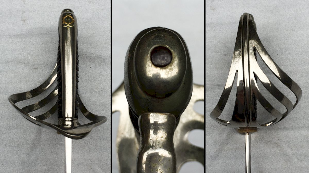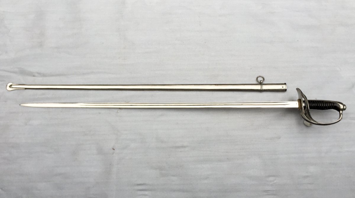 Very beautiful French officer's saber. Five-branched guard, engraved ''in gold'' with the officer's monogram at the top ''I C'', watermarked, no play. Superb blade with a central groove, marked on the heel ''P.B.'' and on the guard '' PETIT FILS & BAILHACHE '', in superb condition, still shiny. Scabbard in its original state with one ring, also in good condition. Superb and very rare French saber, very pleasant to hold in the hands and even more pleasant to observe in the window! ! ! VERY RARE AND 100% ORIGINAL! ! !
